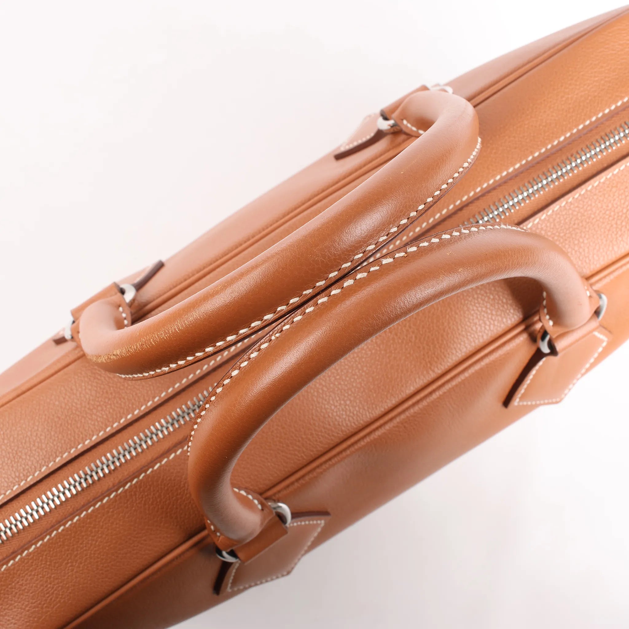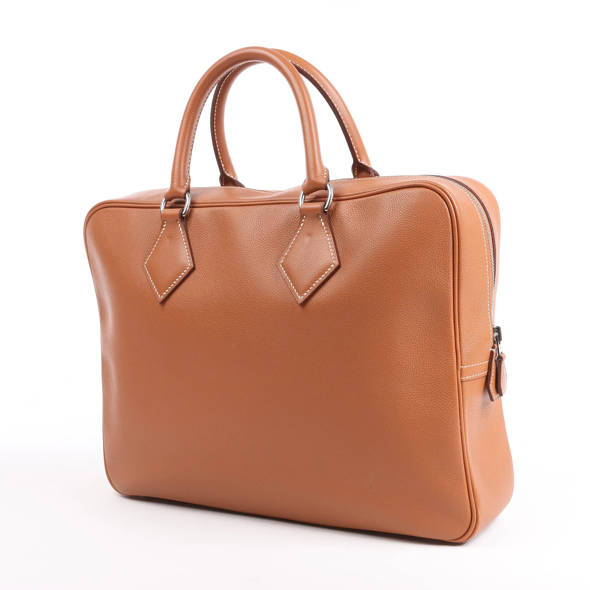 The HERMÈS Plume 40 Handbag in Gold Evercolor leather (Z: 2021) is a timeless piece of elegance. Featuring refined silver-tone hardware and precise white contrast stitching, it’s perfect for sophisticated daily use or travel in classic luxury.