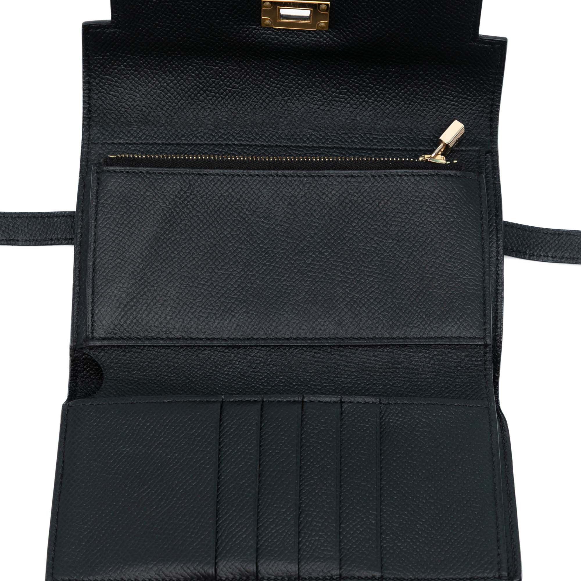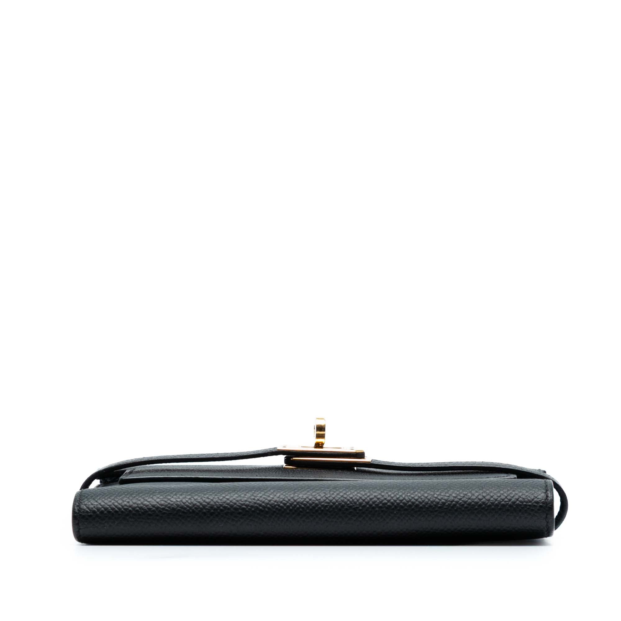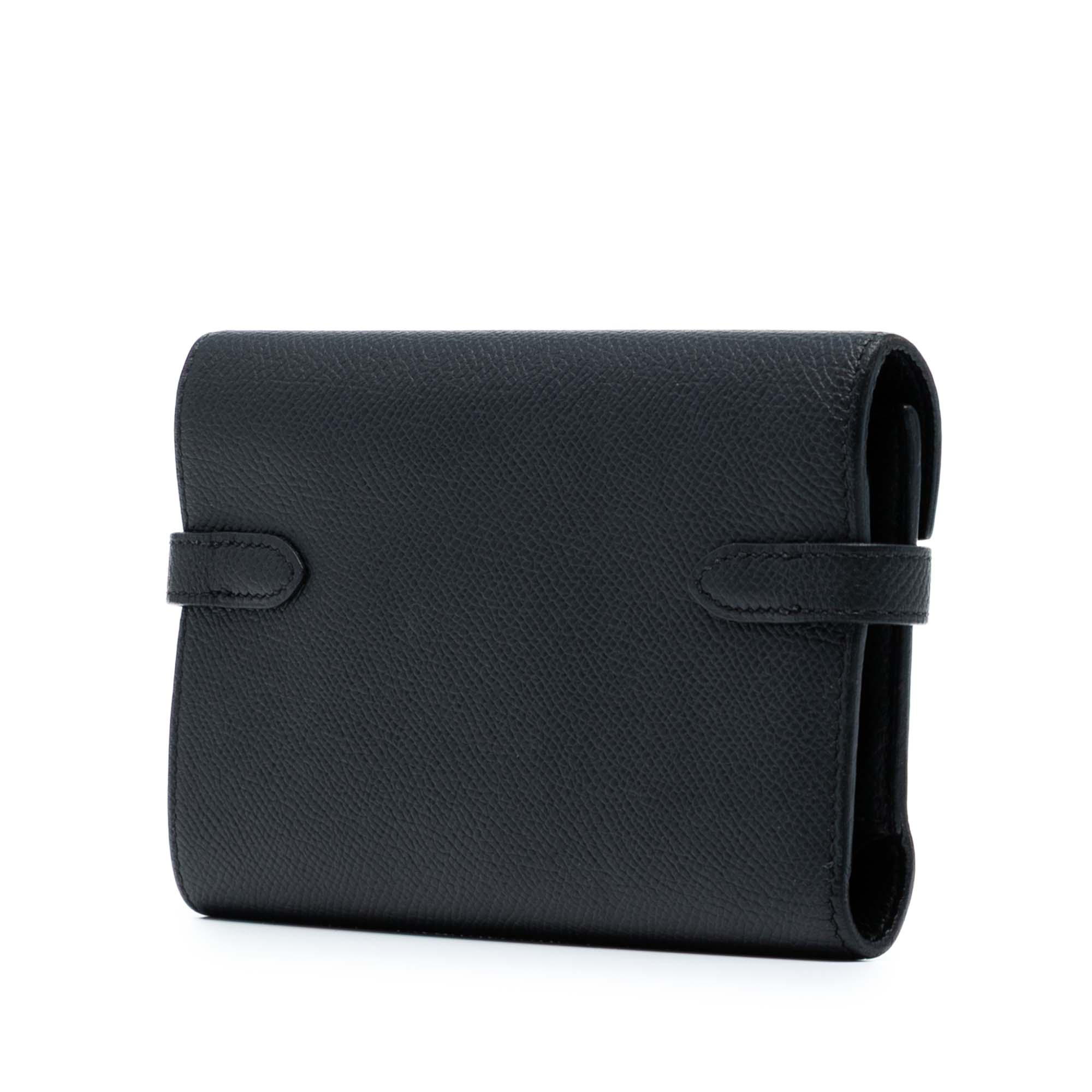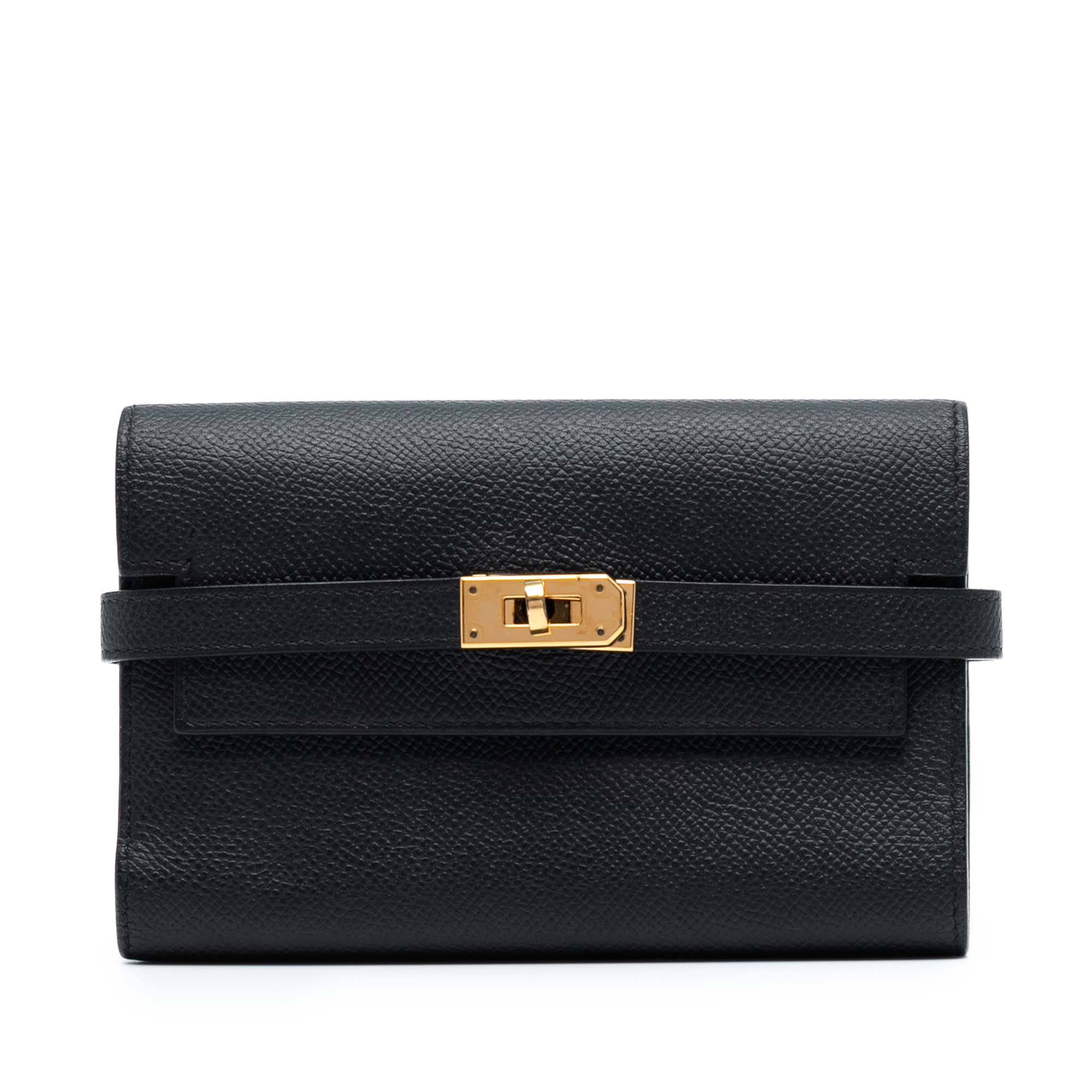 The Kelly wallet features an Epsom leather body, a front flap strap with turn lock closure, and interior zip and slip pockets. Retail Price: 3700.00