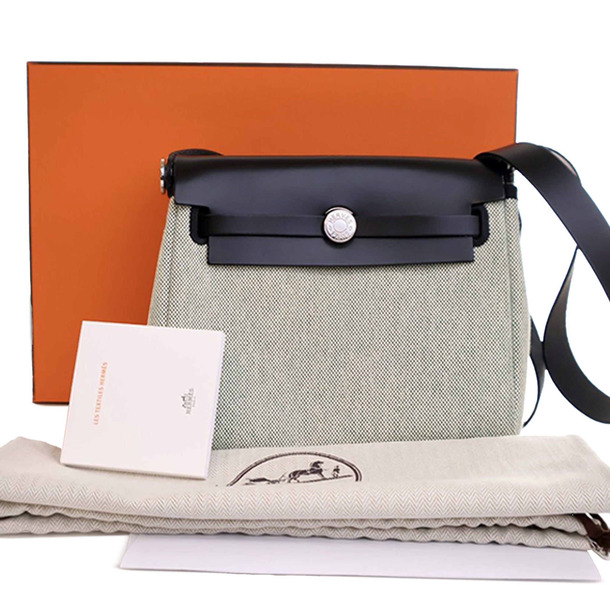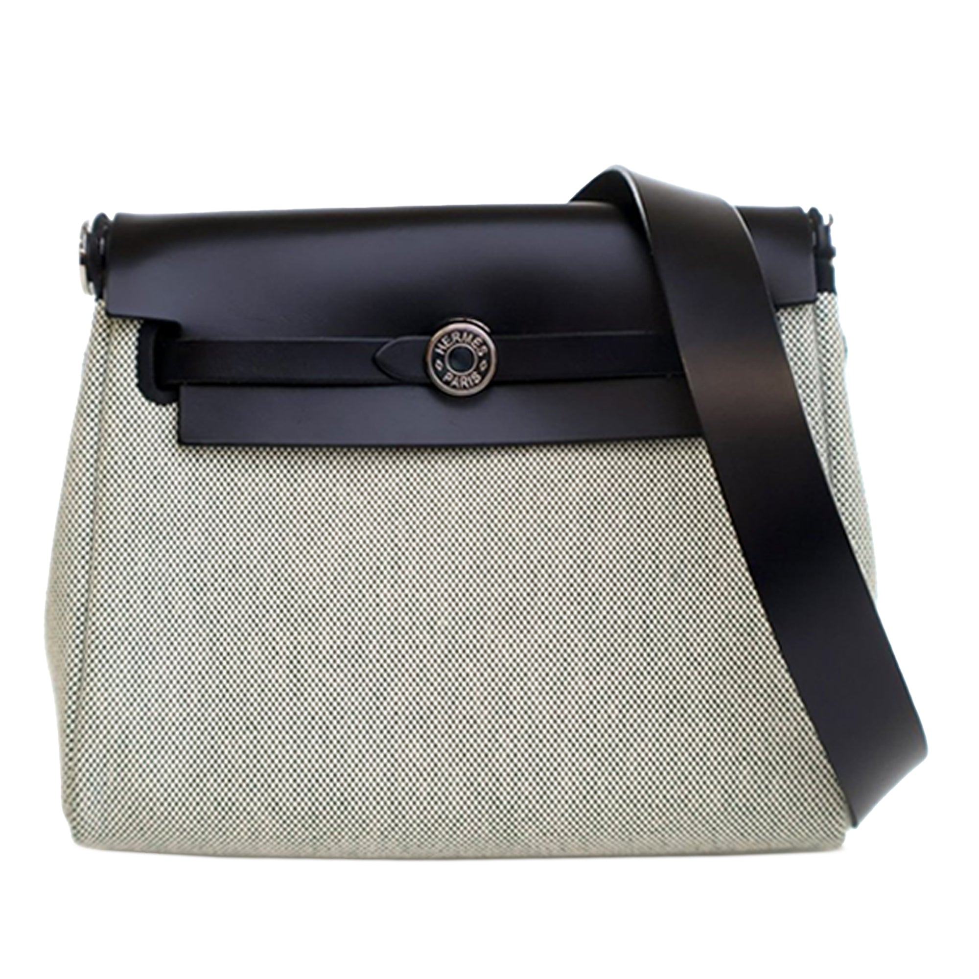 The Herbag features a canvas body, a leather shoulder strap, a top flap with a pull through strap closure, and an exterior back zip pocket. Inclusion: Dust bag, box. Retail Price: 6695.00
