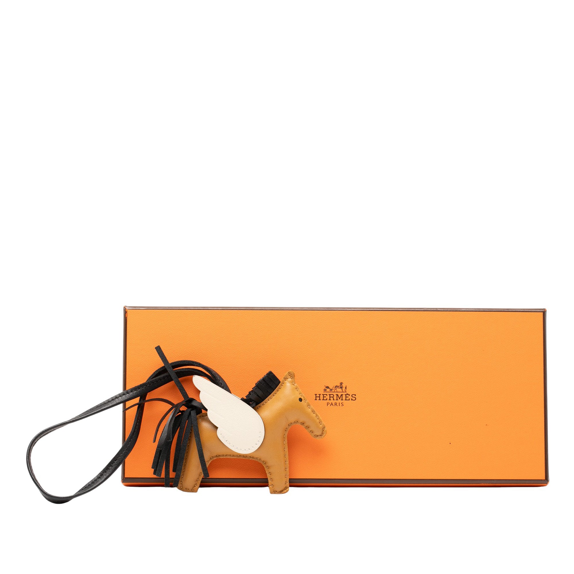 This Rodeo Pegase bag charm features a Milo lambskin and Swift leather body in Sesame, Noir, and Nata colors, and a flat leather strap. Inclusion: box. Retail Price: 1125.00