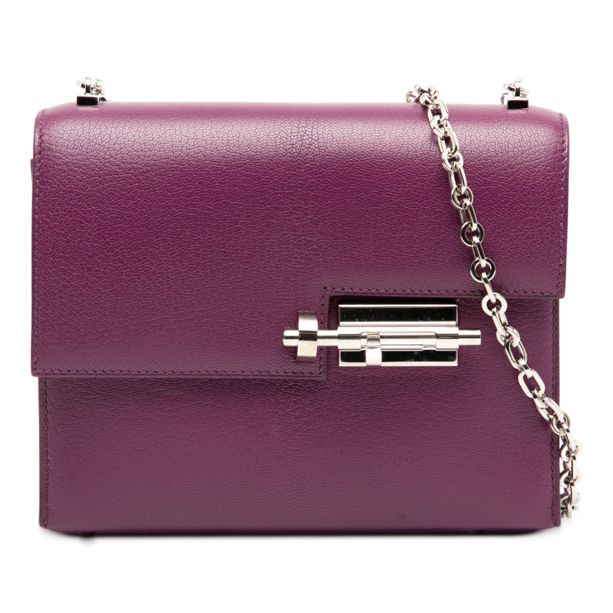 This Mini Verrou Chaine bag features a Chevre Mysore body in Anemone color, a chain-link strap, a front flap with push lock closure, an exterior slip pocket, and interior slip pockets. Inclusion: Dust bag, box. Retail Price: 8000.00