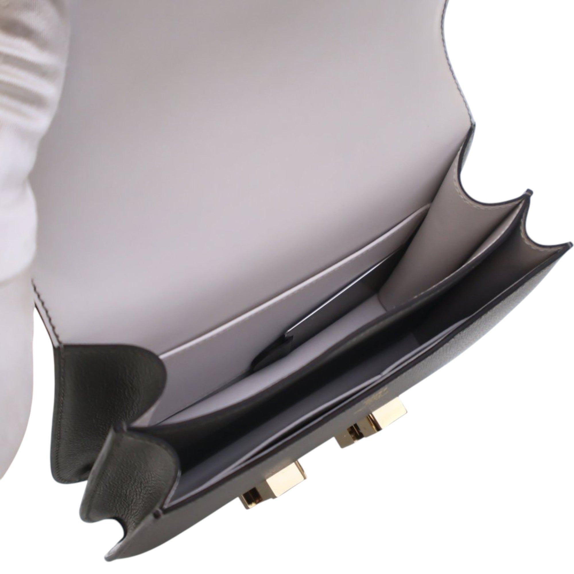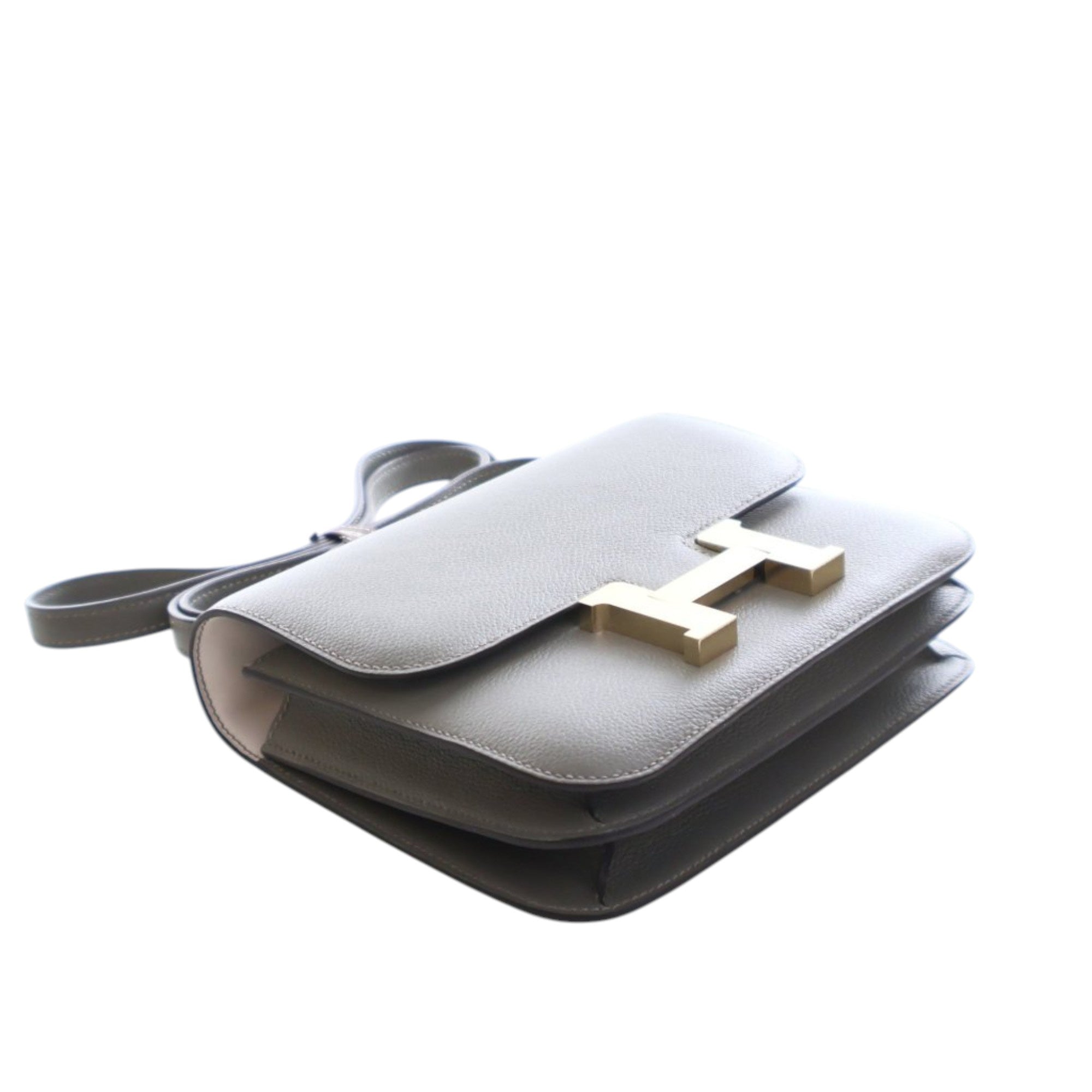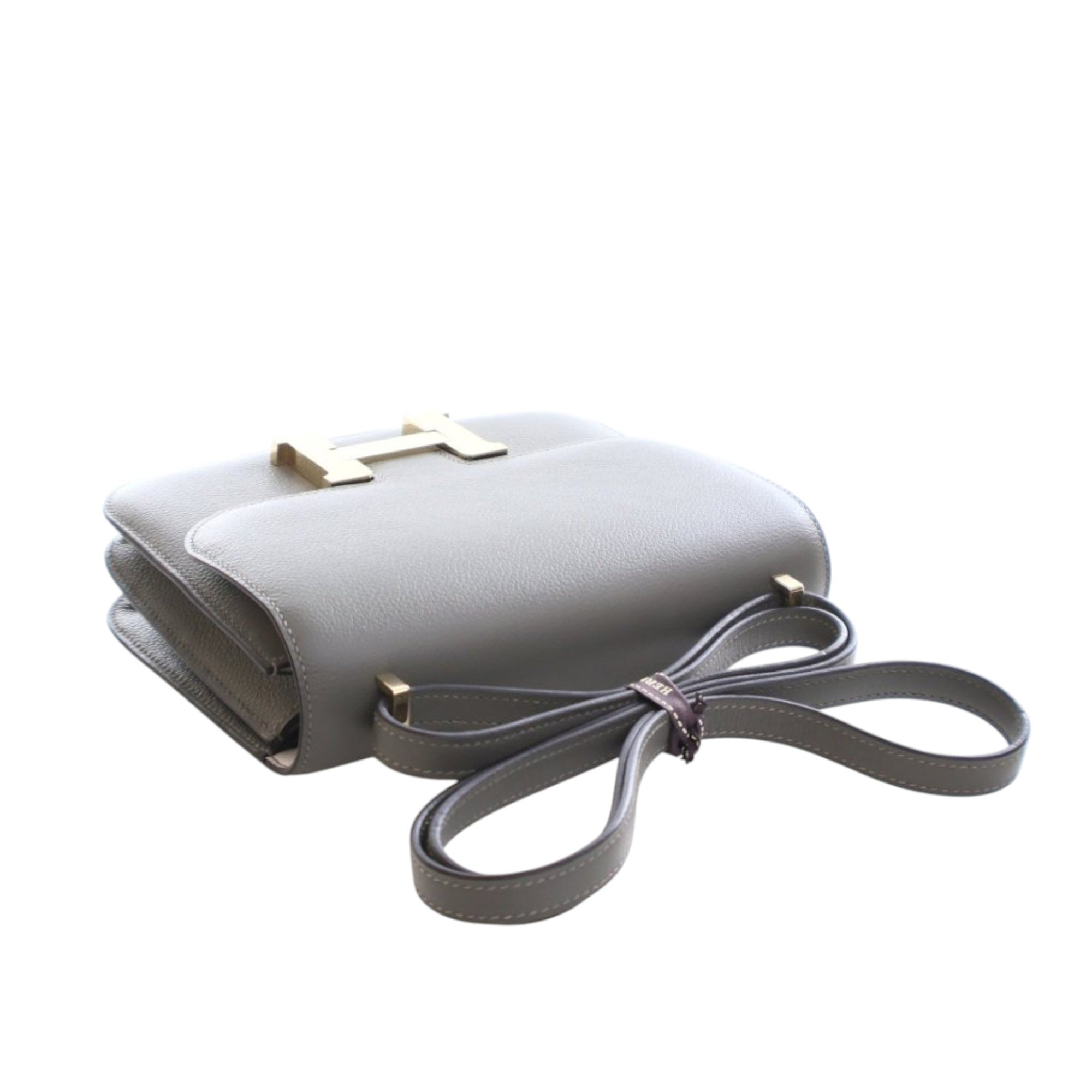 This Mini Constance features an Evercolor leather body in Gris Meyer, a leather interior in Gris Pale color, an adjustable flat leather shoulder strap, a front flap with clasp closure, and interior slip pockets. Inclusion: Dust bag, box. Retail Price: 18000.00