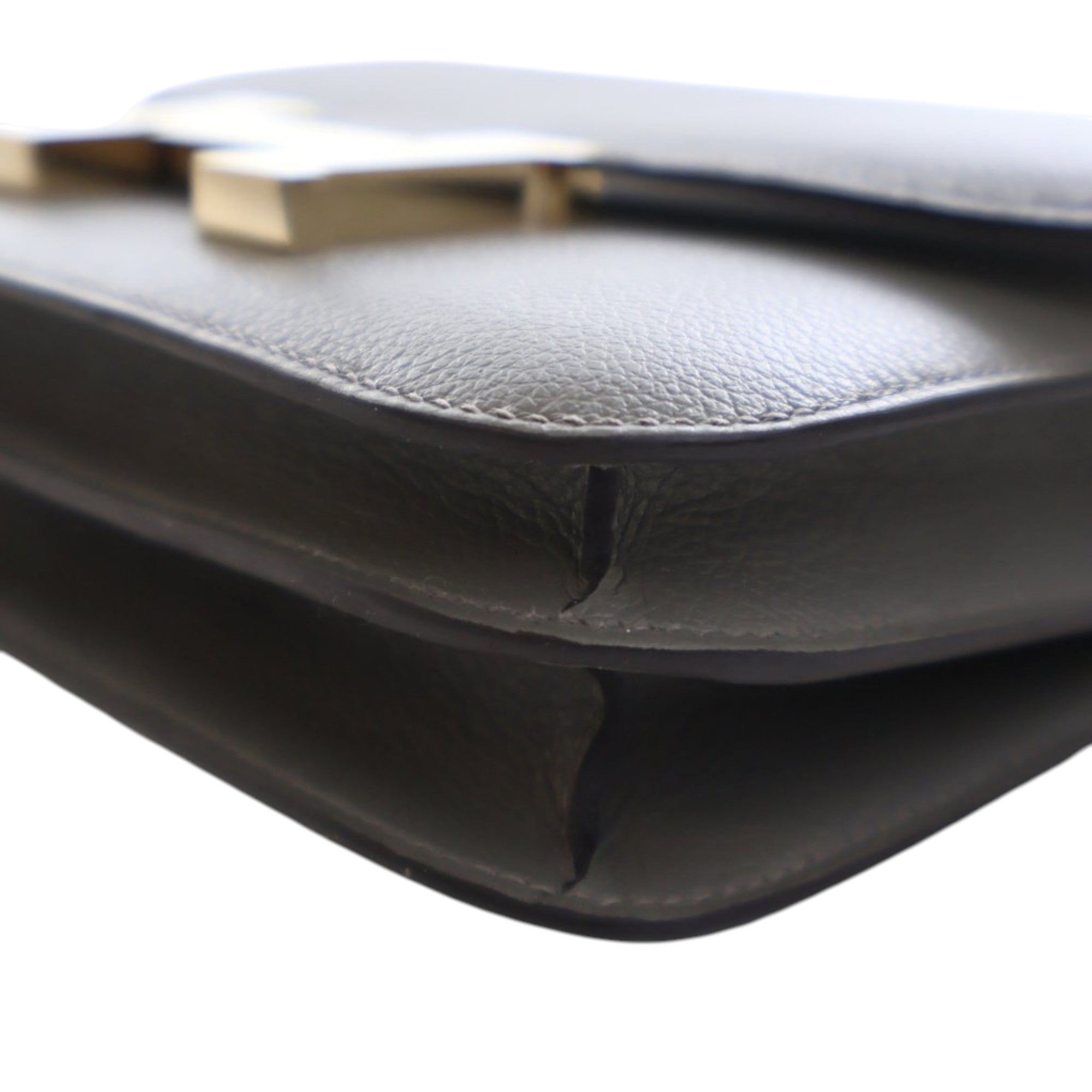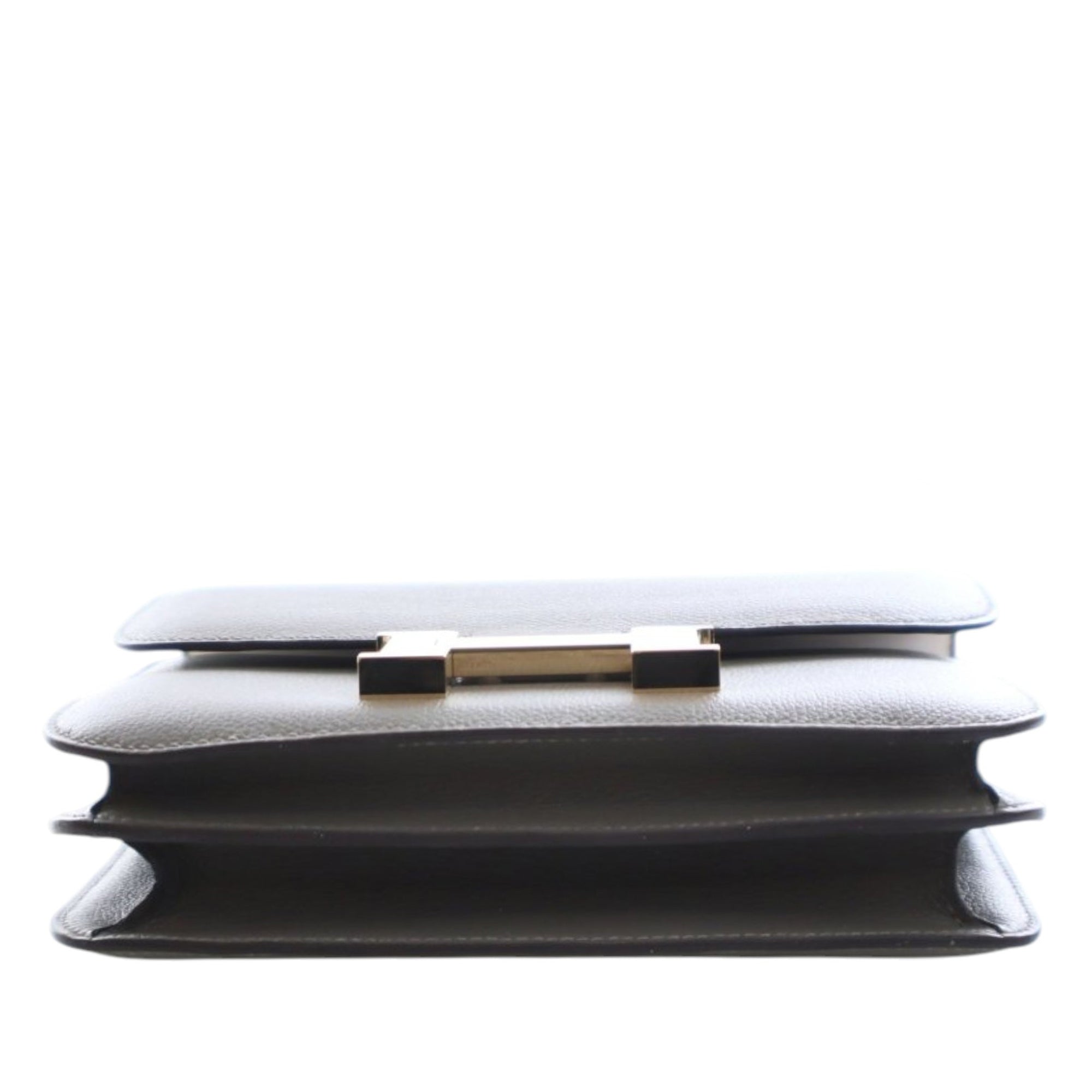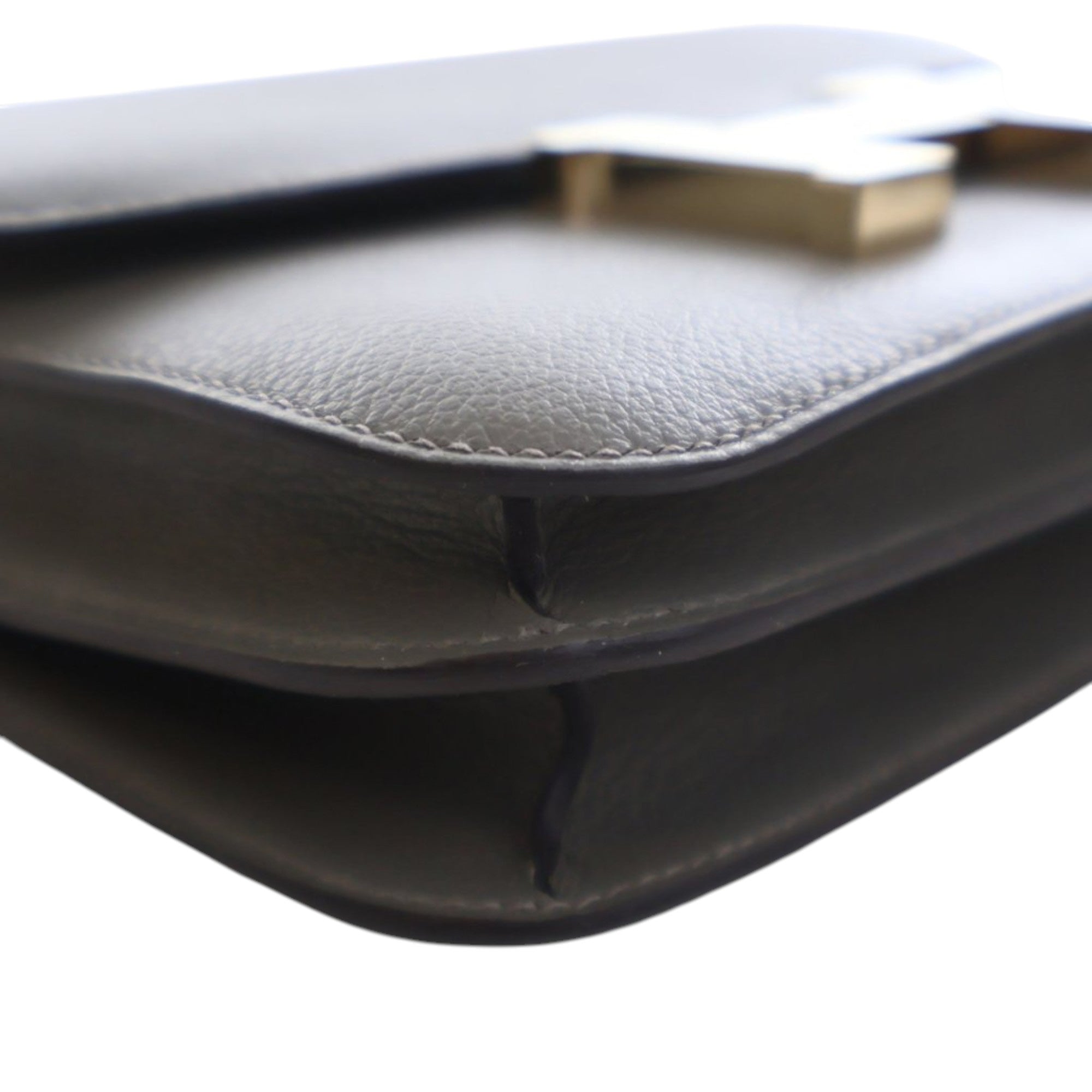 This Mini Constance features an Evercolor leather body in Gris Meyer, a leather interior in Gris Pale color, an adjustable flat leather shoulder strap, a front flap with clasp closure, and interior slip pockets. Inclusion: Dust bag, box. Retail Price: 18000.00