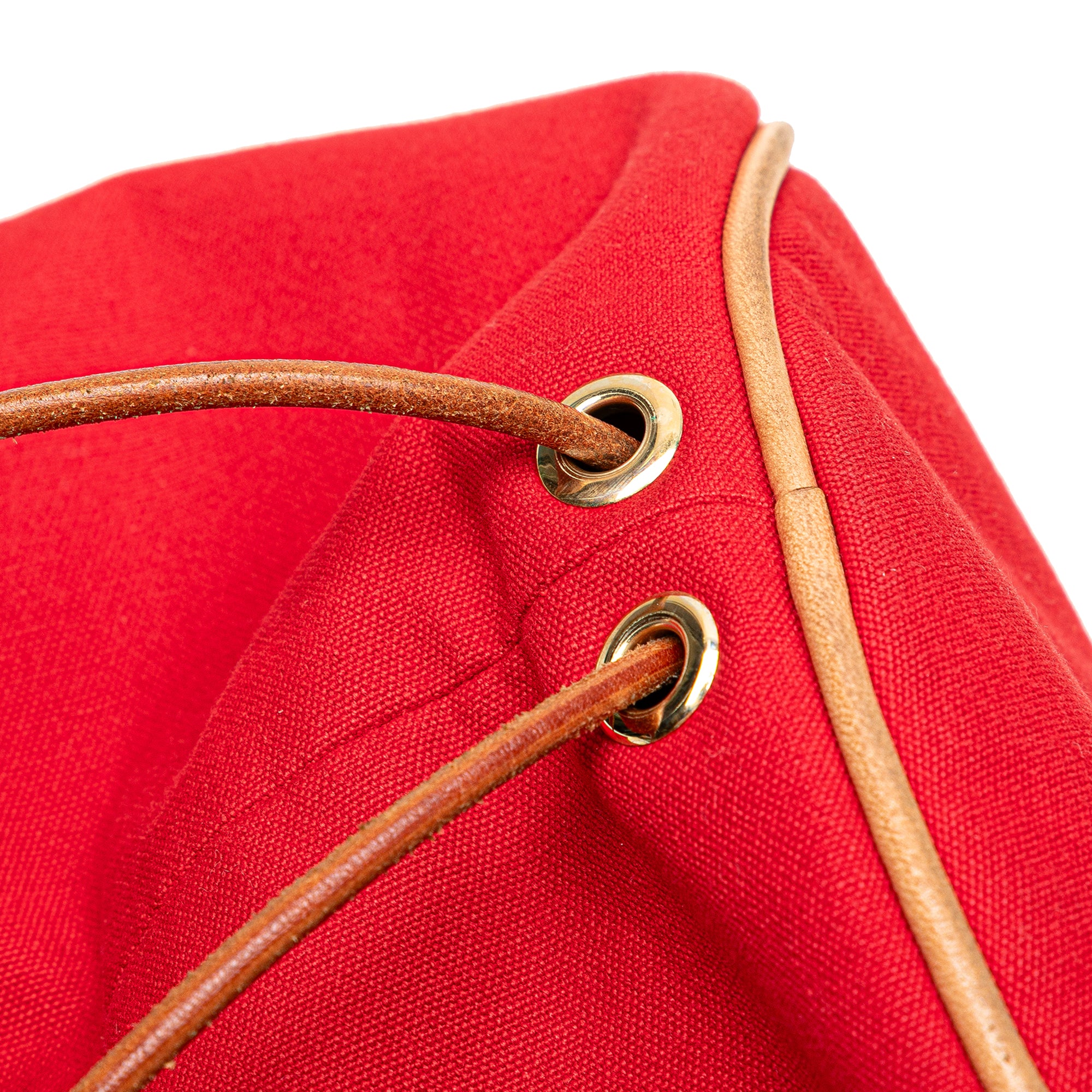 The Polochon Mimile features a canvas body, rolled leather back straps, and an open top with a drawstring closure. Retail Price: 880.00