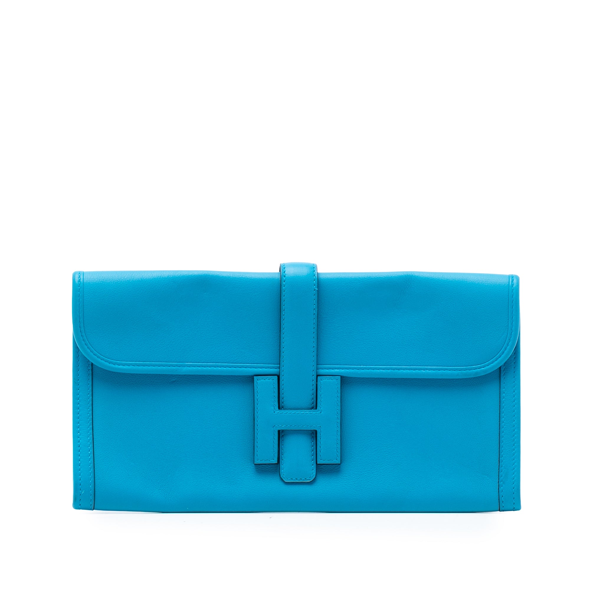 This Jige Elan 29 features a Swift leather body in Bleu Zanzibar color, and a front flap with a pull-through closure. Retail Price: 3700.00