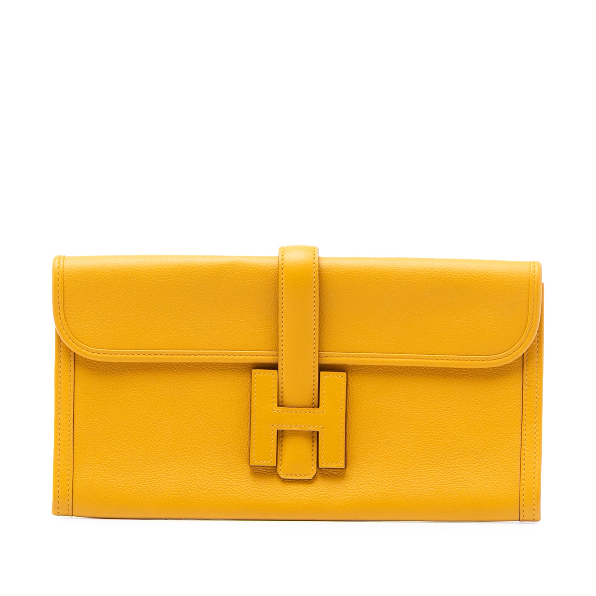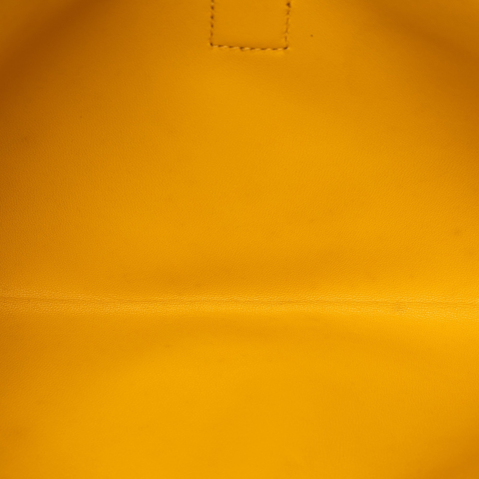 This Jige Elan 29 features a Swift leather body in Jaune D'Or color, and a front flap with a pull-through closure. Retail Price: 3675.00