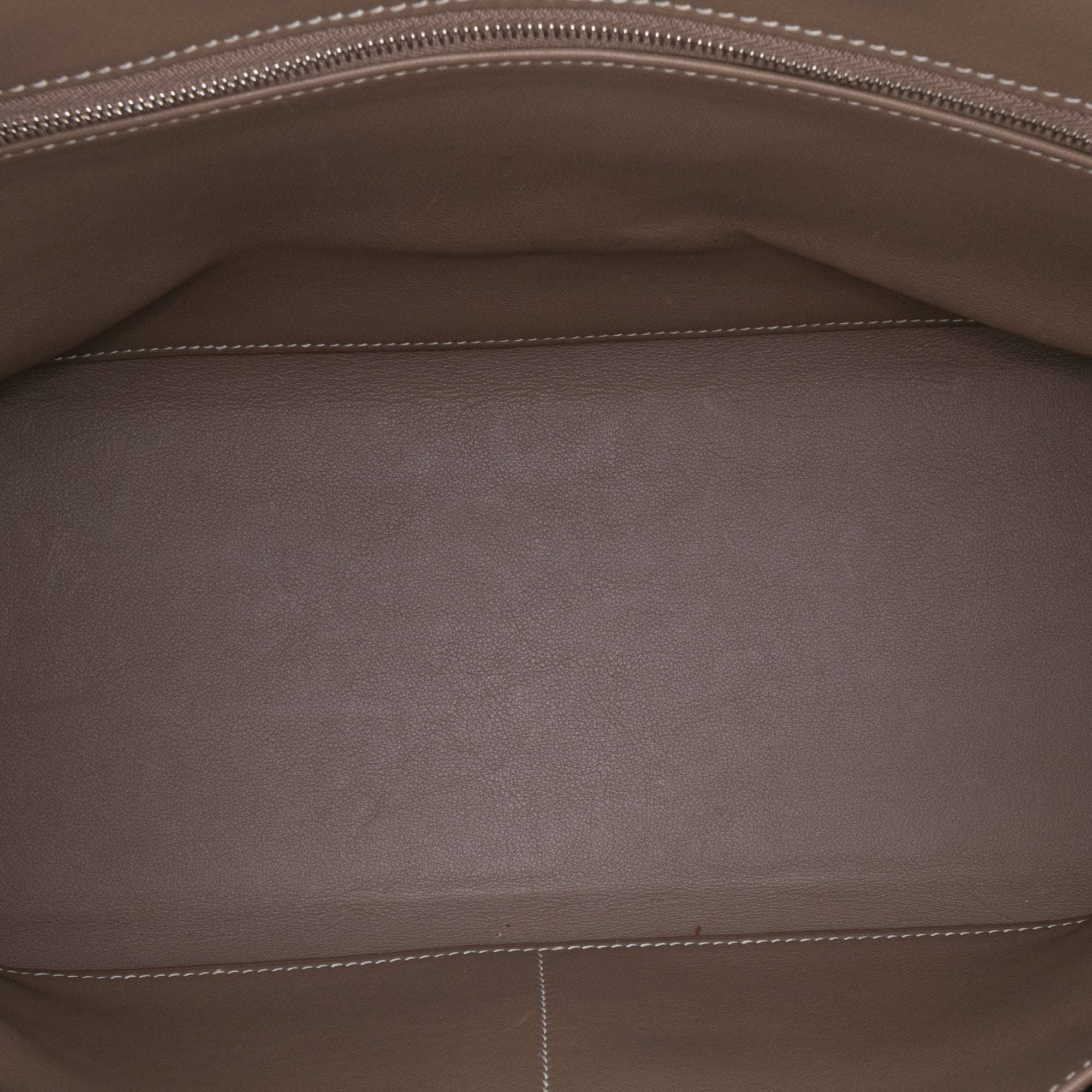 This Kelly 35 features a Swift leather body in Etoupe color, a flat leather top handle, a detachable flat leather shoulder strap, a front flap with twist lock closure, and interior zip and slip pockets. Retail Price: 12000.00