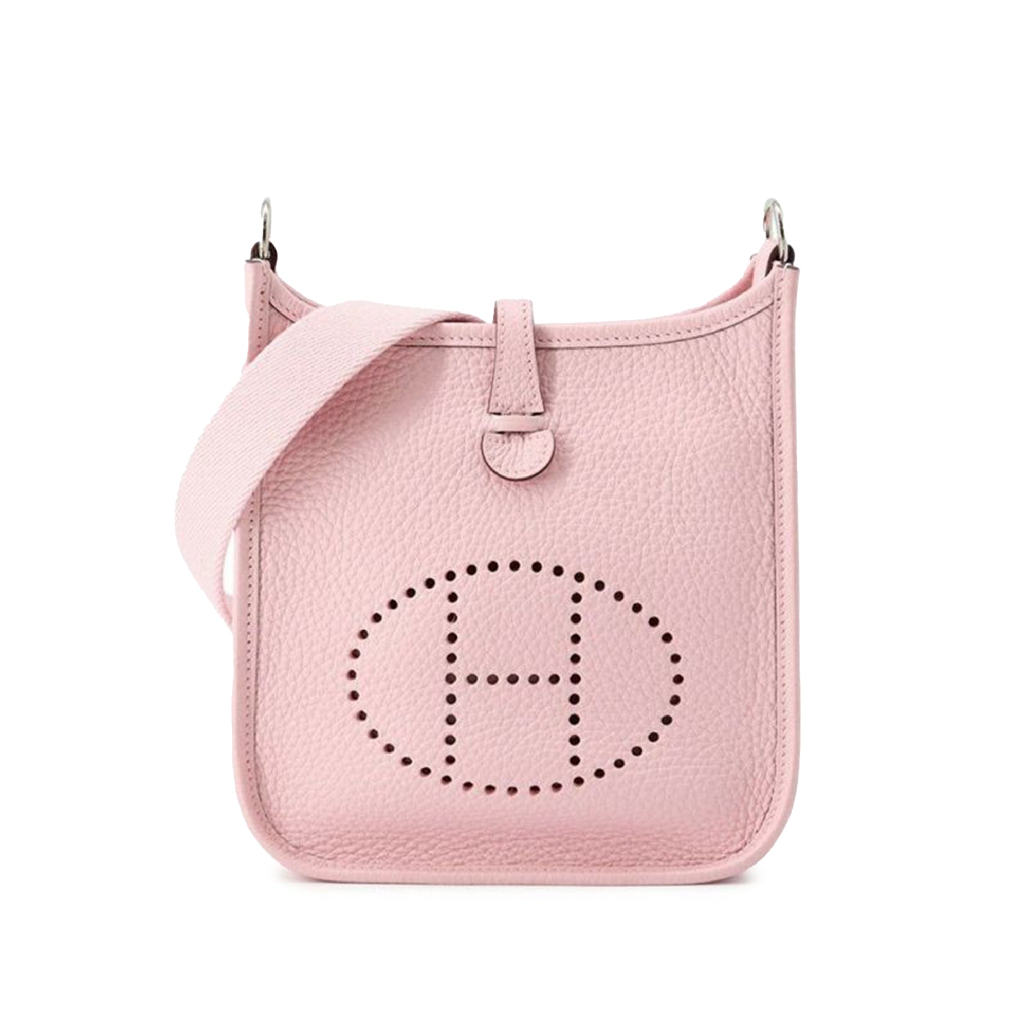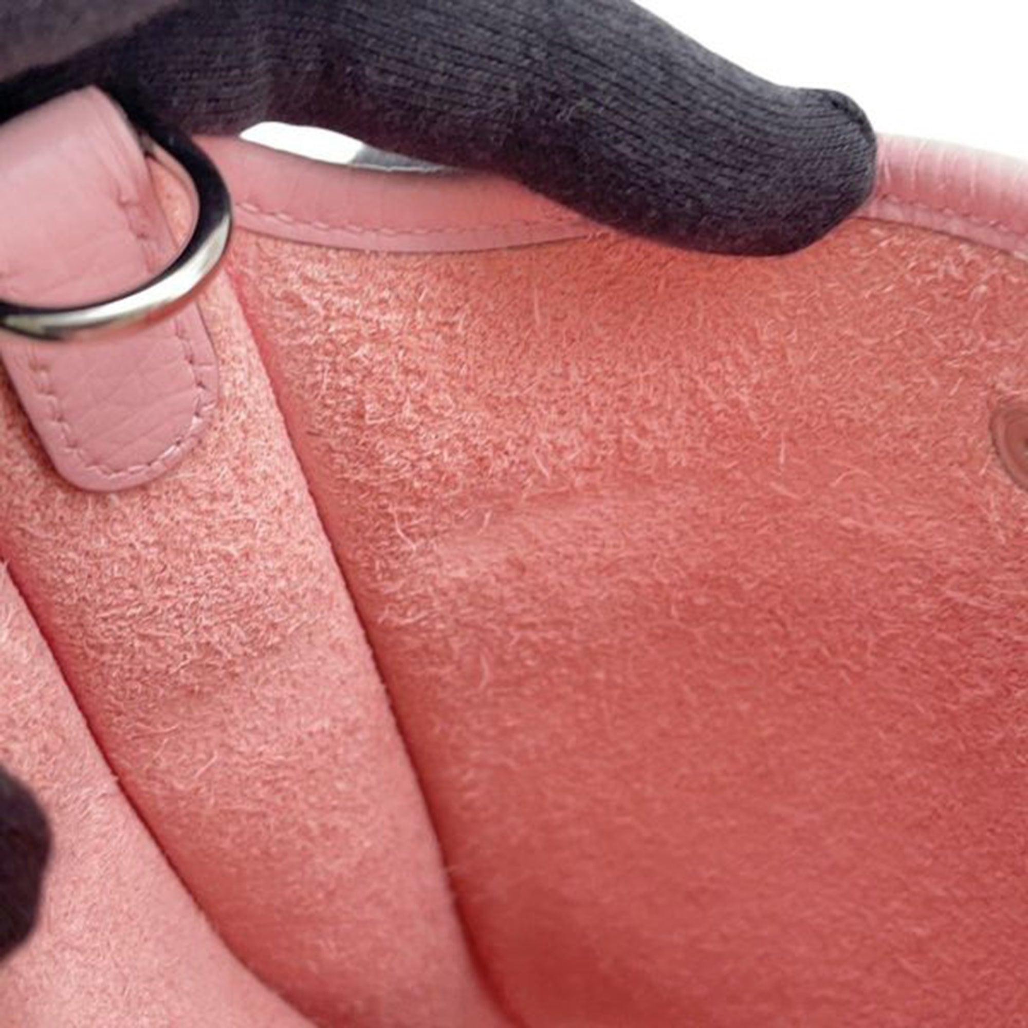 This Evelyne TPM features a Clemence leather body in Rose Sakura color, a detachable flat strap, and an open top with a tuck closure. Inclusion: Dust bag, box. Retail Price: 5000.00