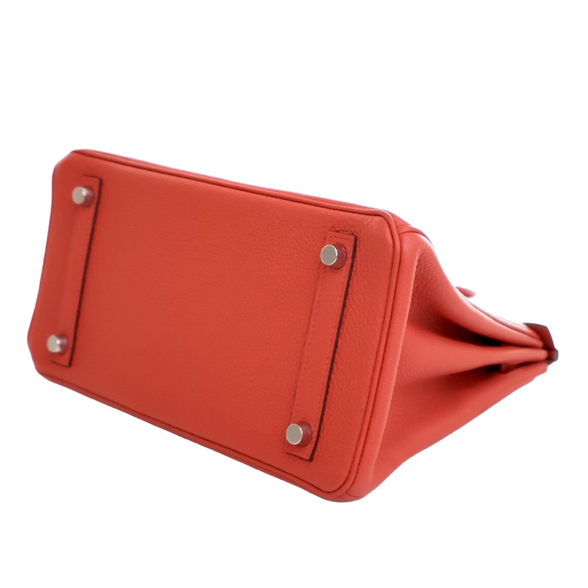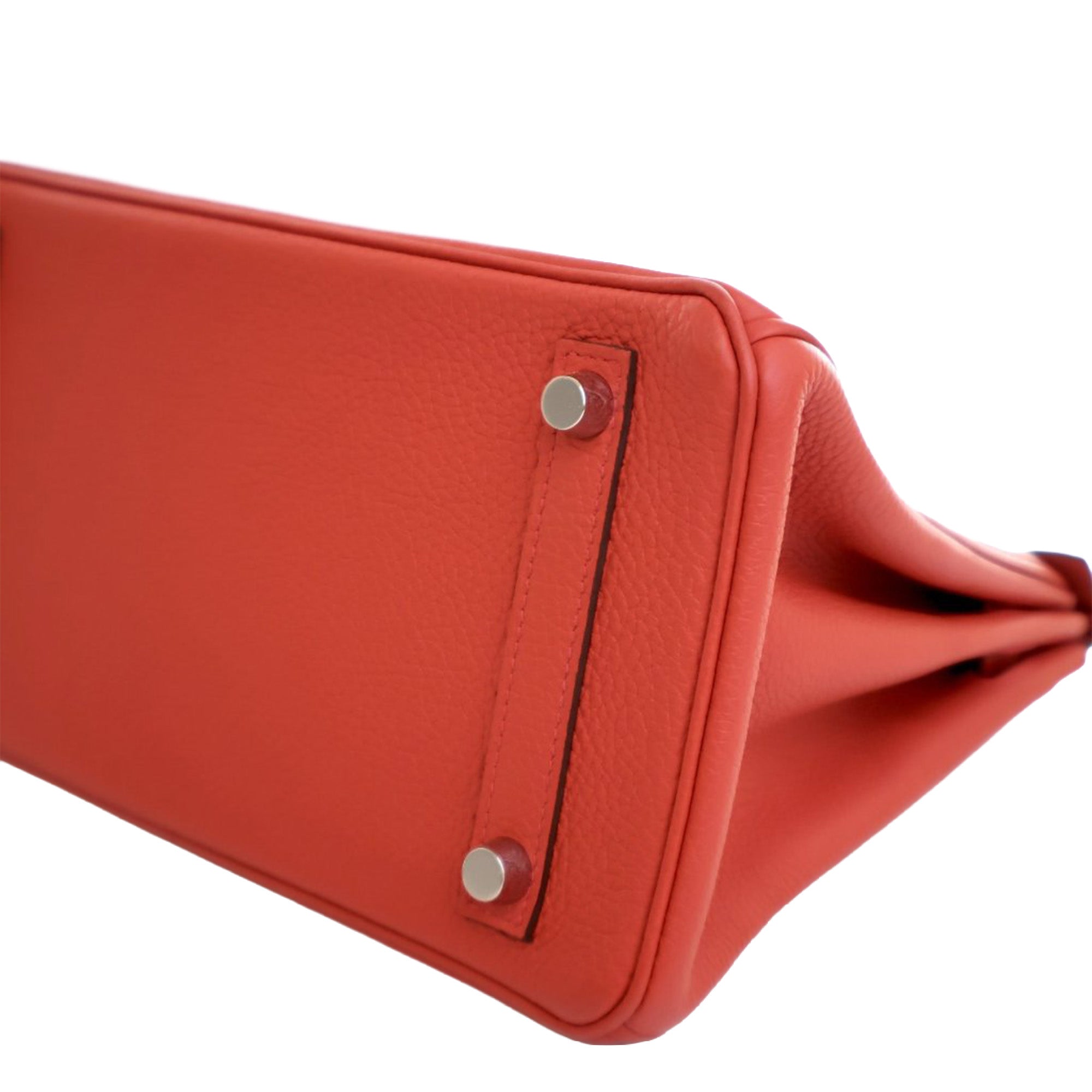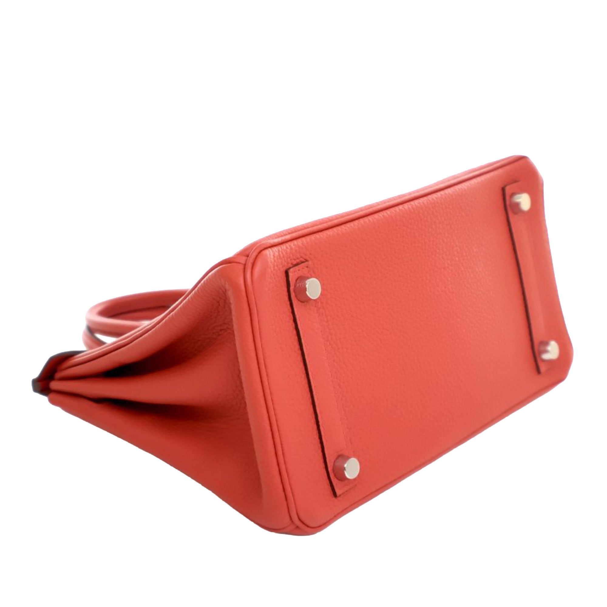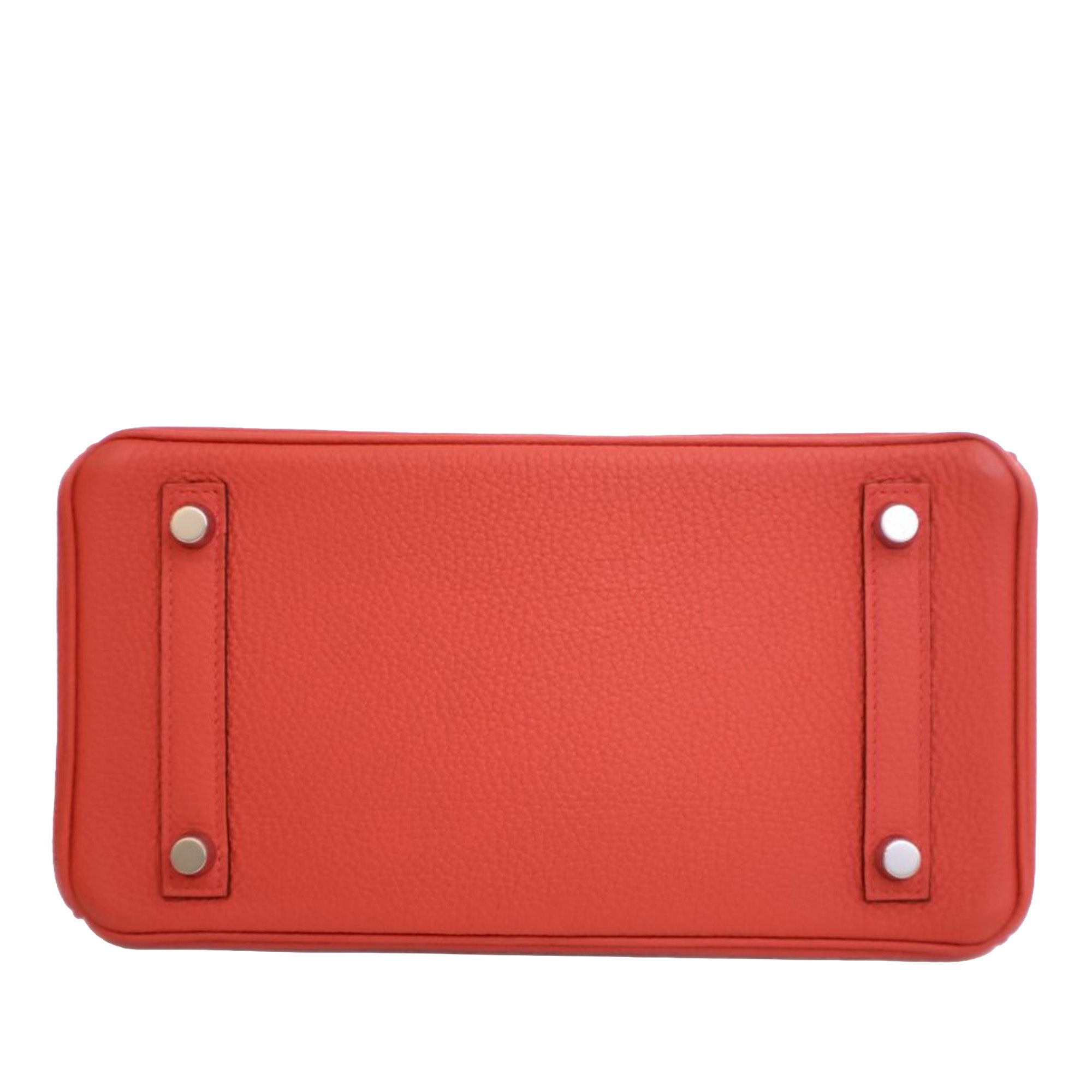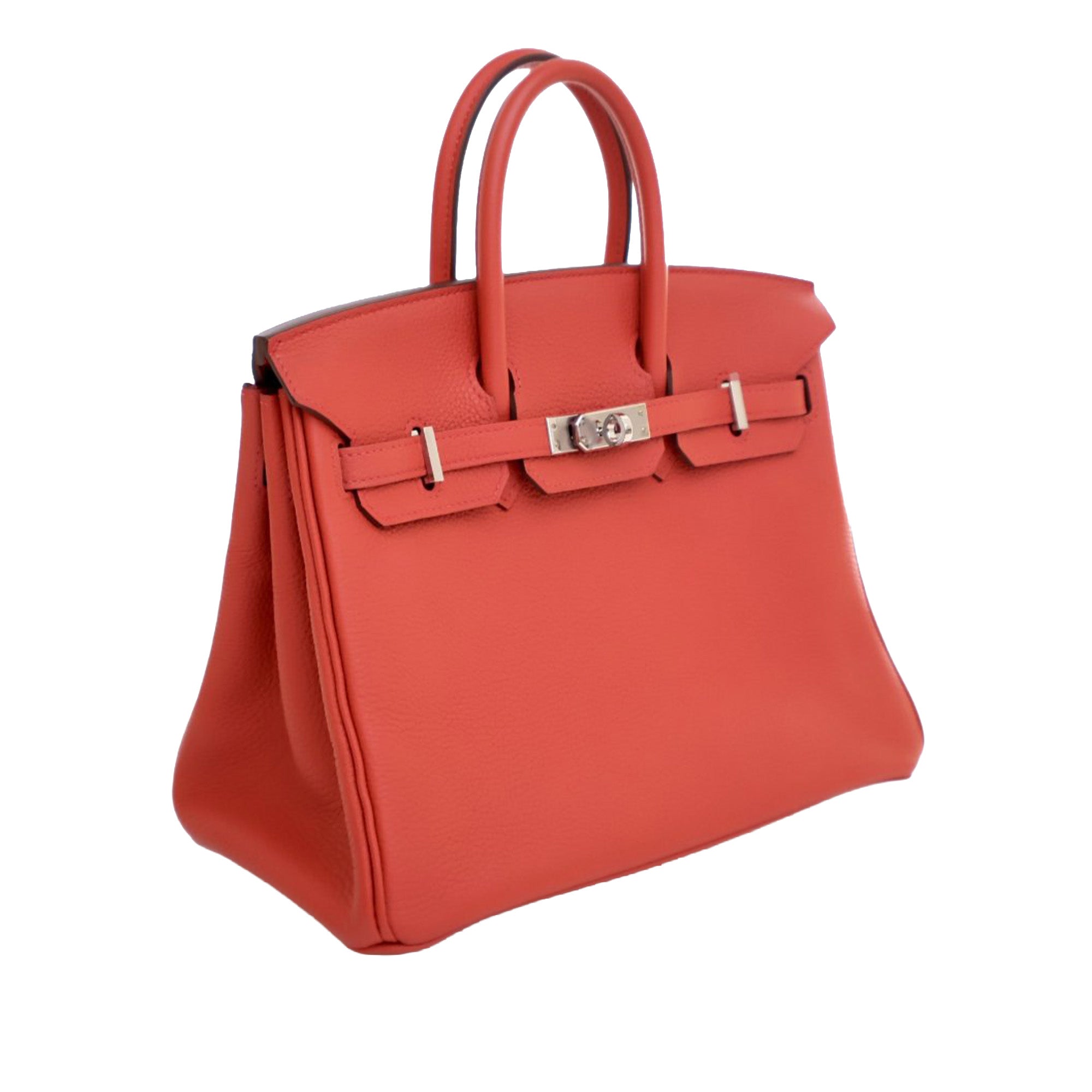 This Birkin 25 features a Togo leather body, rolled leather handles in Rouge Tomate color, a front flap with turn-lock closure, and interior open and zip pockets. Inclusion: Dust bag, box. Retail Price: 27500.00