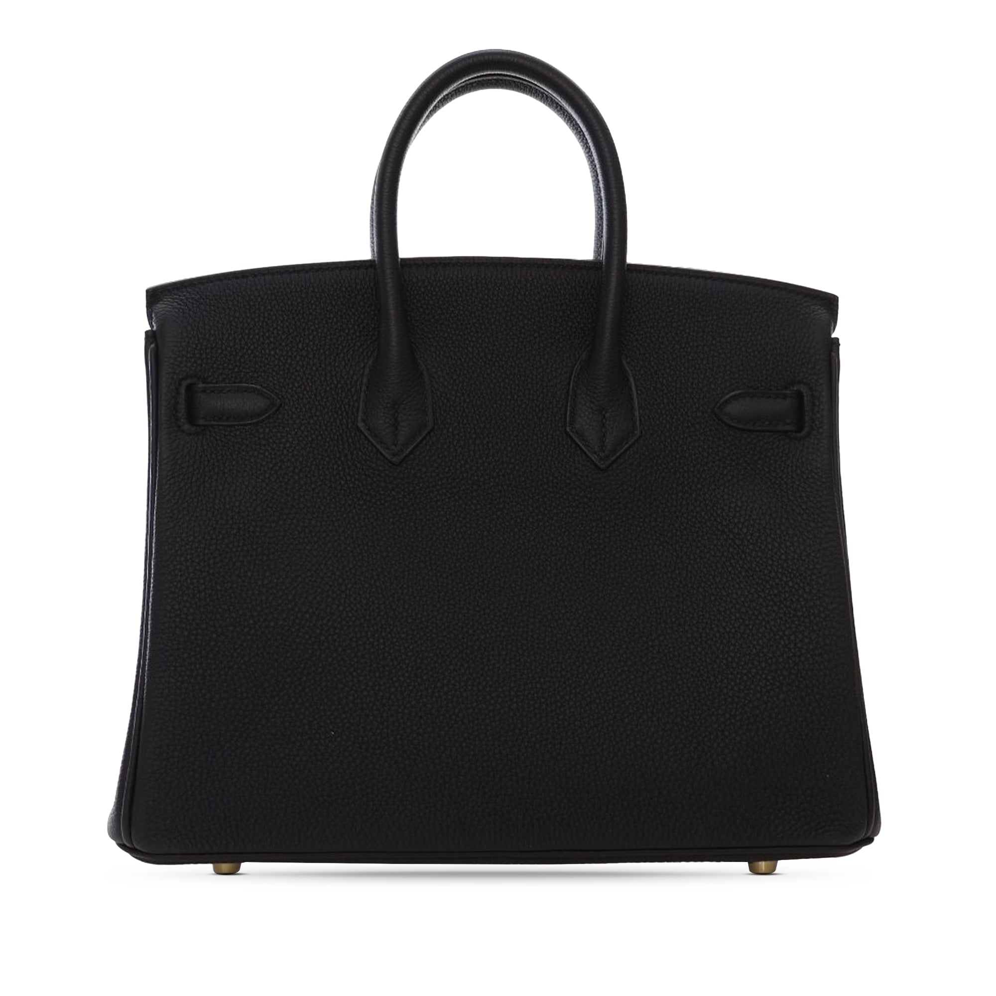 This Birkin 25 features a Togo leather body in Noir color, rolled leather handles, a front flap with turn-lock closure, and interior slip and zip pockets. Inclusion: Dust bag, box. Retail Price: 32500.00