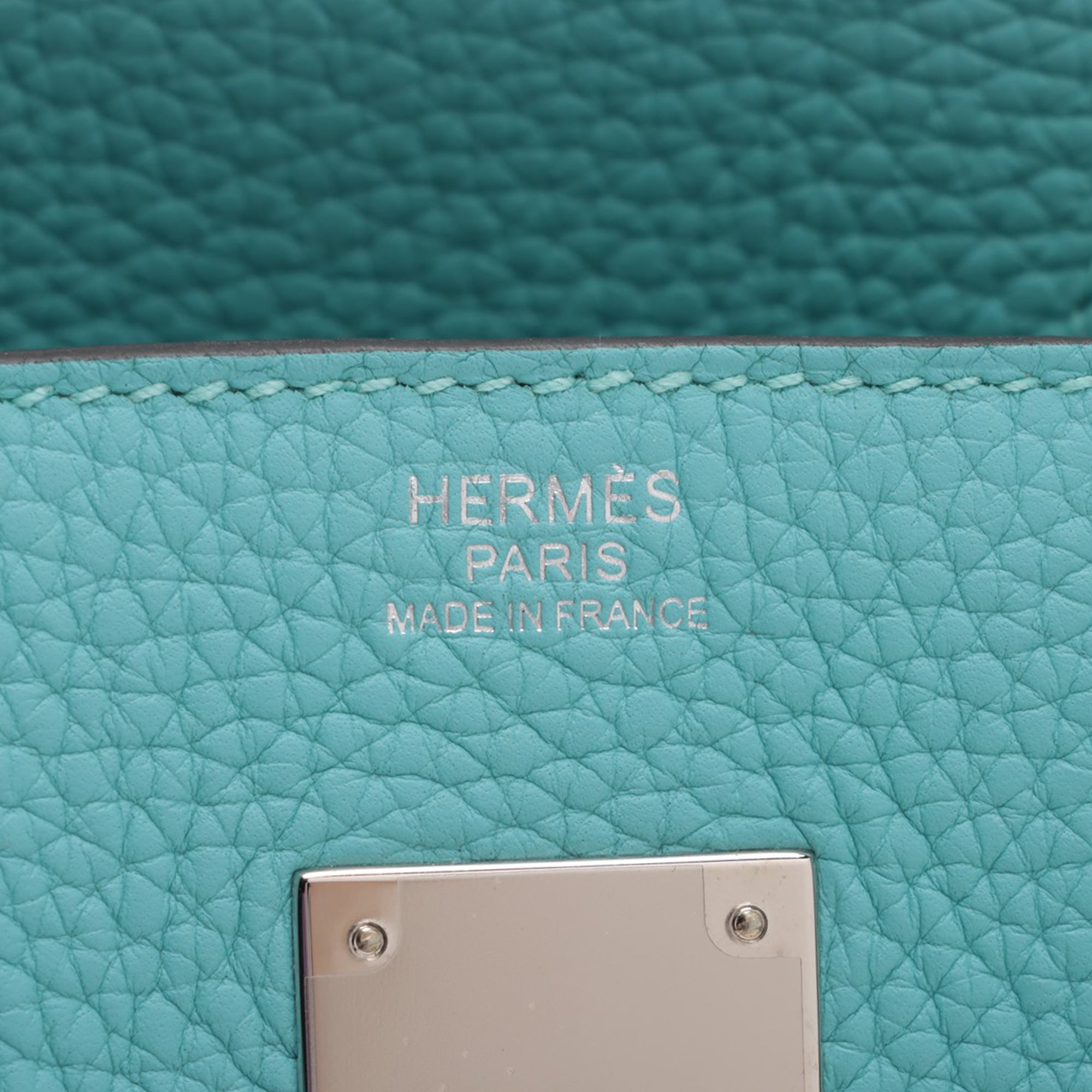 The Birkin 30 features a togo leather body in Blue Atoll color, rolled leather handles, a front flap with a twist lock closure, and interior zip and slip pockets. Retail Price: 29000.00