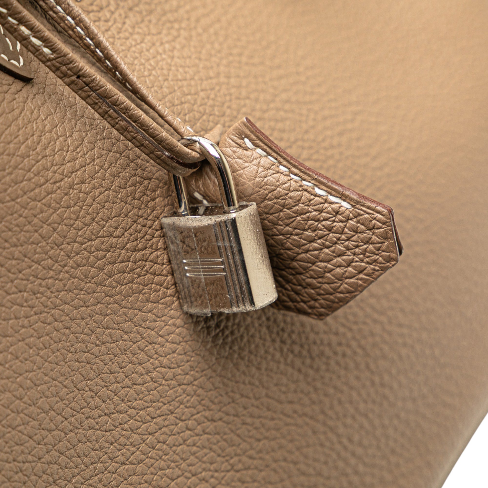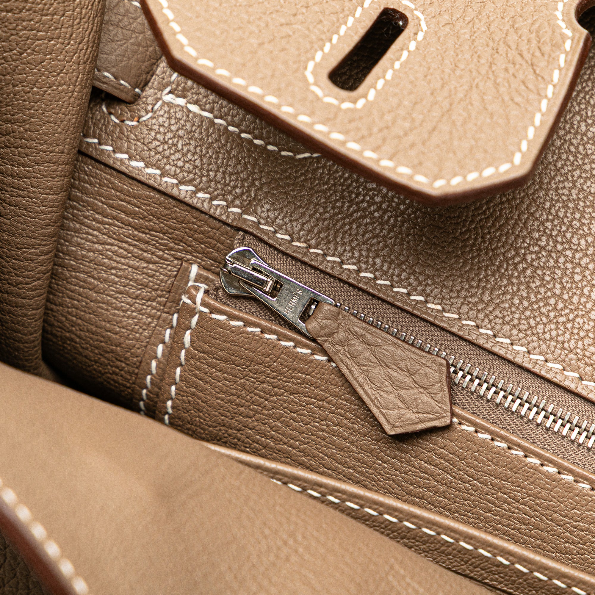 This Birkin 30 features a Togo leather body in Etoupe color, rolled leather handles, a front flap with a metal turn lock closure, and interior zip and slip pockets. Inclusion: Dust bag. Retail Price: 27493.00