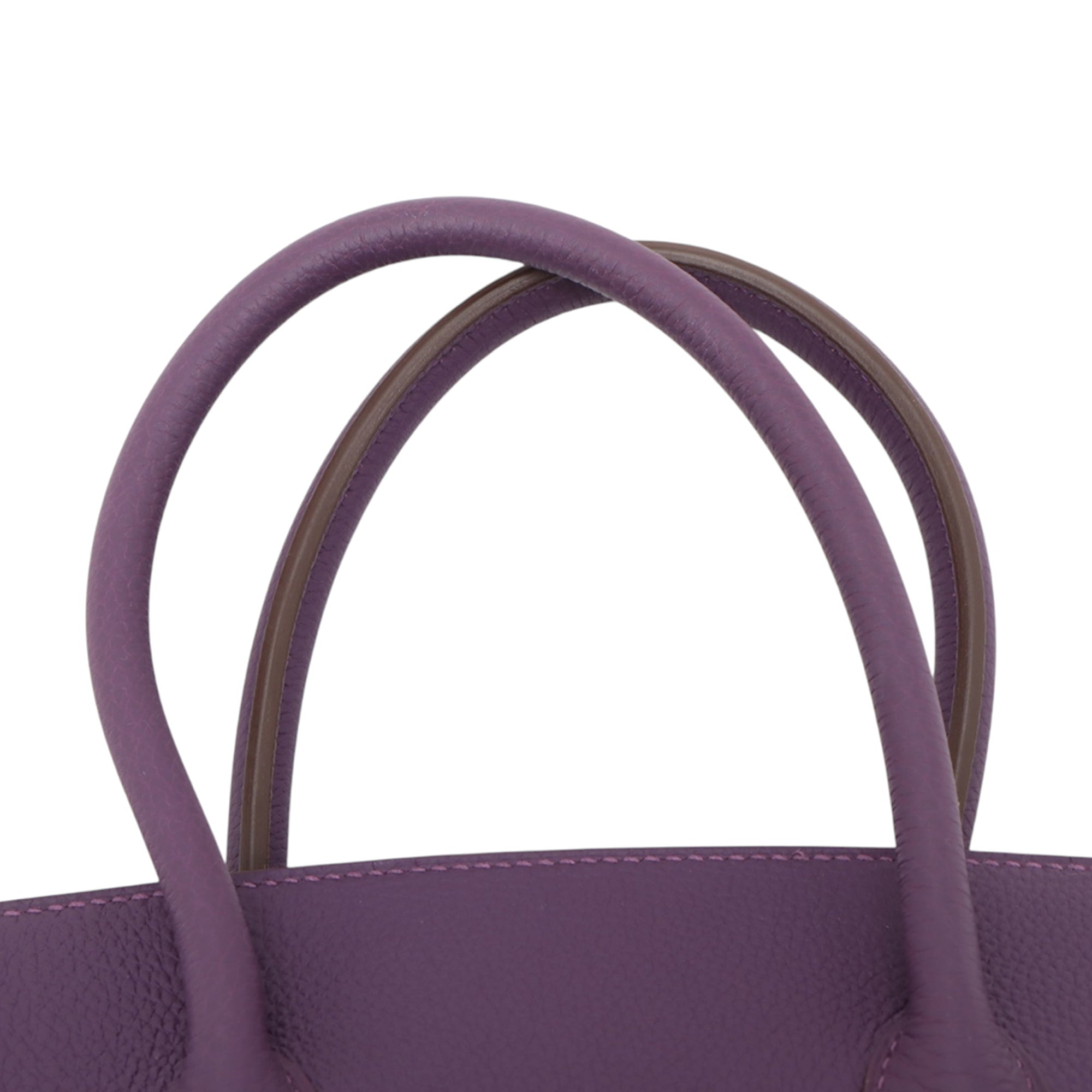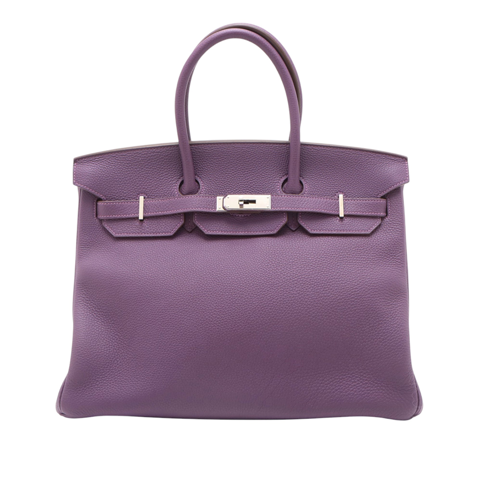 The Birkin 35 features a Togo leather body in Anemone color, rolled leather handles, a front flap with a strap and turn lock closure, and interior zip and slip pockets. Retail Price: 12700.00