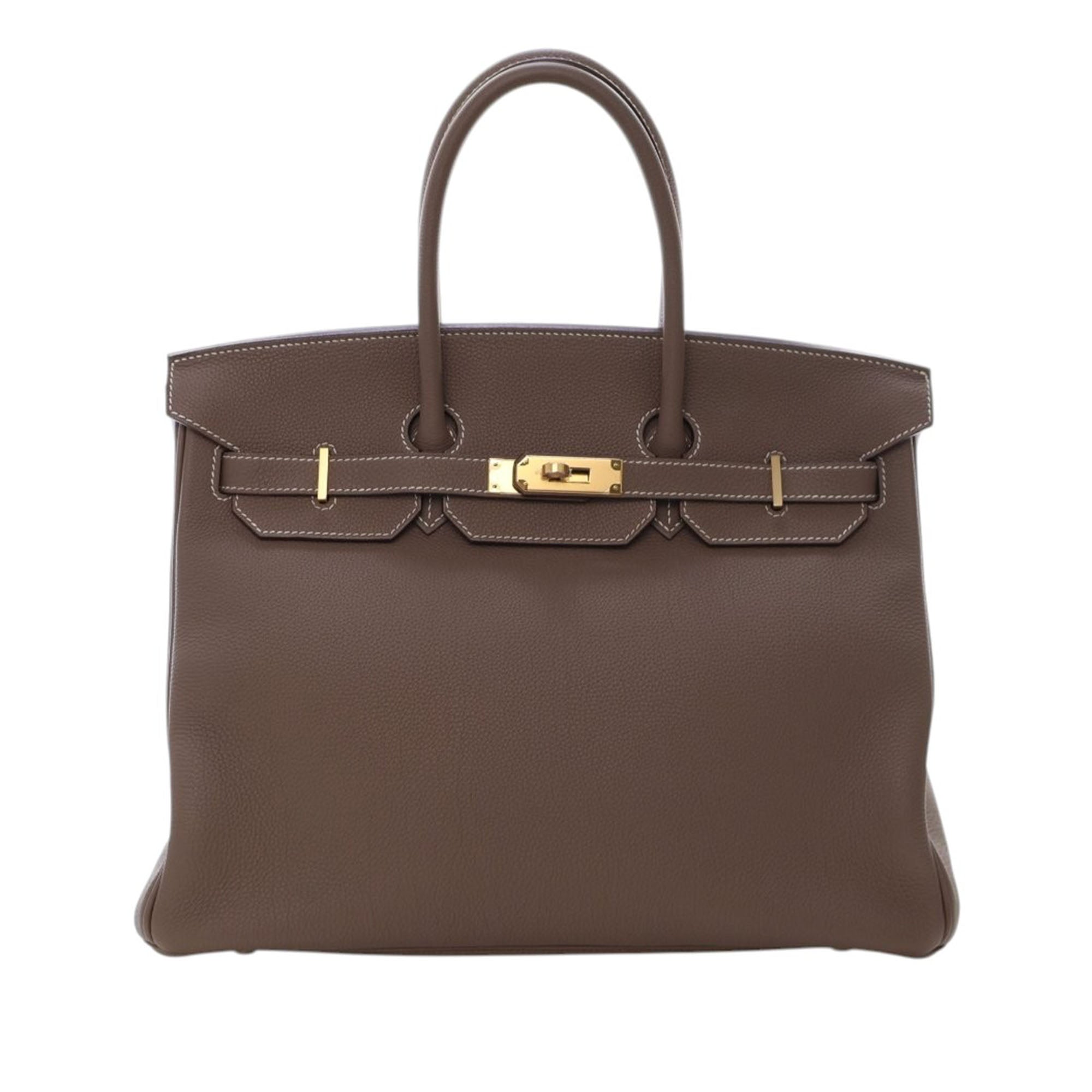 This Birkin 35 features a Togo leather body in Etoupe color, rolled leather handles, a front flap with turn-lock closure, and interior slip and zip pockets. Inclusion: Dust bag. Retail Price: 19700.00