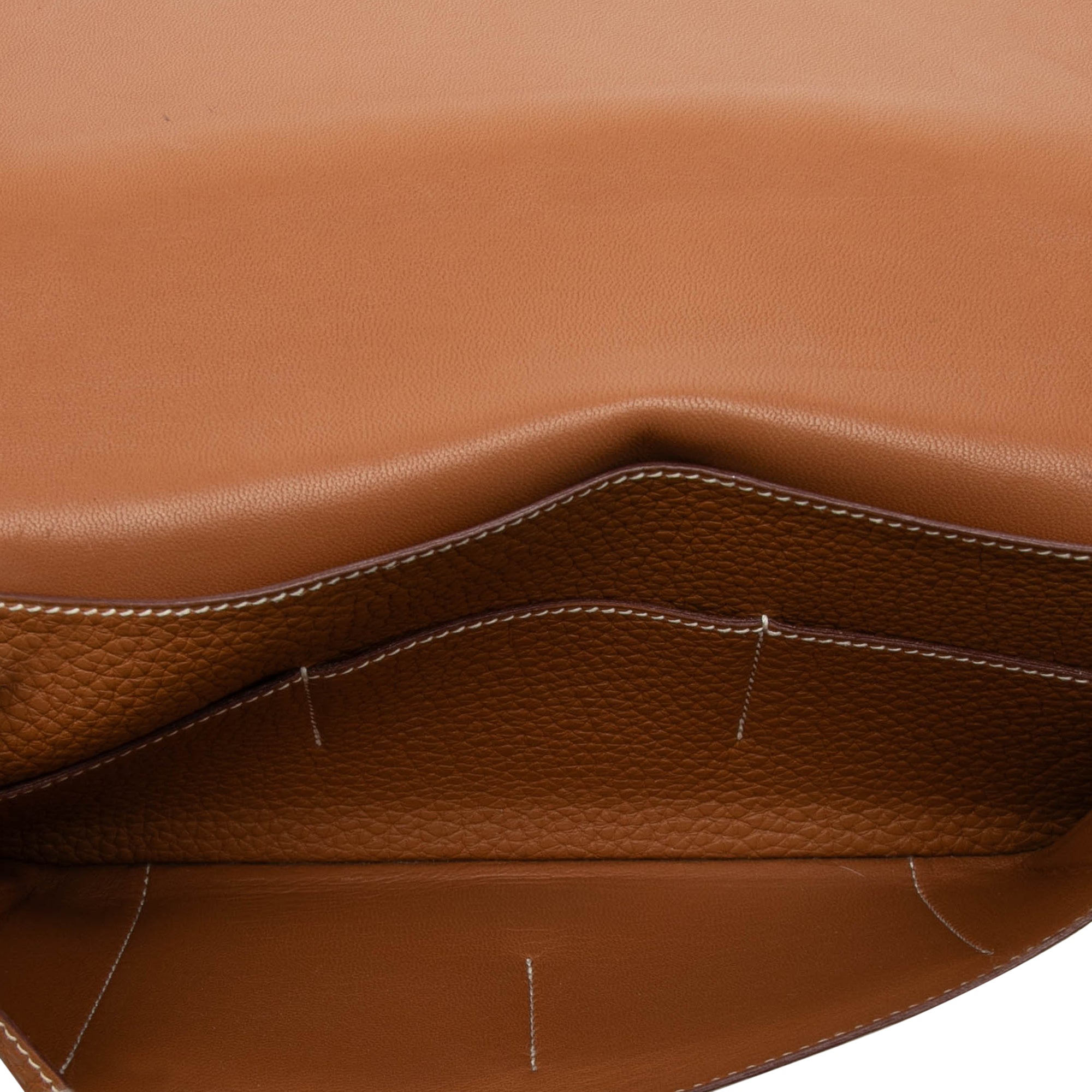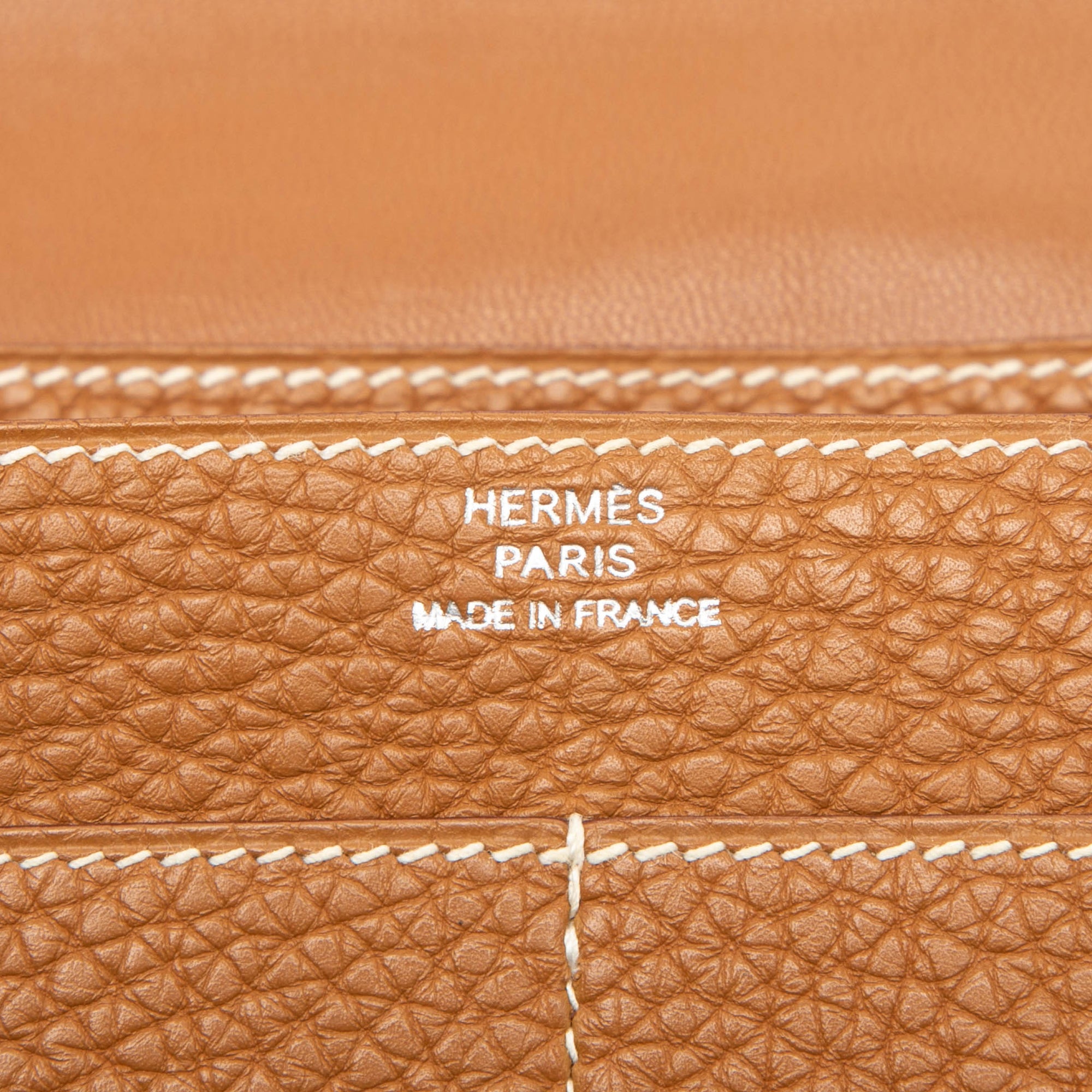 This Dogon Duo wallet features a Togo leather body in Gold color, a strap with clou de selle closure, interior slip pockets, a removable zip pouch. Retail Price: 1400.00