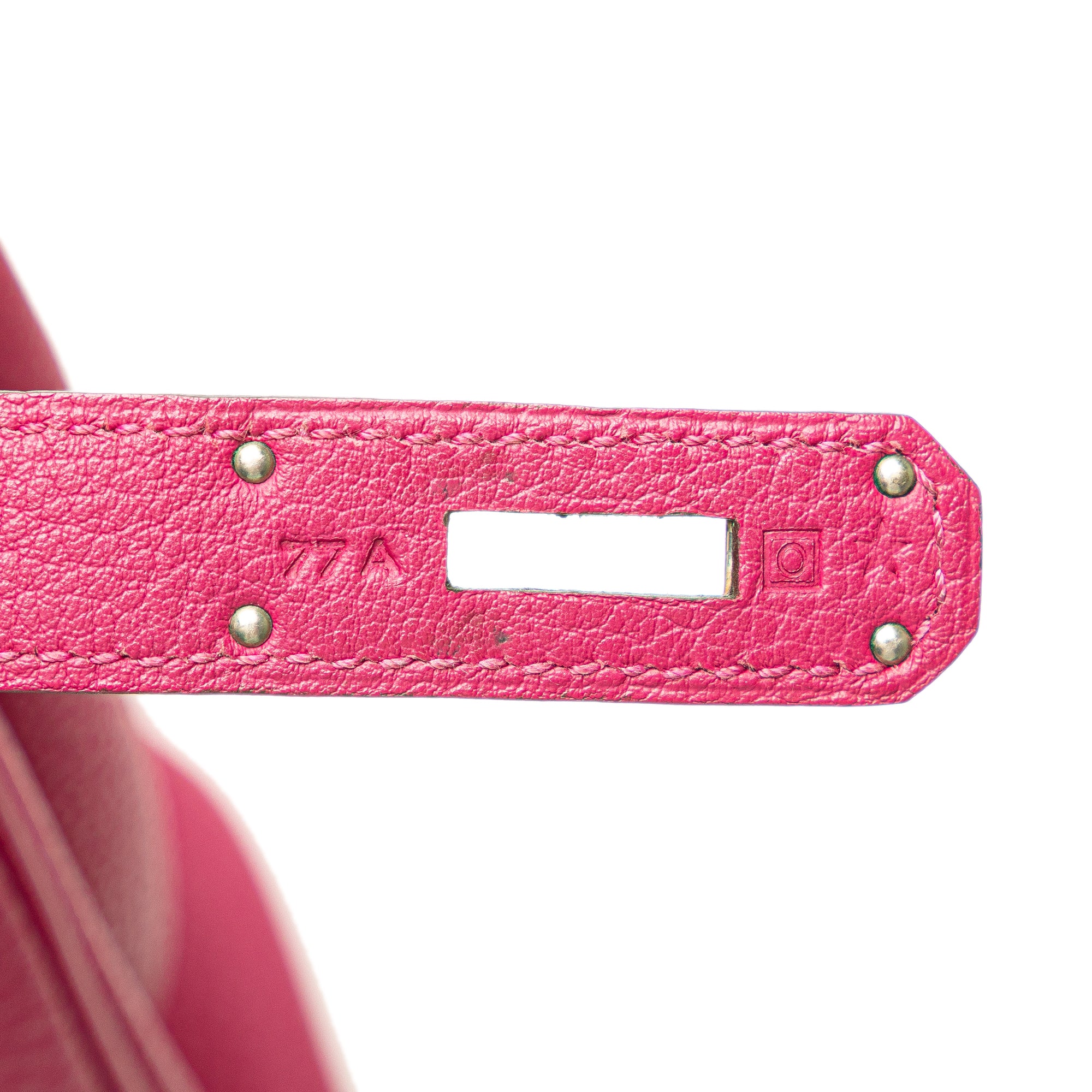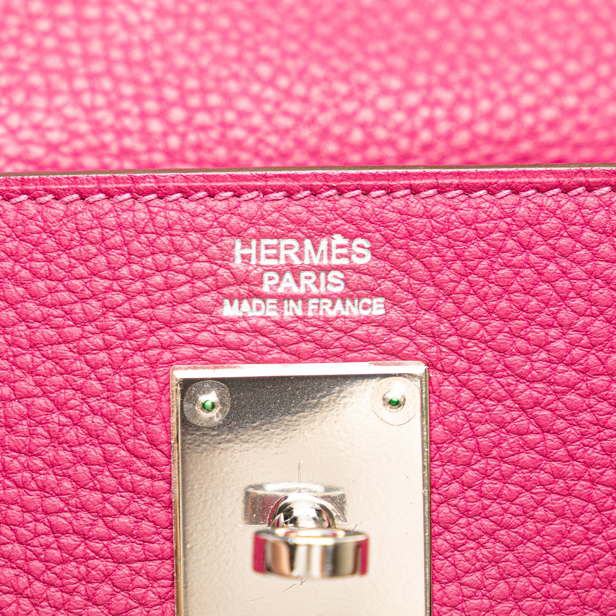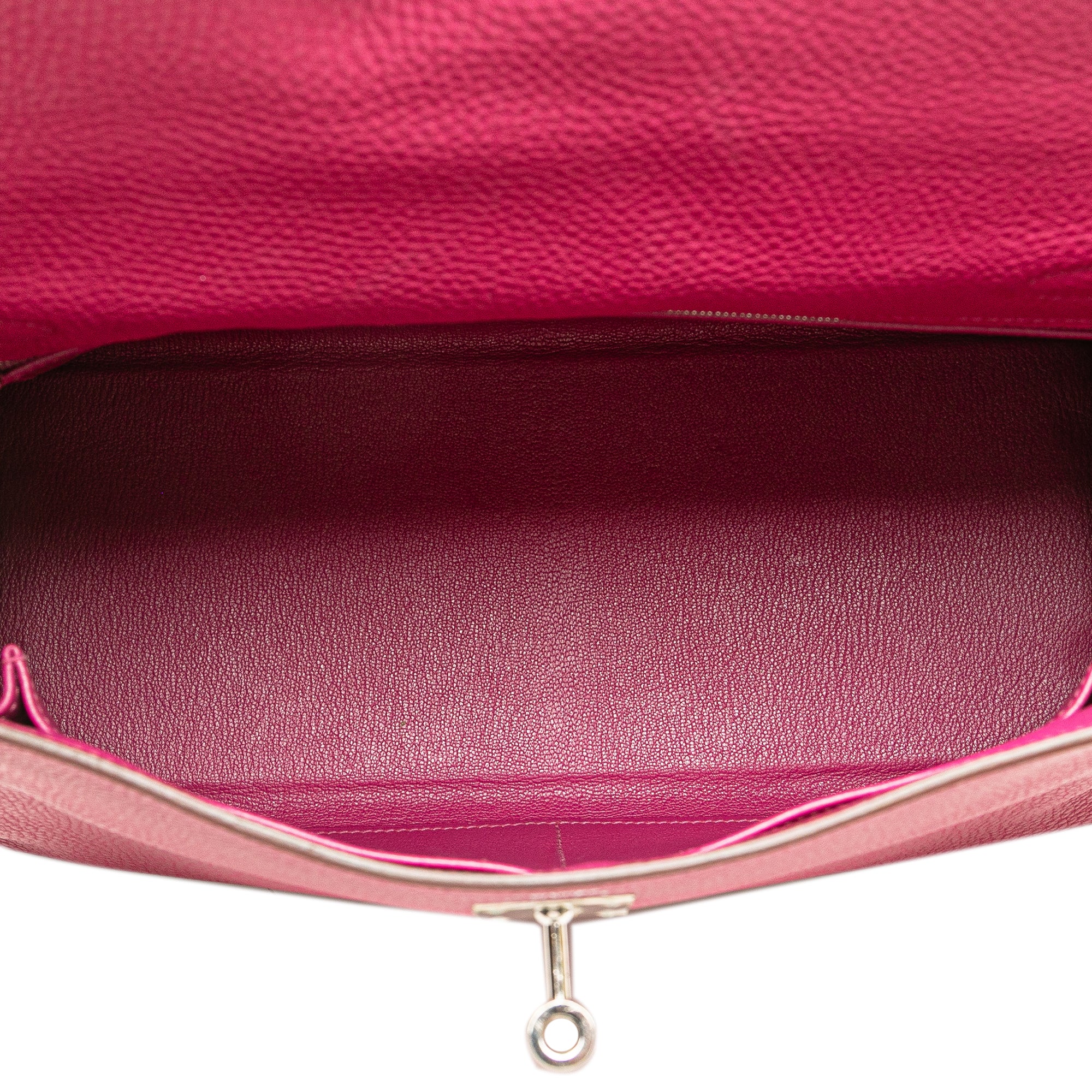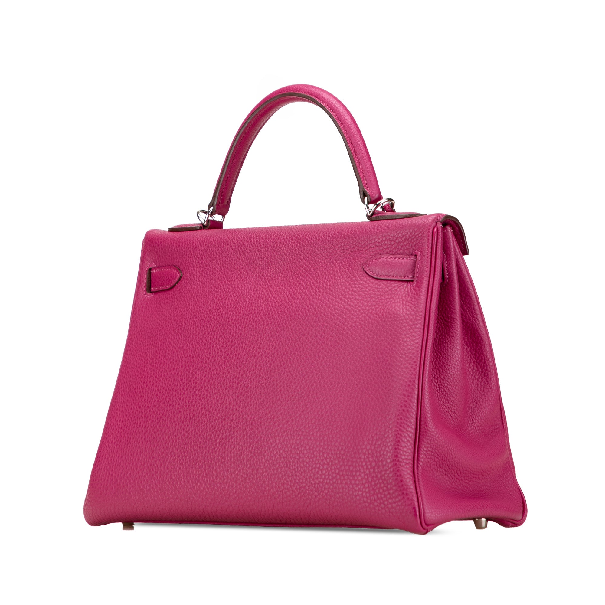 The Kelly 32 features a Togo leather body in Rose Pourpre color, a flat leather top handle, a detachable leather shoulder strap, a top flap with twist lock closure, and interior zip and slip pockets. Retail Price: 12500.00