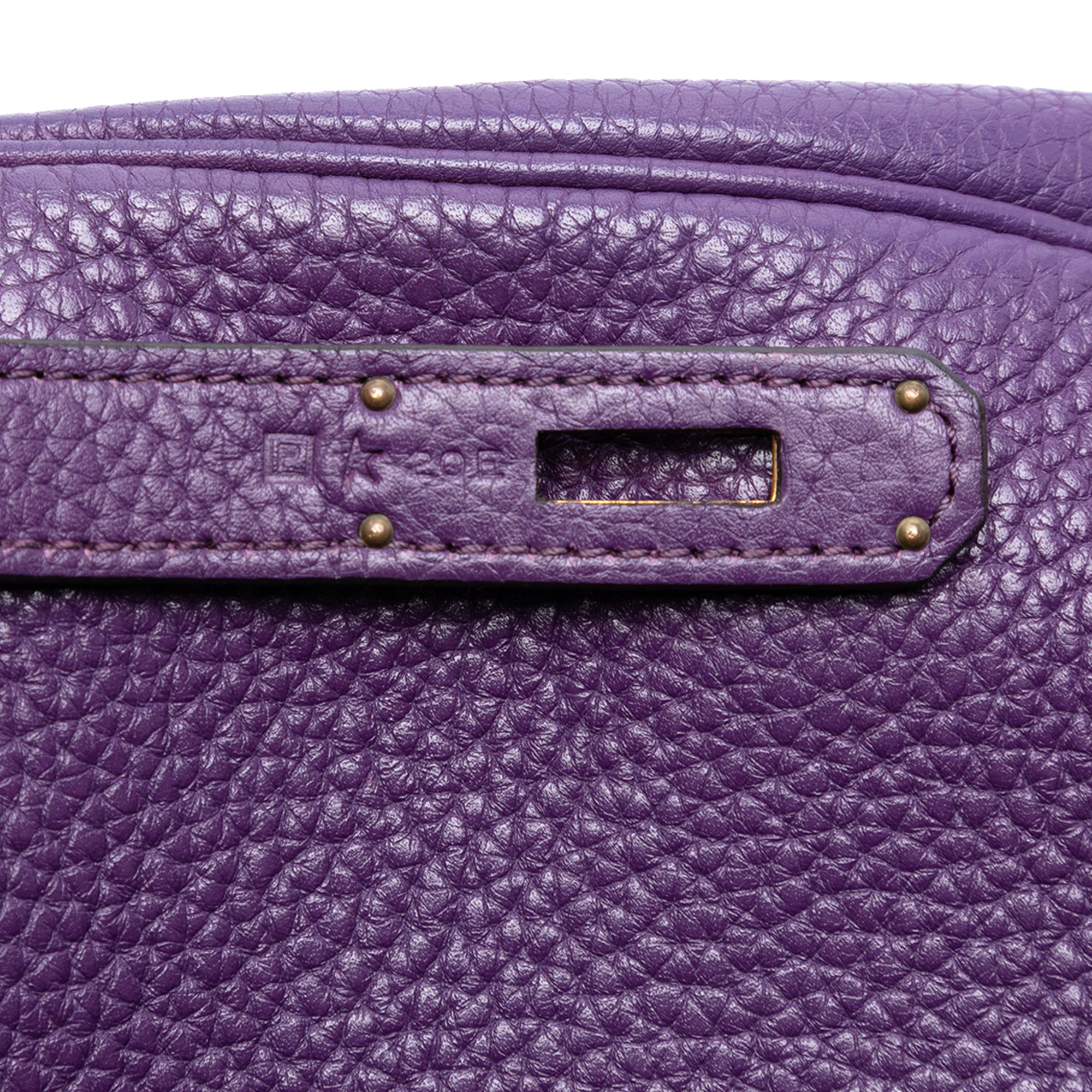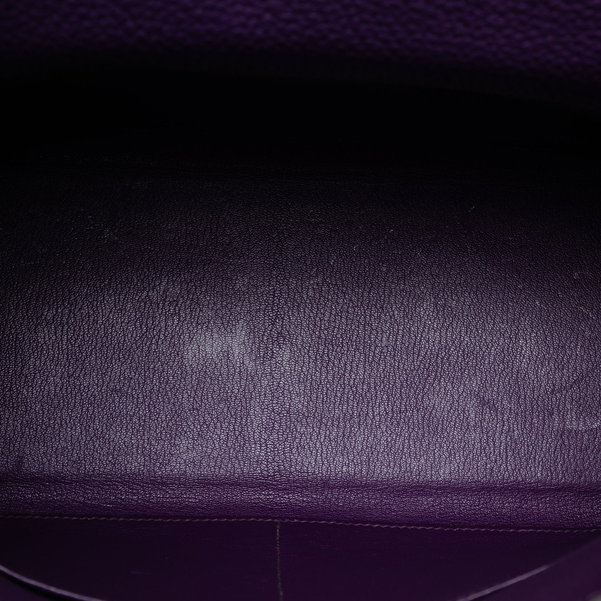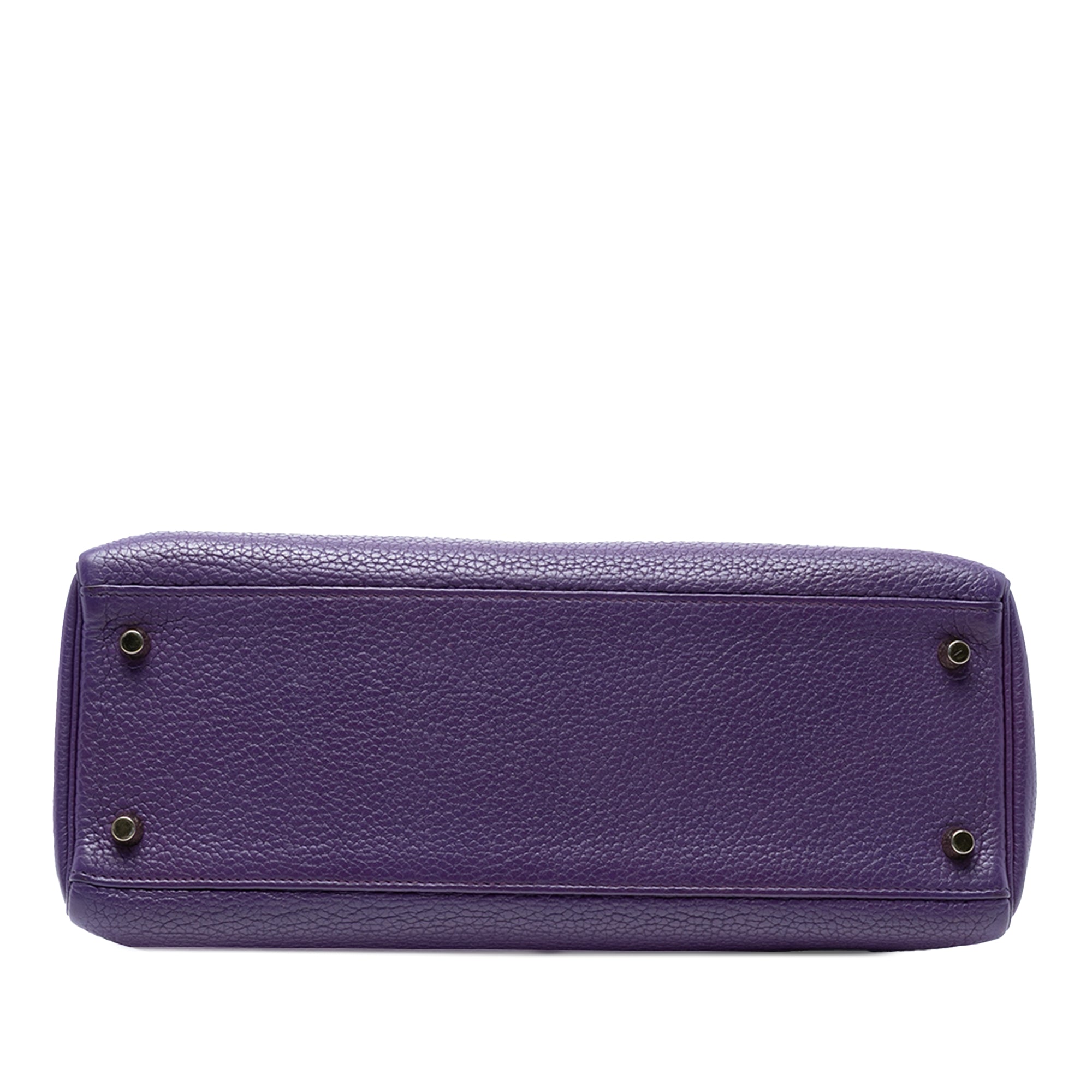 This Kelly 32 features a Togo leather body in Ultraviolet color, a flat leather top handle, a detachable flat leather shoulder strap, a top flap with twist lock closure, and interior zip and slip pockets. Retail Price: 19500.00