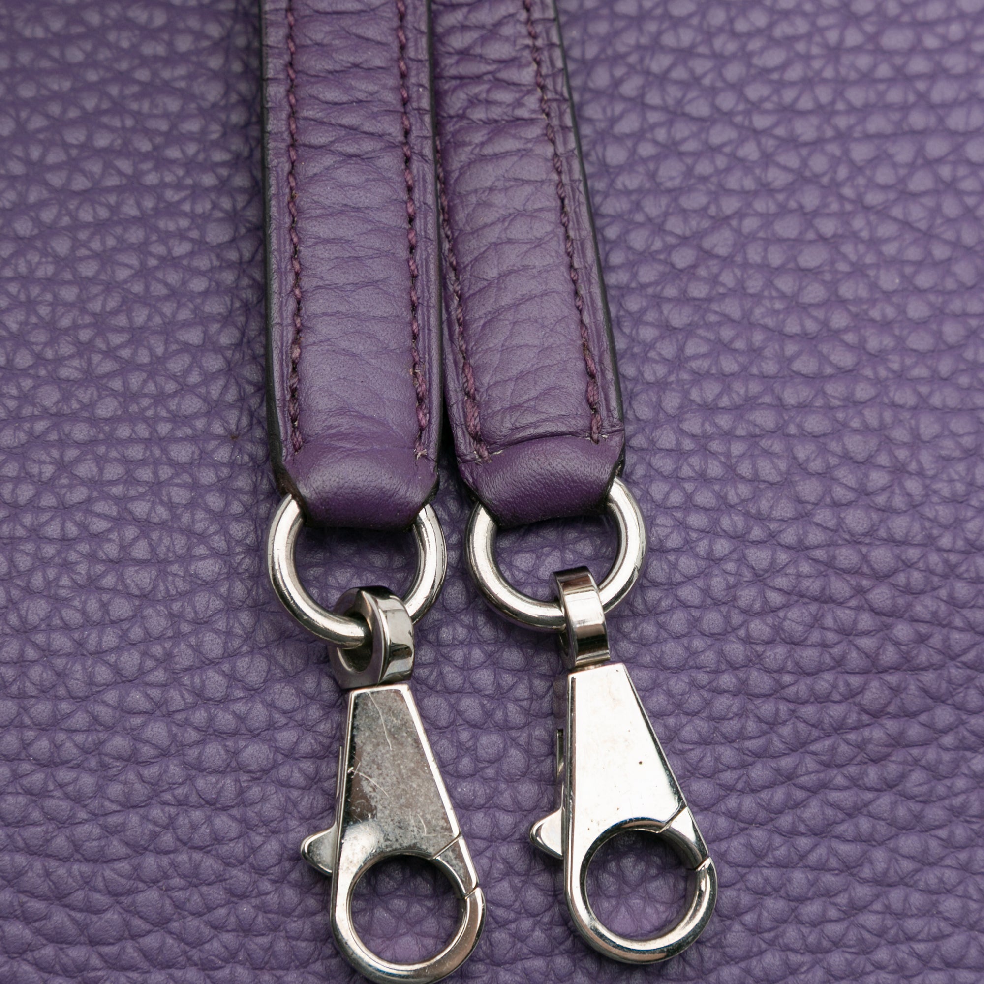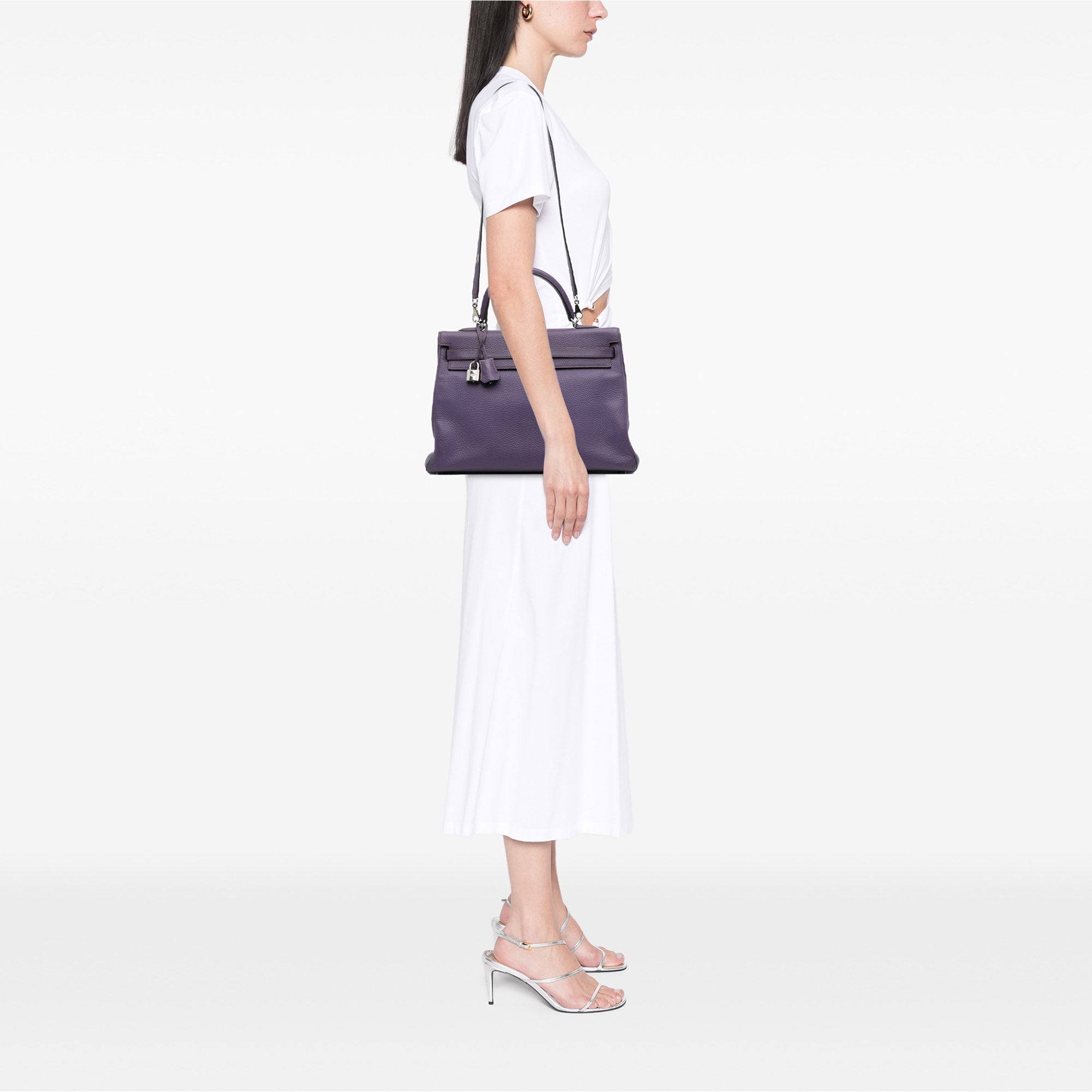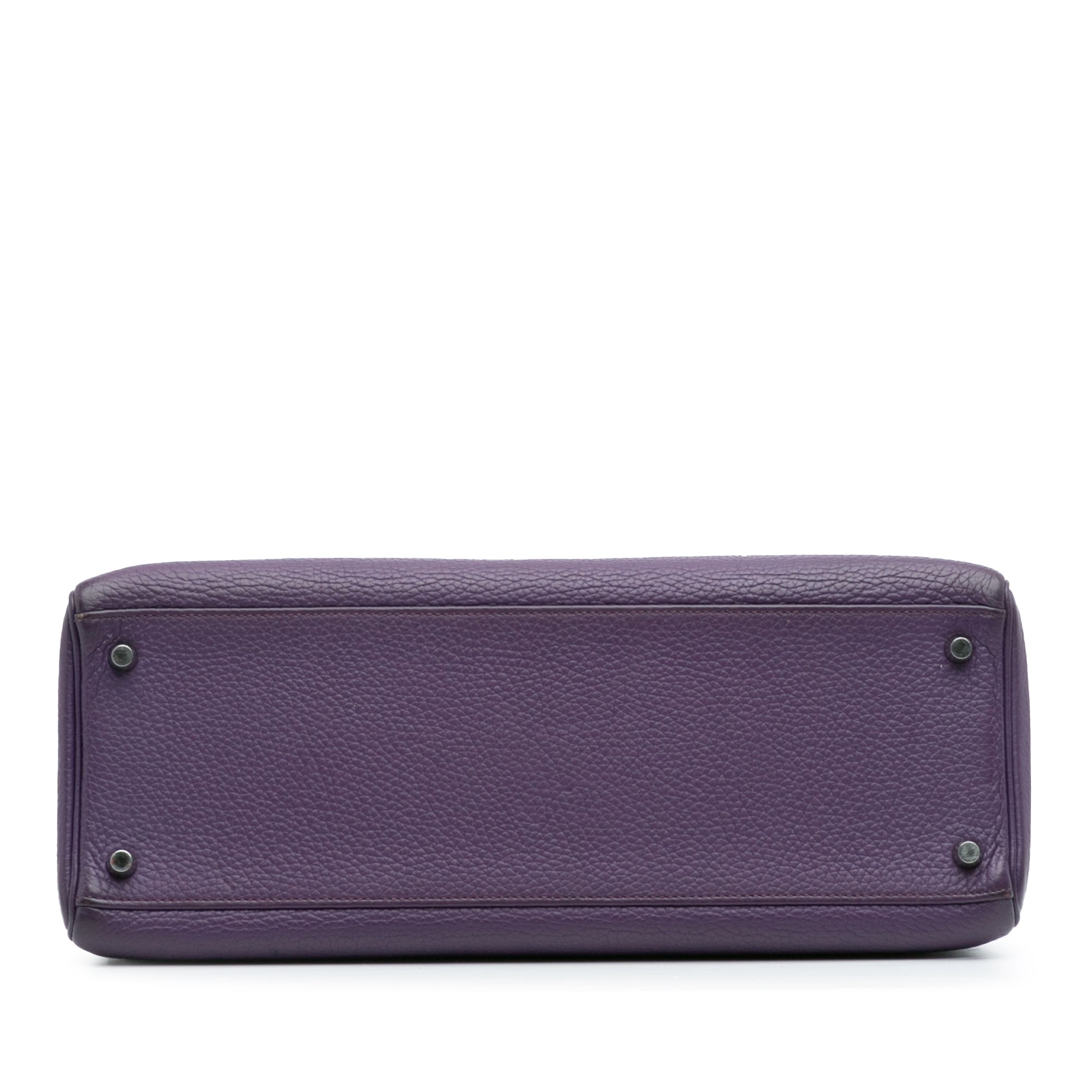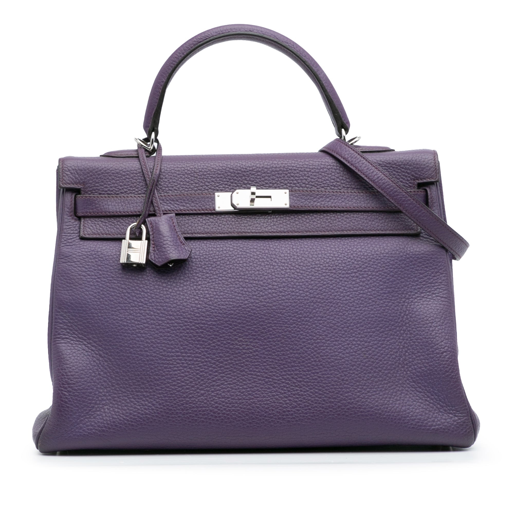 This Kelly II features a Togo leather body in Ultraviolet color, a flat leather top handle, a detachable flat leather. strap, a top flap with twist lock closure, and interior zip and slip pockets. Retail Price: 19500.00