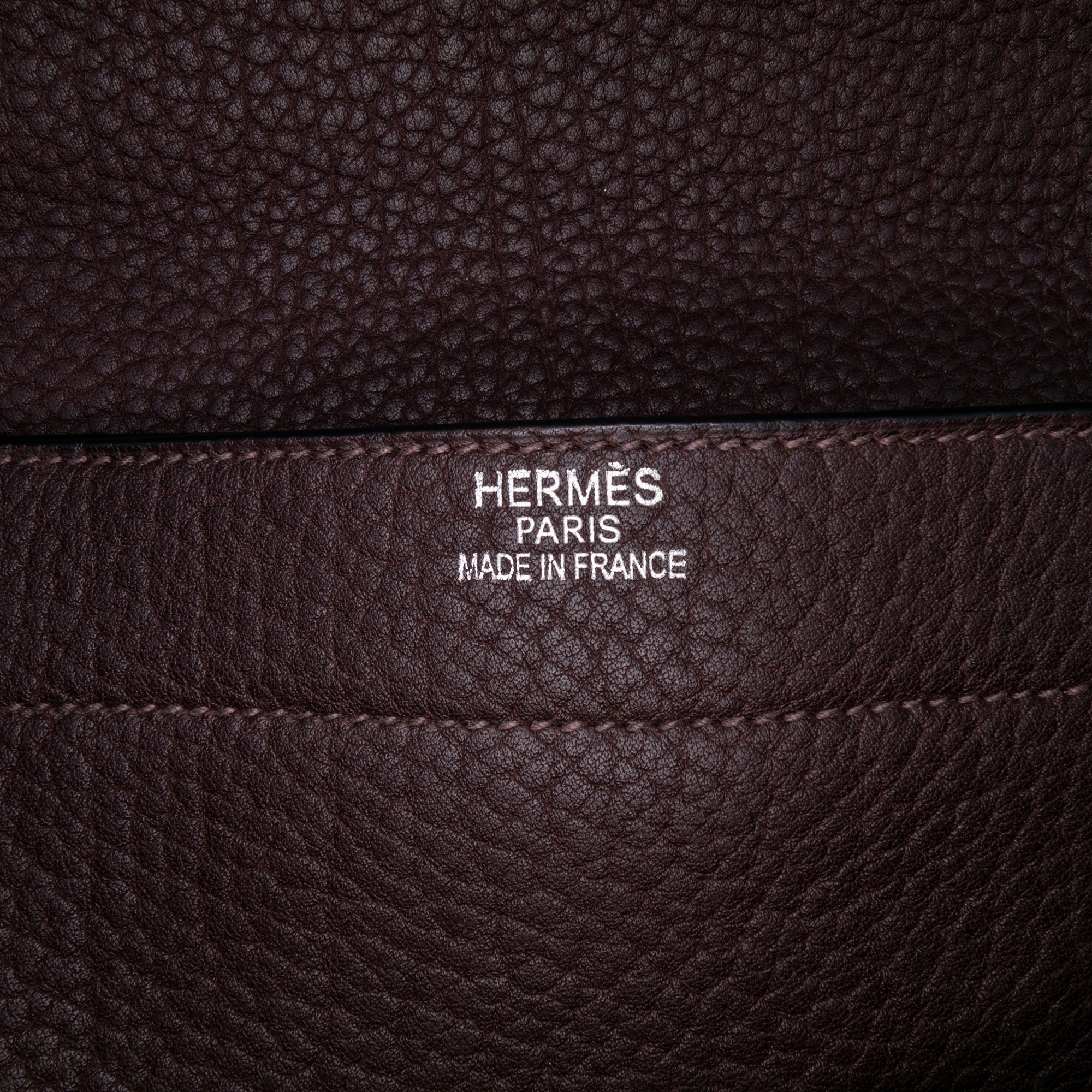 This Sac A Depeches features a Togo leather body in Ebene color, a flat top handle, a top flap with push lock closure, and interior slip pockets. Retail Price: 5000.00