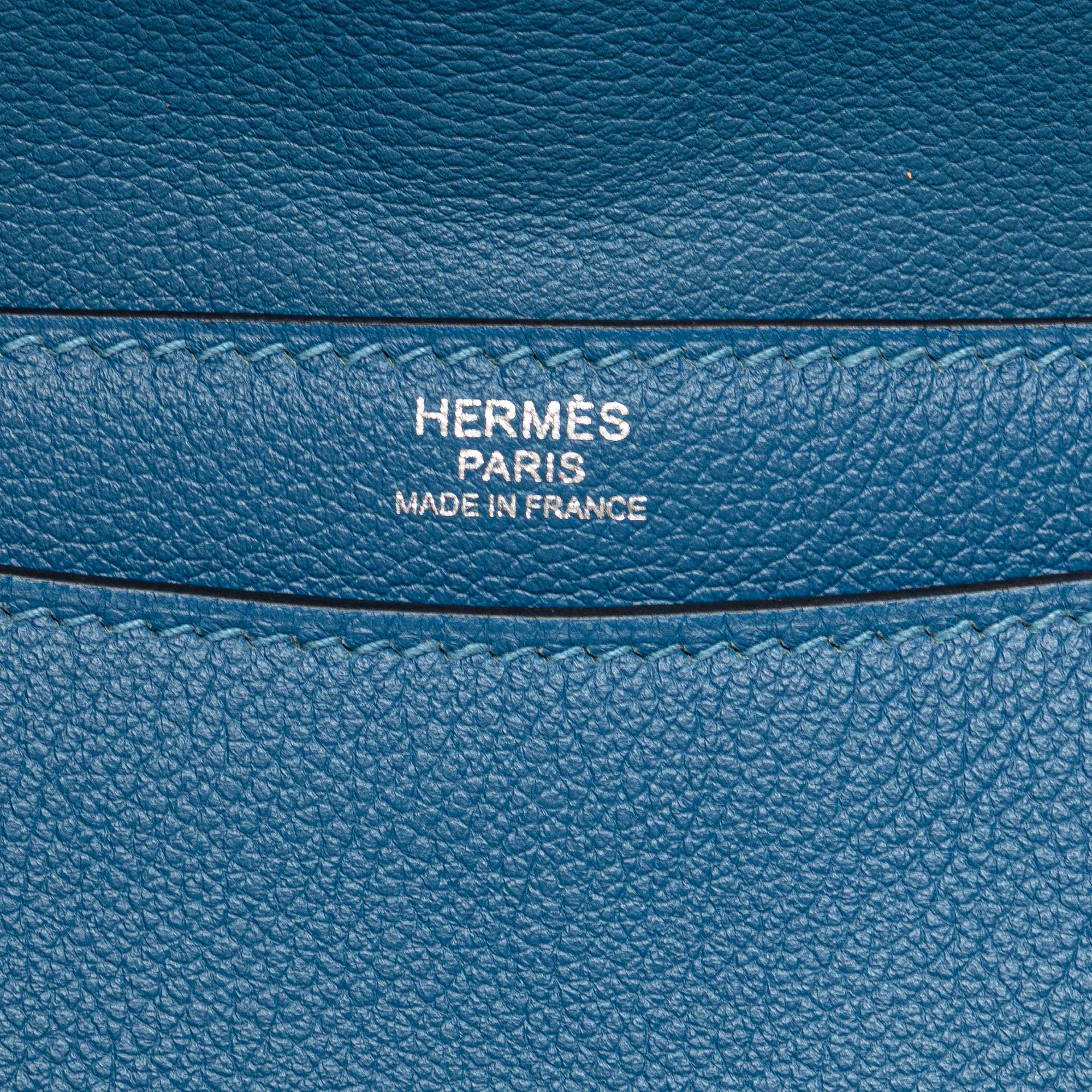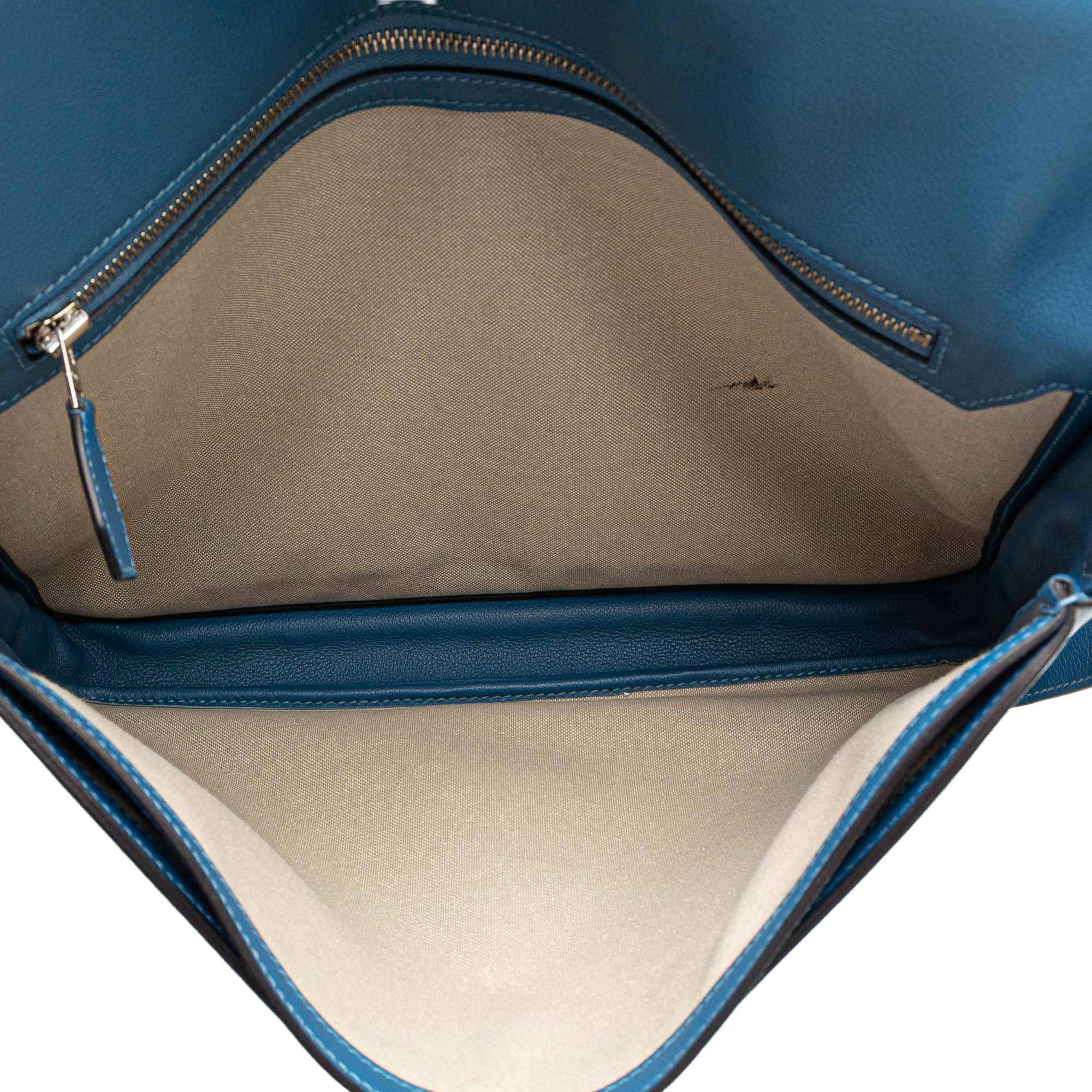 This crossbody bag features a Togo leather body in Blue Izmir color, an adjustable flat leather shoulder strap, a front flap with slip -through closure, and interior zip pocket. Inclusion: Dust bag. Retail Price: 4000.00