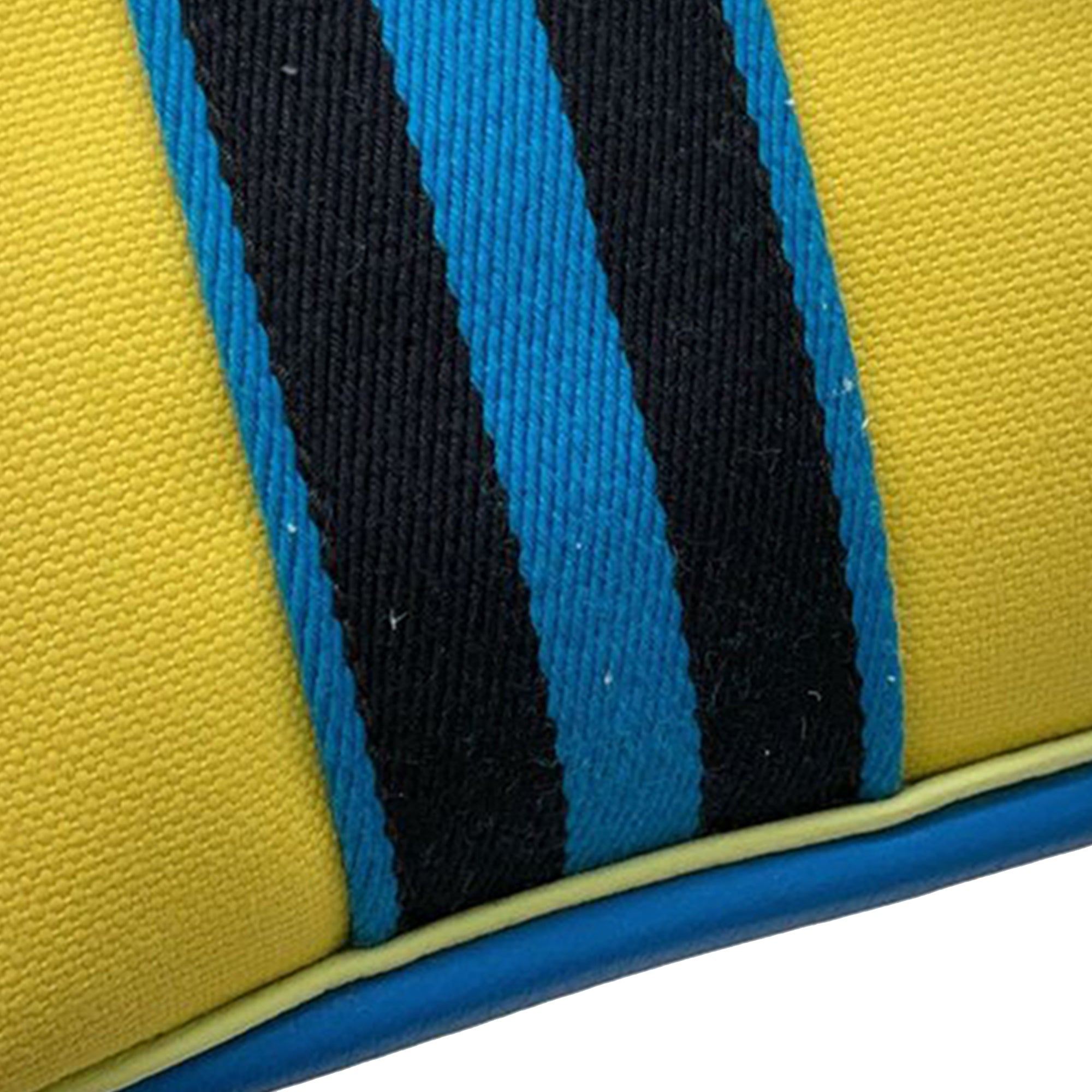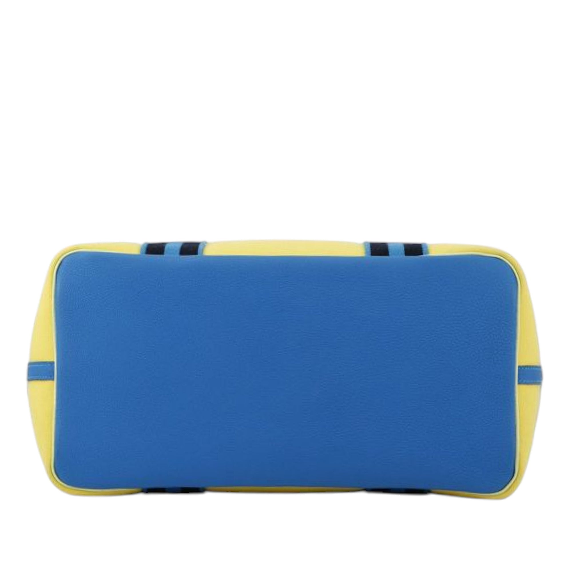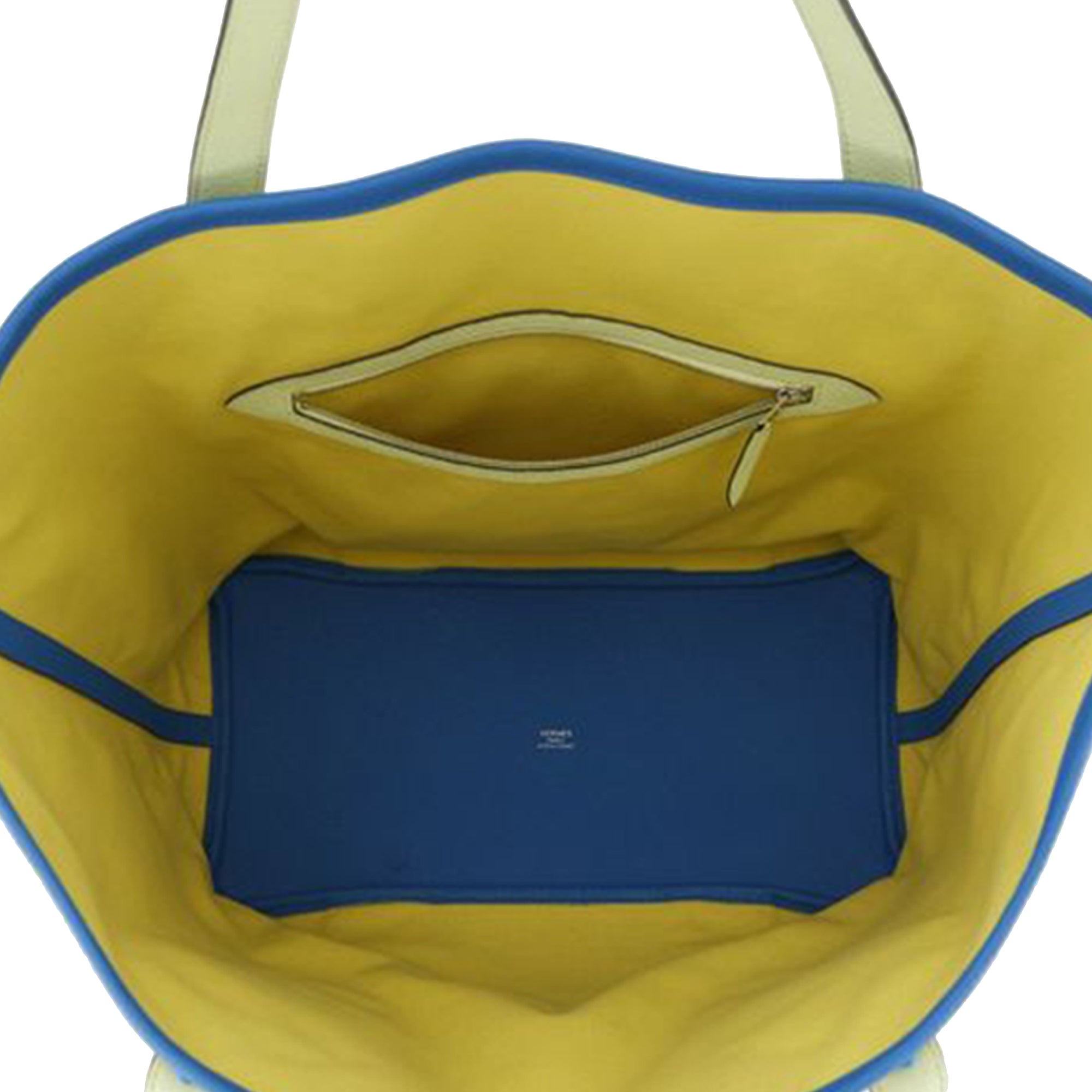 This Pursangle Tote features a canvas body and Clemence leather trim in Lime, Vert Absinthe, Blue Hydra, and Blue Indigo colors, flat leather handles, an open top, exterior slip pockets, and an interior zip pocket. Inclusion: Dust bag. Retail Price: 3875.00