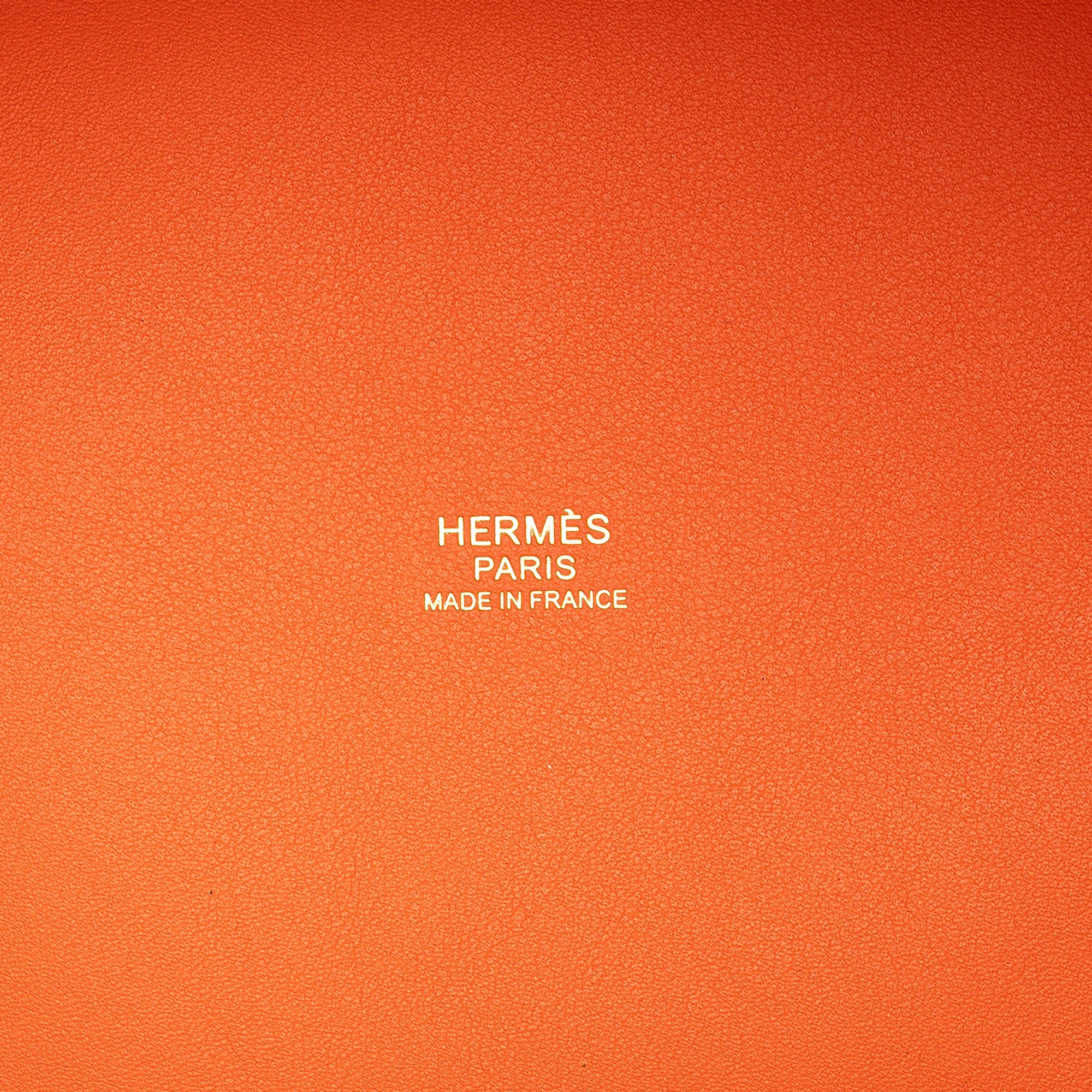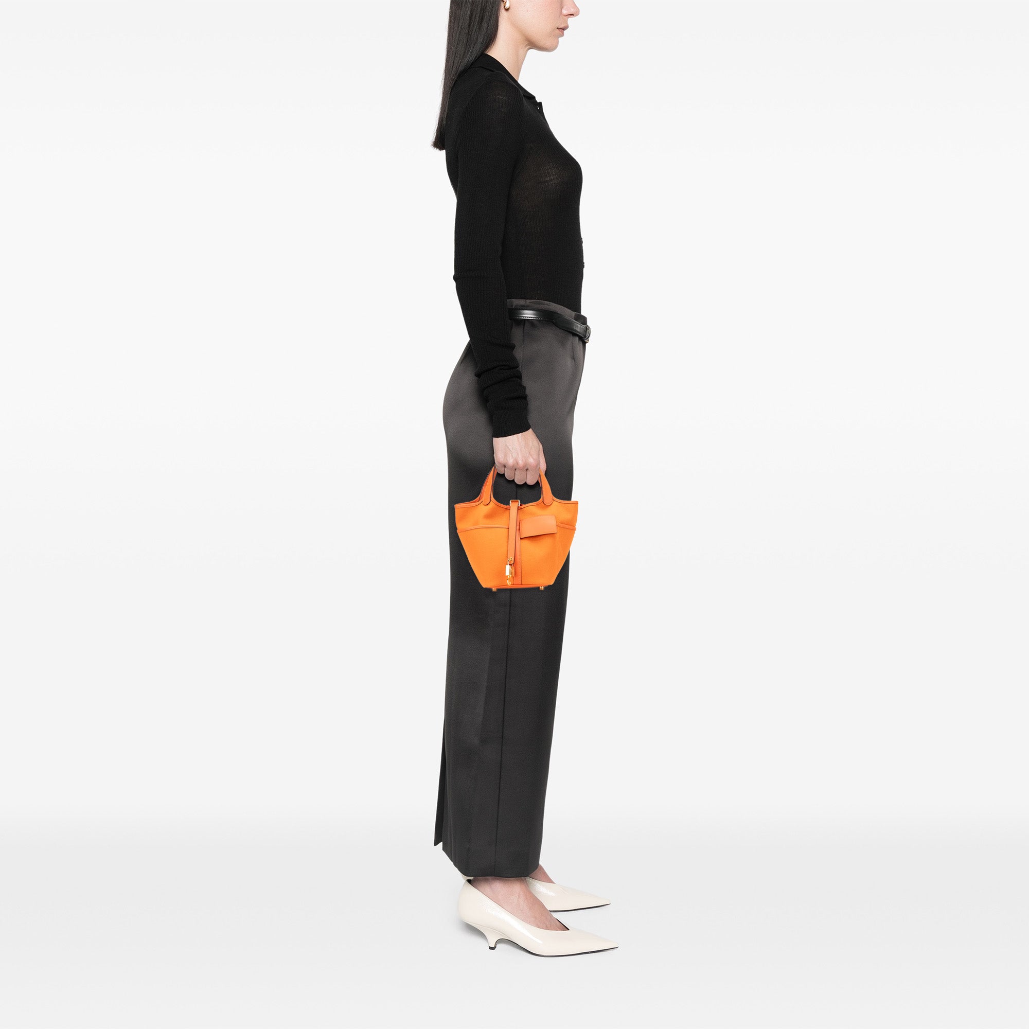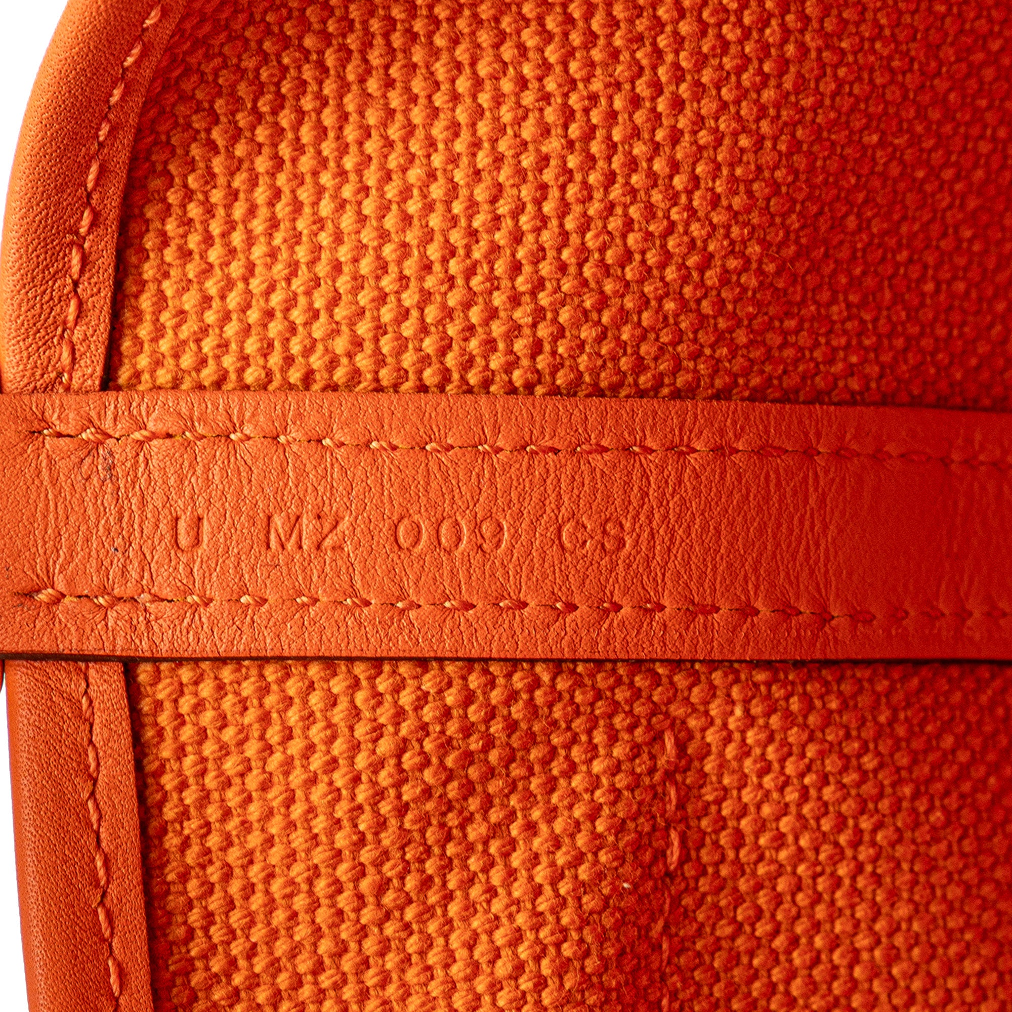 The Cargo Picotin features a canvas body with Swift leather trim in Orange color, flat leather handles, an open top with strap and buckle closure, and exterior slip pockets. Inclusion: Dust bag, box. Retail Price: 4812.00