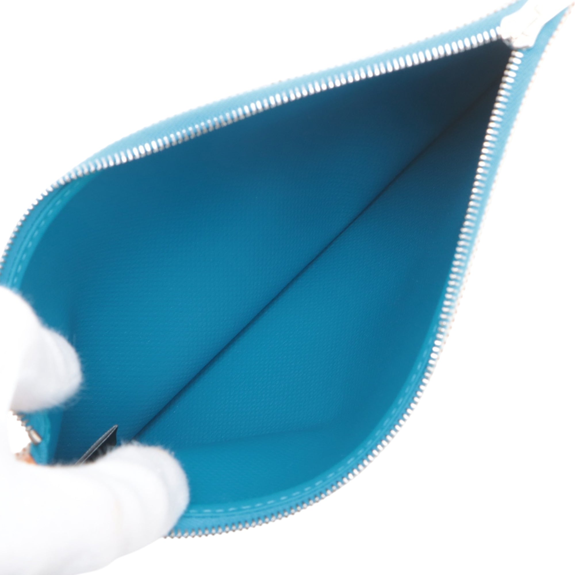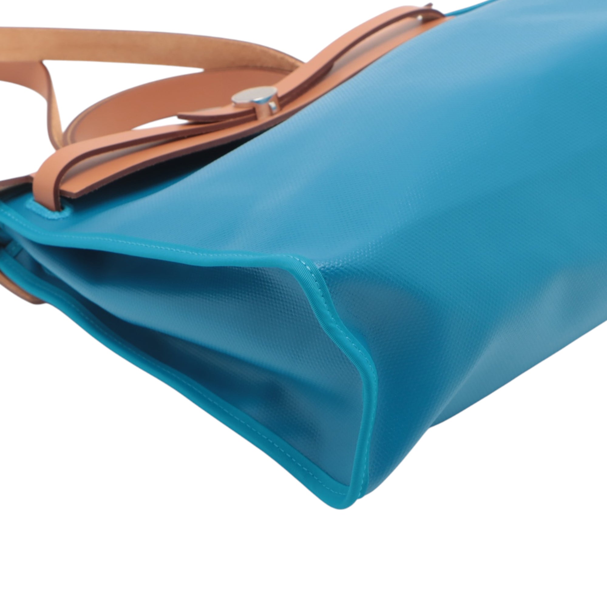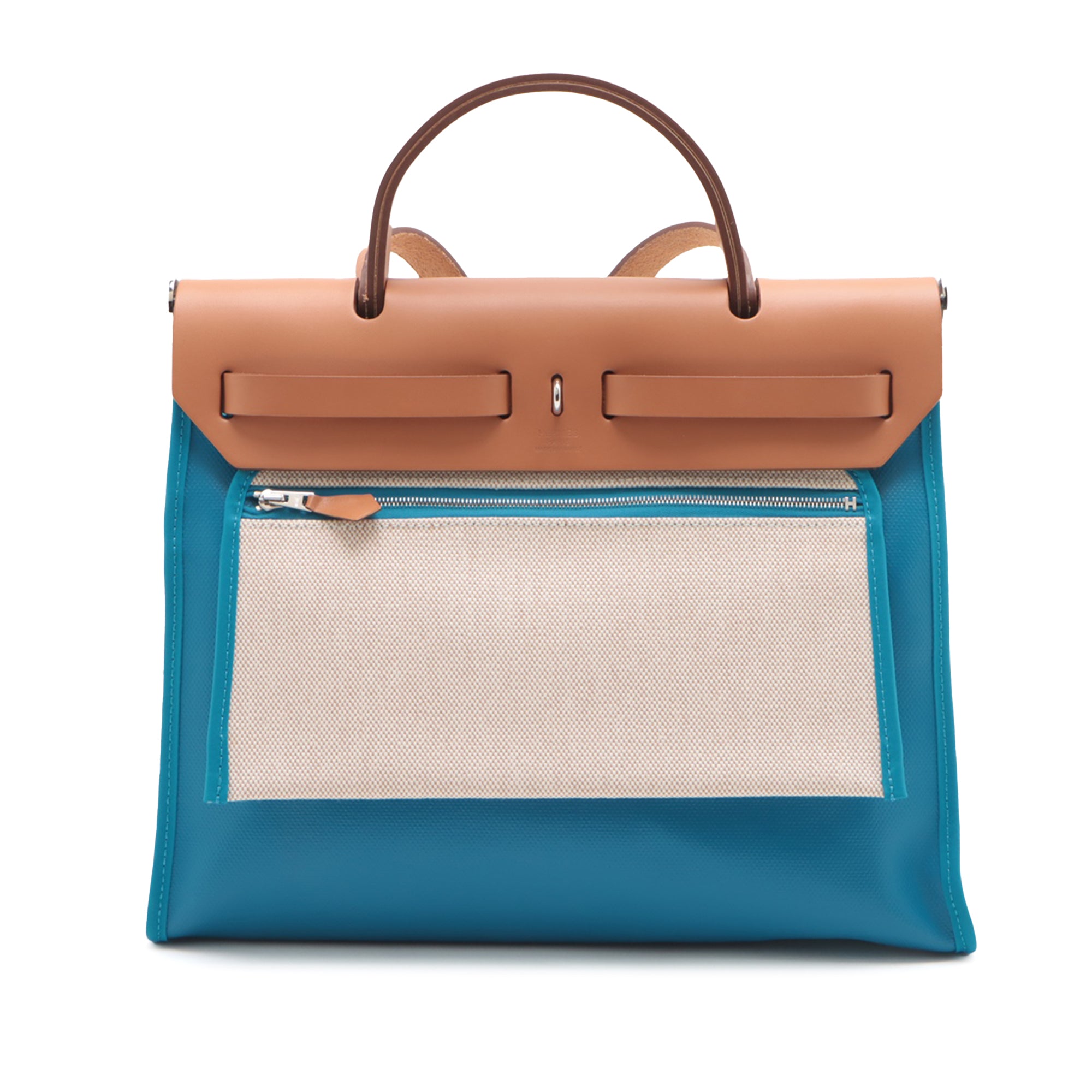 The Herbag Zip 31 features a canvas body with leather trim in Zanzibar Bleu color, a flat leather top handle, a flat leather shoulder strap, a front flap with pull-through strap closure, an exterior back zip pocket, and a detachable interior zip pouch. Retail Price: 3375.00