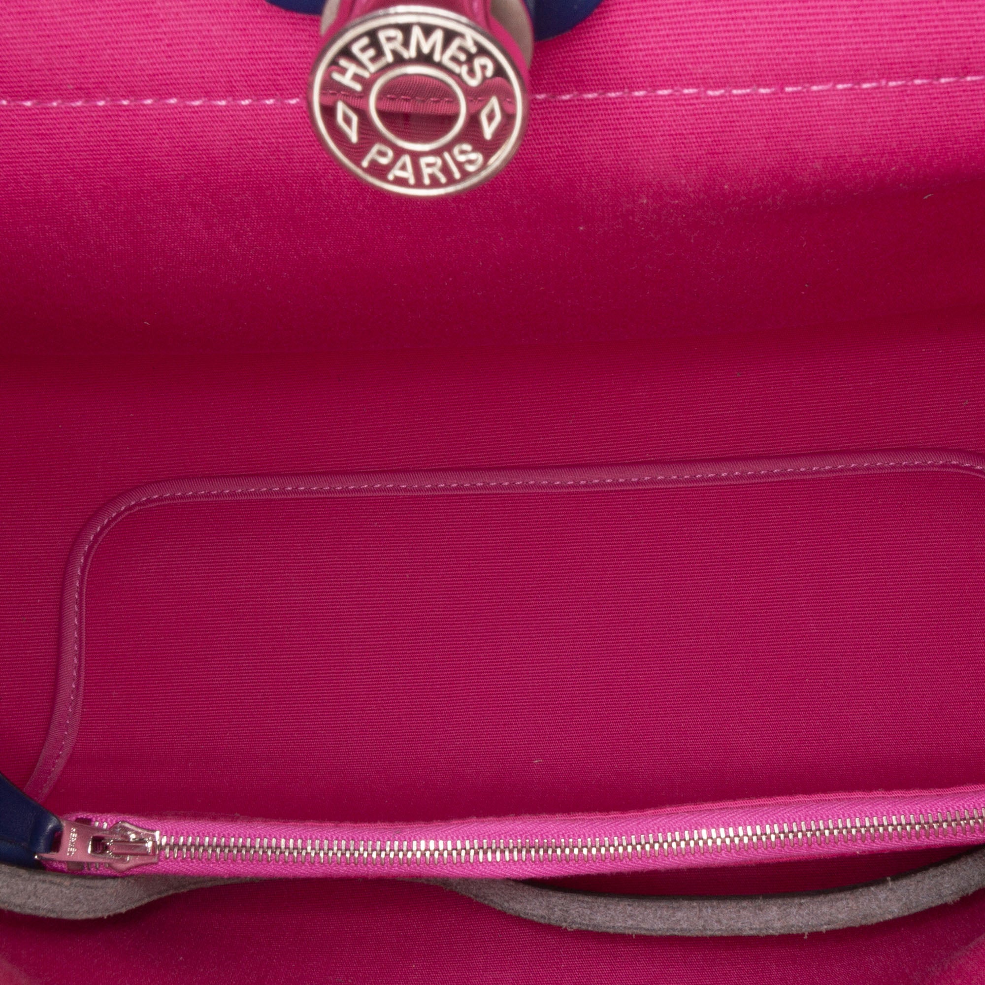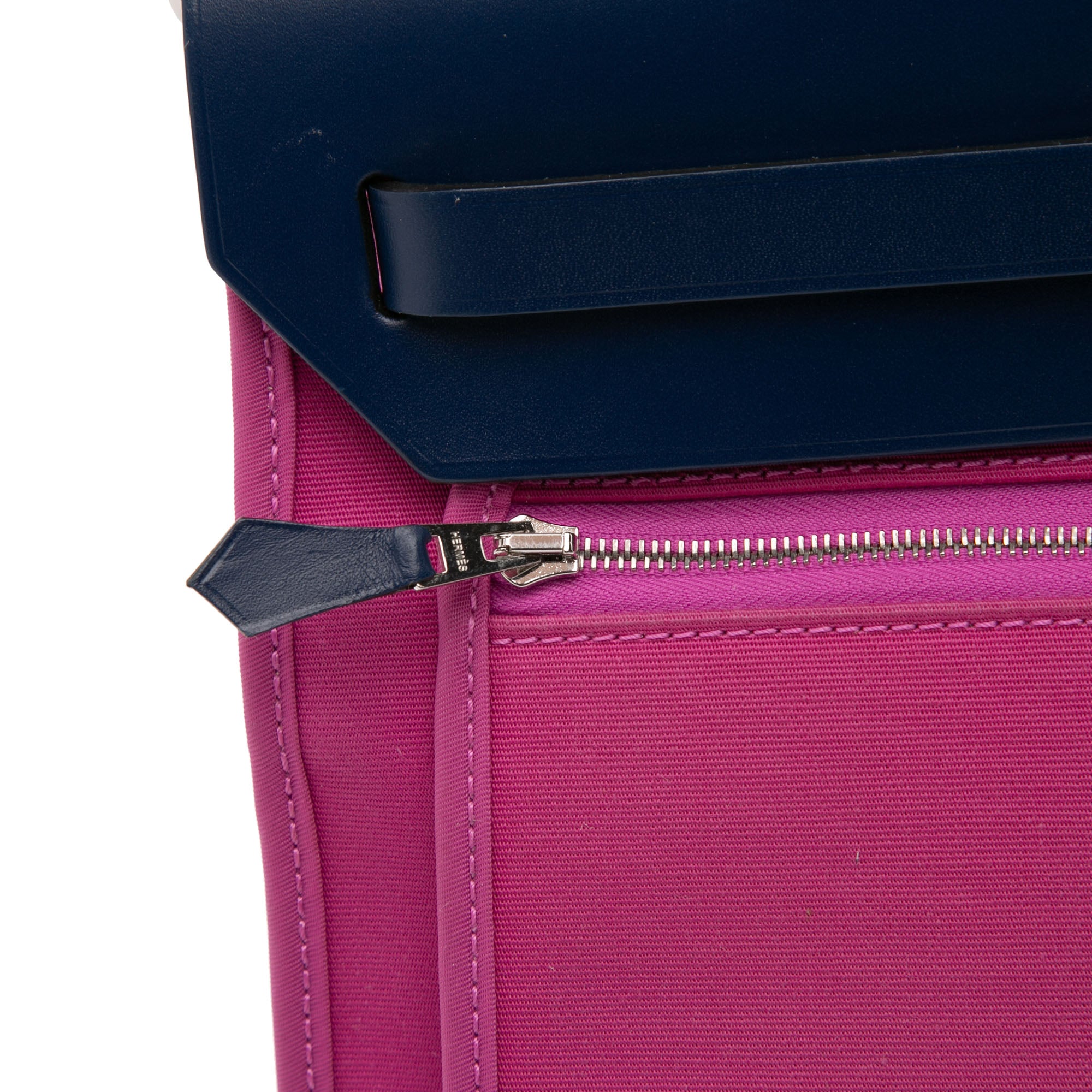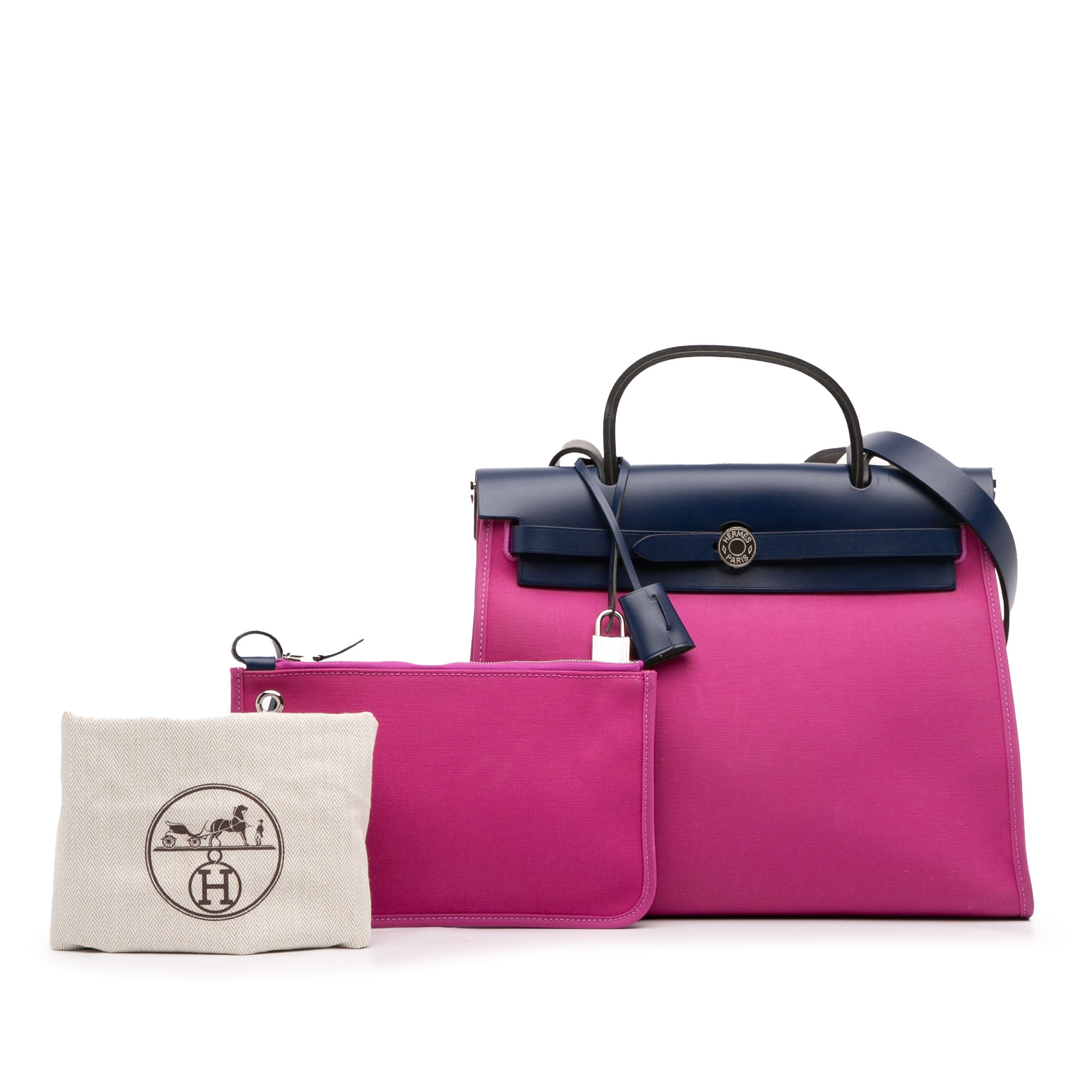 The Herbag Zip 31 features a canvas body with leather trim, a flat leather top handle, a flat leather shoulder strap, a front flap with pull-through strap closure, an exterior back zip pocket, and a detachable interior zip pouch. Inclusion: Dust bag. Retail Price: 4250.00
