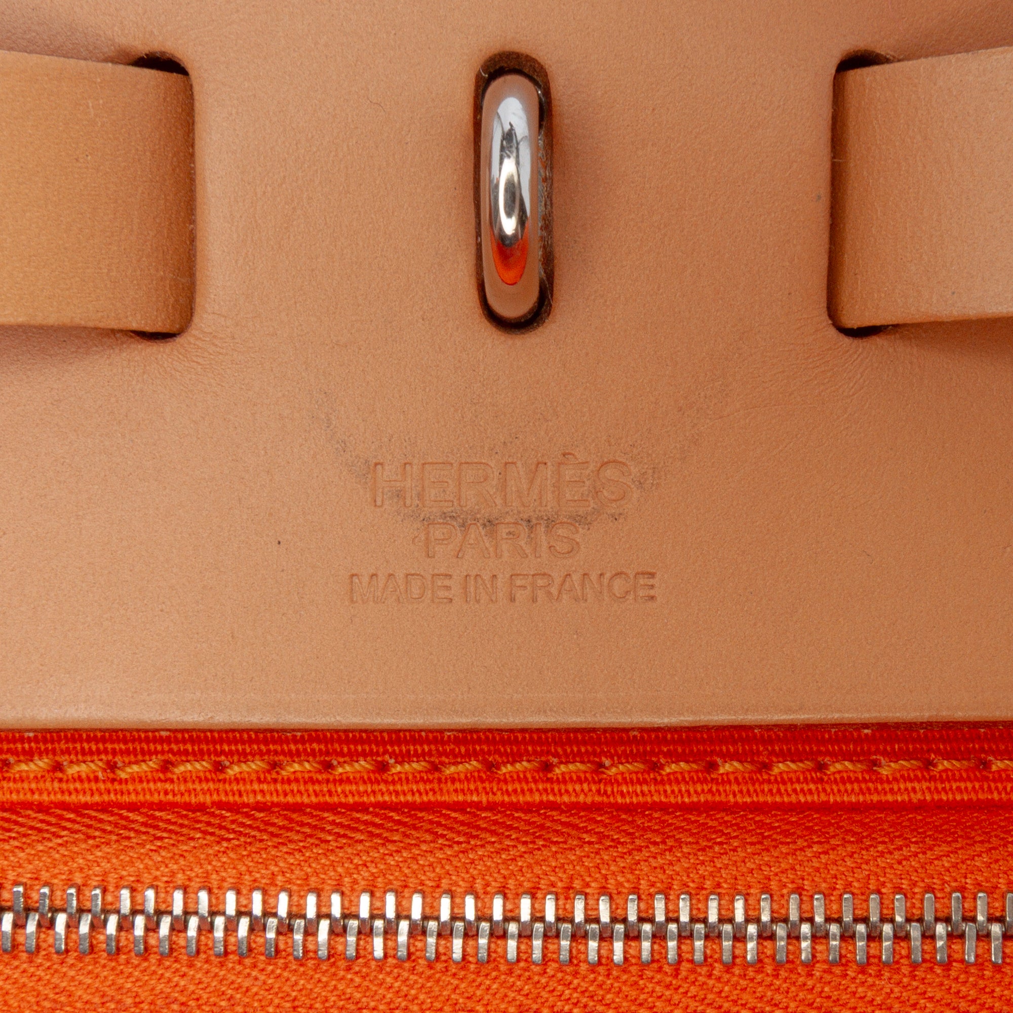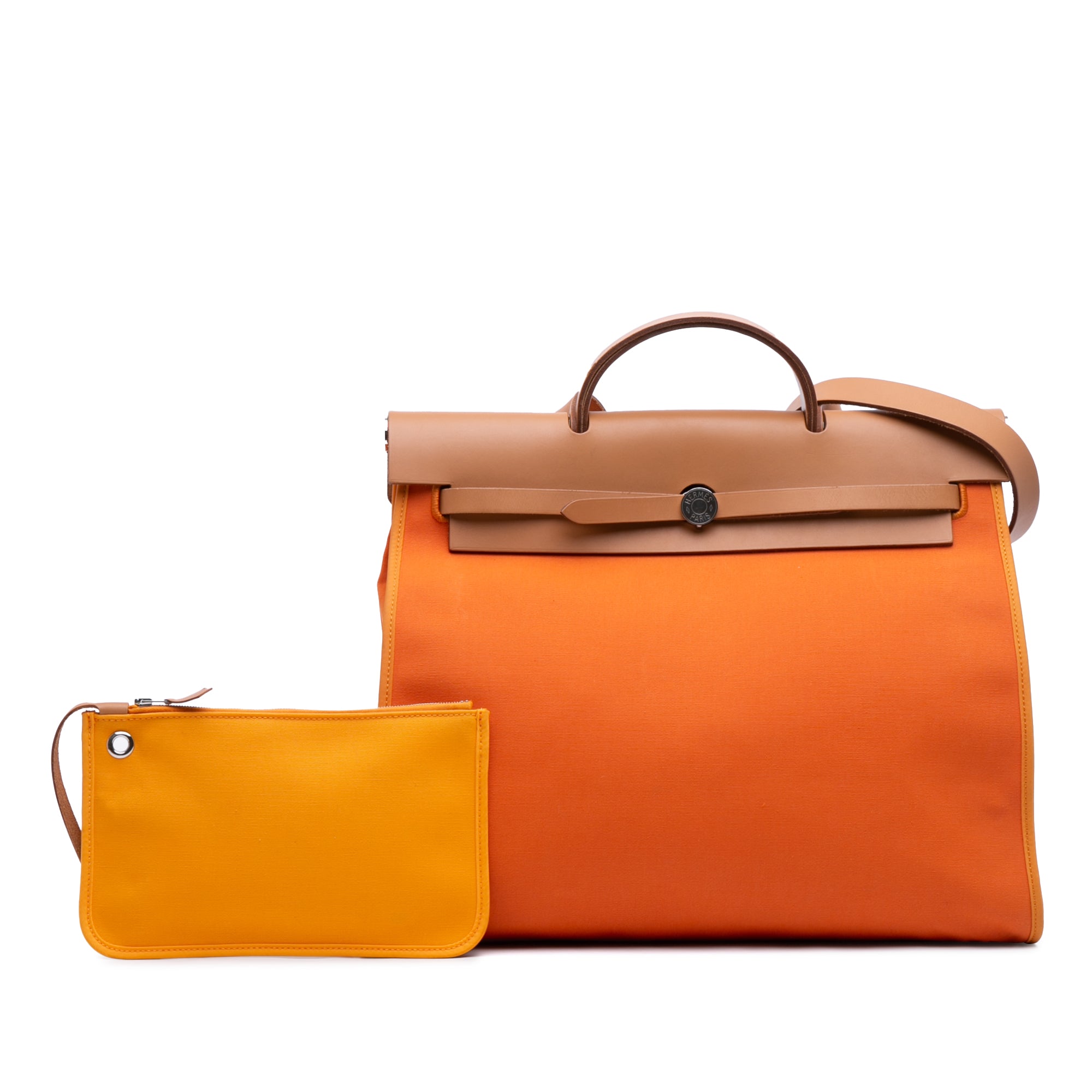 The Herbag Zip features a canvas body, a flat leather top handle, a flat leather shoulder strap, a top flap with pull-through strap closure, an exterior back zip pocket, and a detachable interior zip pouch. Retail Price: 3450.00