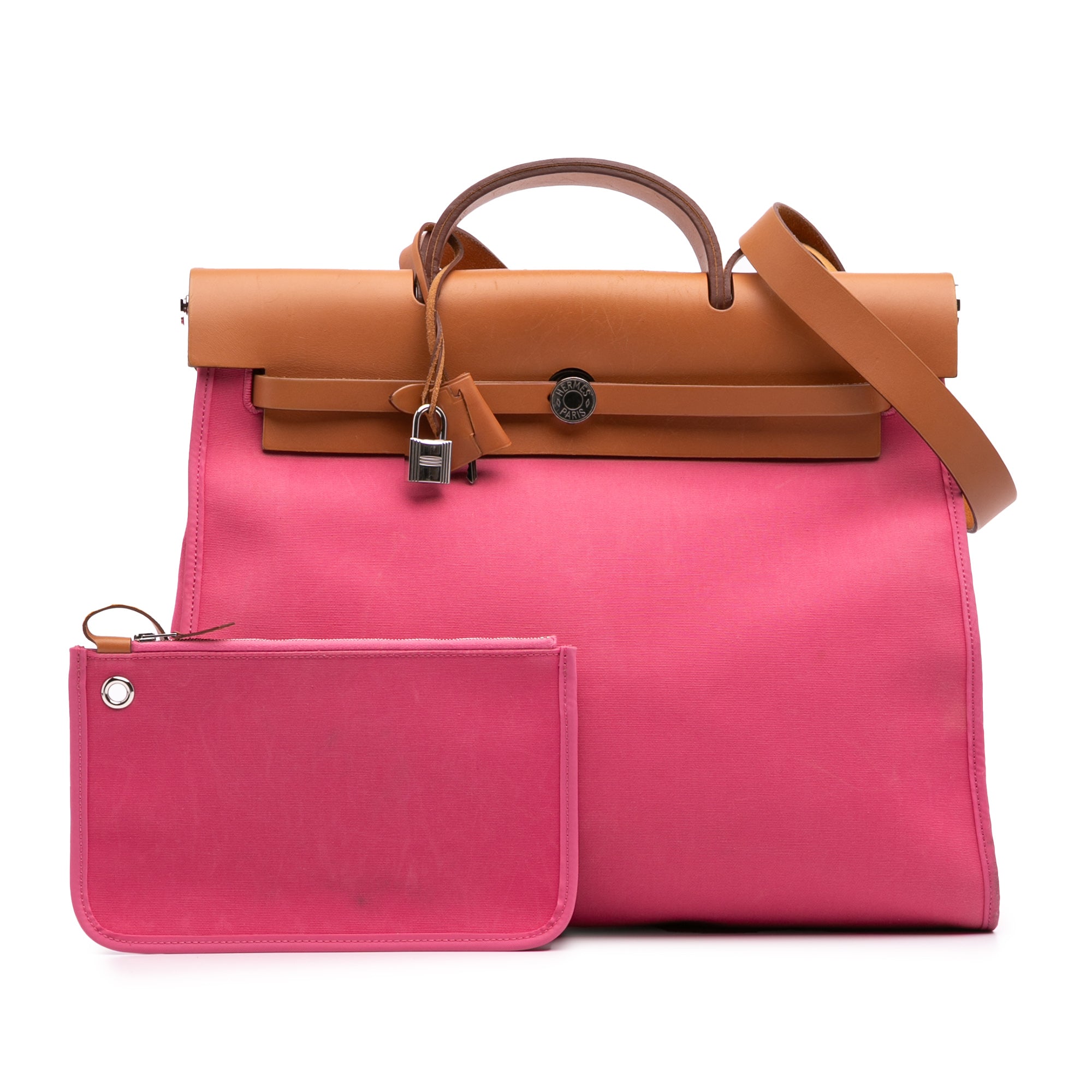 The Herbag Zip features a canvas body, a flat leather top handle, a flat leather shoulder strap, a top flap with pull-through strap closure, an exterior back zip pocket, and a detachable interior zip pouch. Retail Price: 3450.00