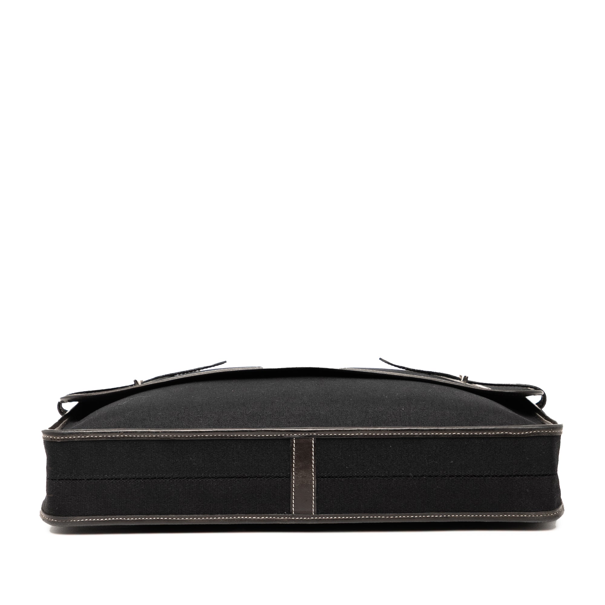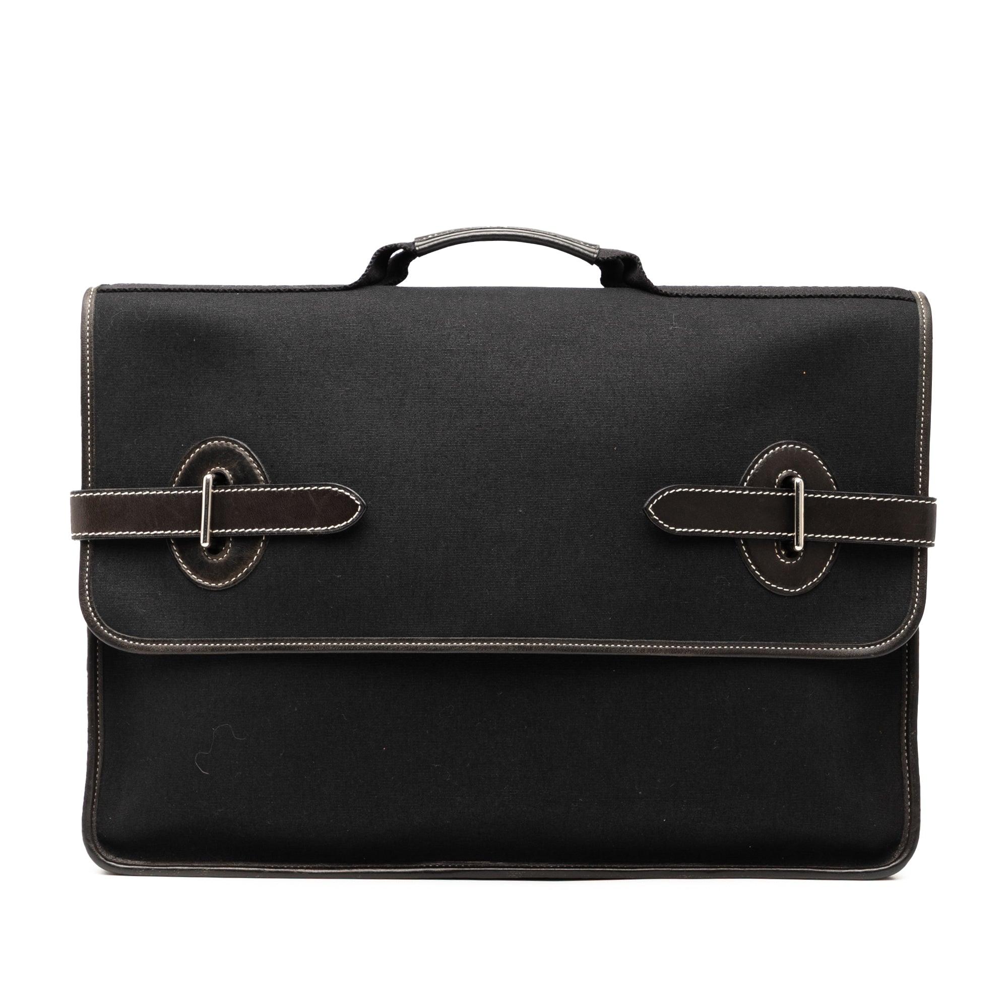 The Buenaventura MM features a canvas body with leather trim, a flat top handle, a front flap with pull through closure, an interior zip compartment, and interior slip pockets. Retail Price: 1915.00