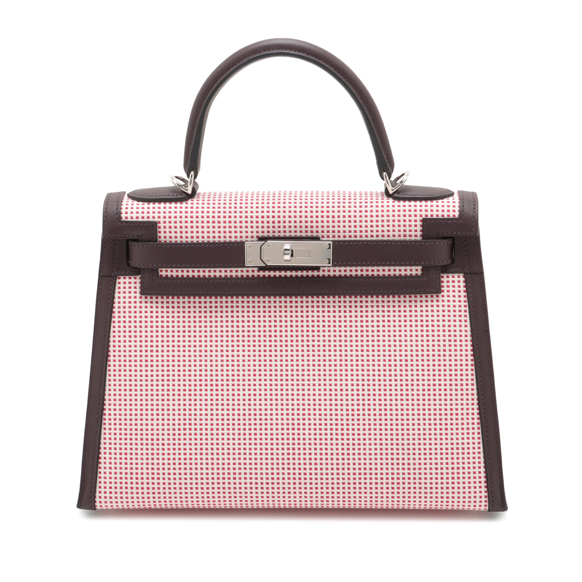 The Kelly 28 features a canvas body with Swift leather trim in Rouge Cellier and Framboise color, a flat leather top handle, a detachable flat leather shoulder strap, a top flap with twist lock closure, and interior zip and slip pockets. Retail Price: 36645.00