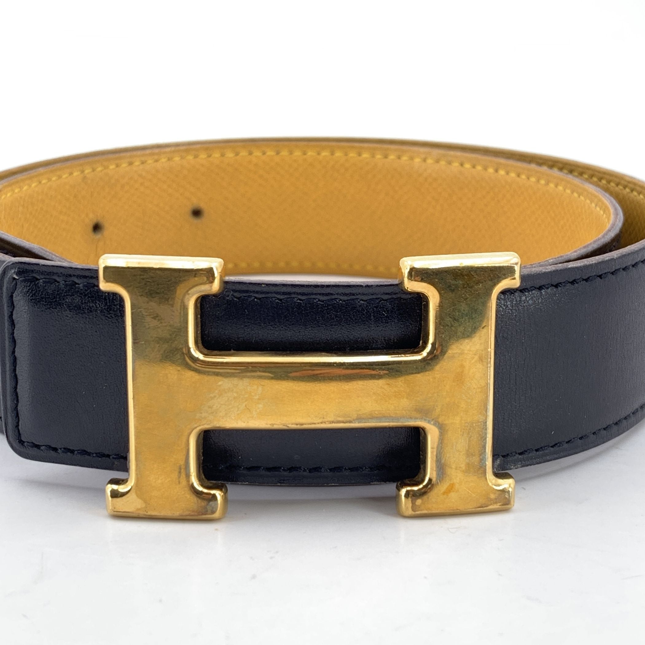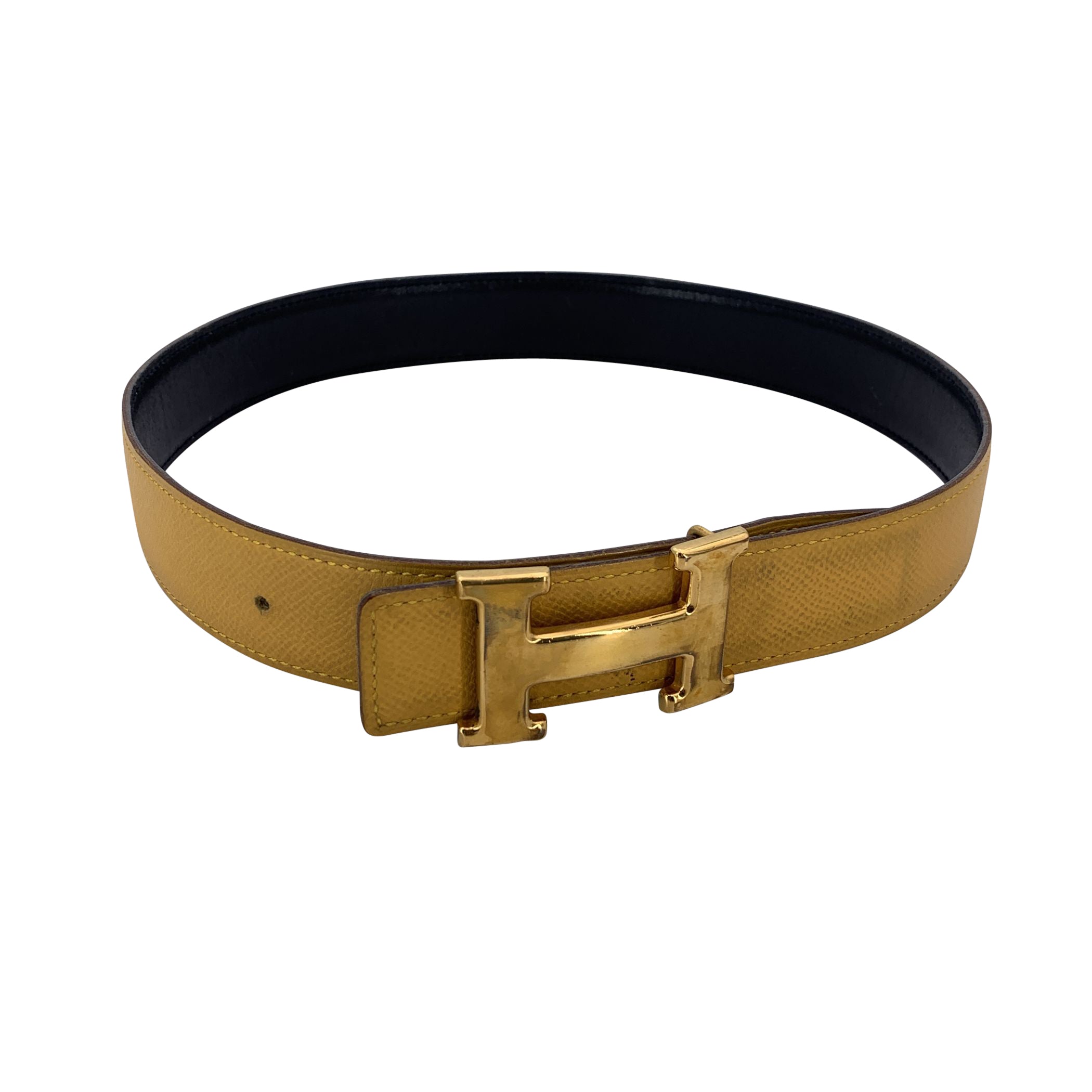 This Hermès Reversible Constance Belt Is a True Symbol Of Timeless Elegance And French Craftsmanship. Made In France During The 1990s, This Belt Combines Versatility, Luxury, And The Iconic Hermès Attention To Detail. This Constance Model Features Reversible Leather, With Sleek Black On One Side And Yellow On The Other, Allowing For Two Distinct Looks In One Accessory. The Gold Metal H Buckle Is Both Classic And Instantly Recognizable, With "Hermès" Engraved On The Buckle. The Tan Side Of The Belt Is Embossed With "Hermès Paris - Made In France", And The A Blind Stamp Encased In a Square Confirms Its Production Year As 1997. Crafted From Fine Leather, The Belt Has a Normal Width, a Buckle Height Of 1.5 Inches (3.81 Cm), And Fits Waists From 24 To 26 Inches (60.96-66.04 Cm), Making It a Perfect Statement Piece For Everyday Elegance. Rated B - Very Good