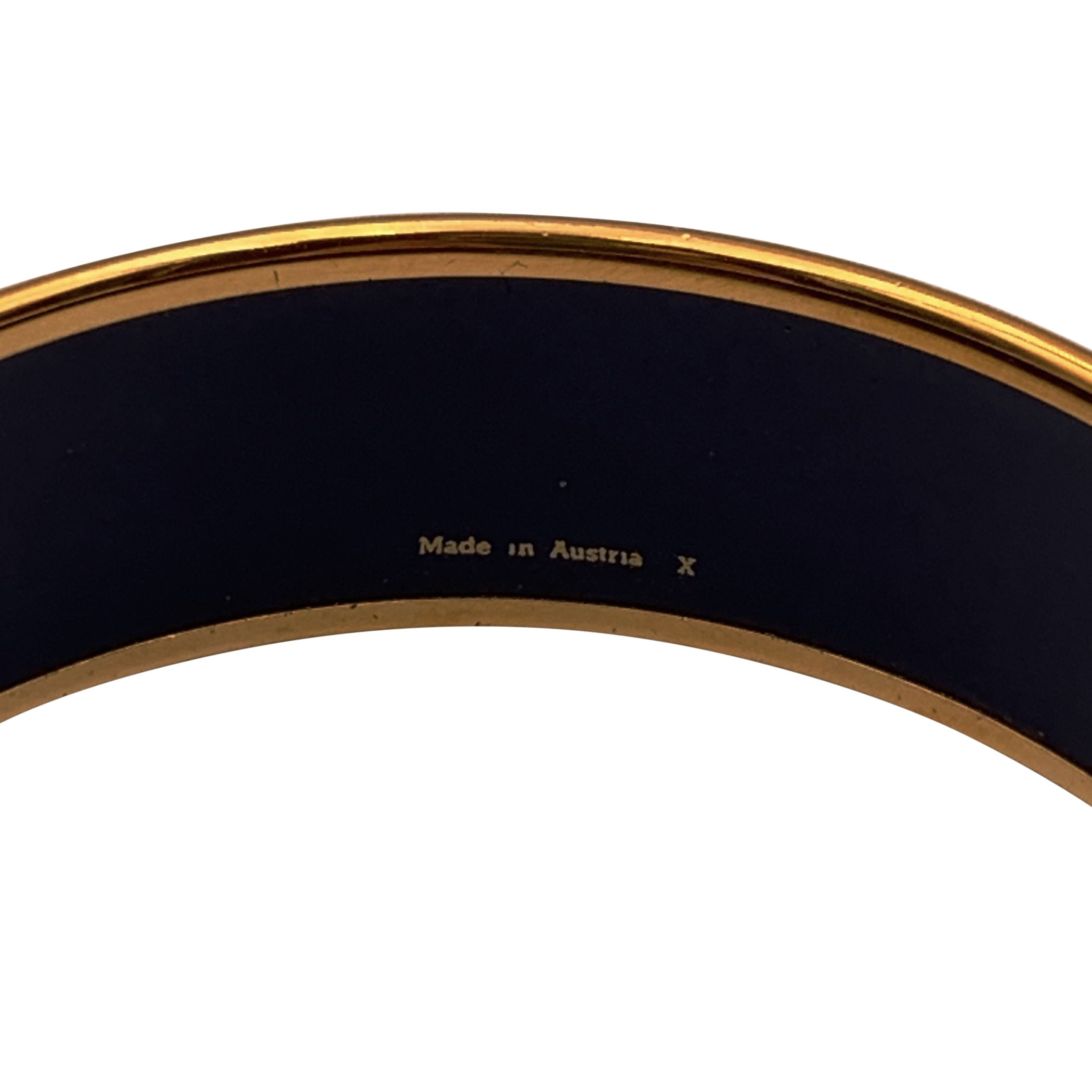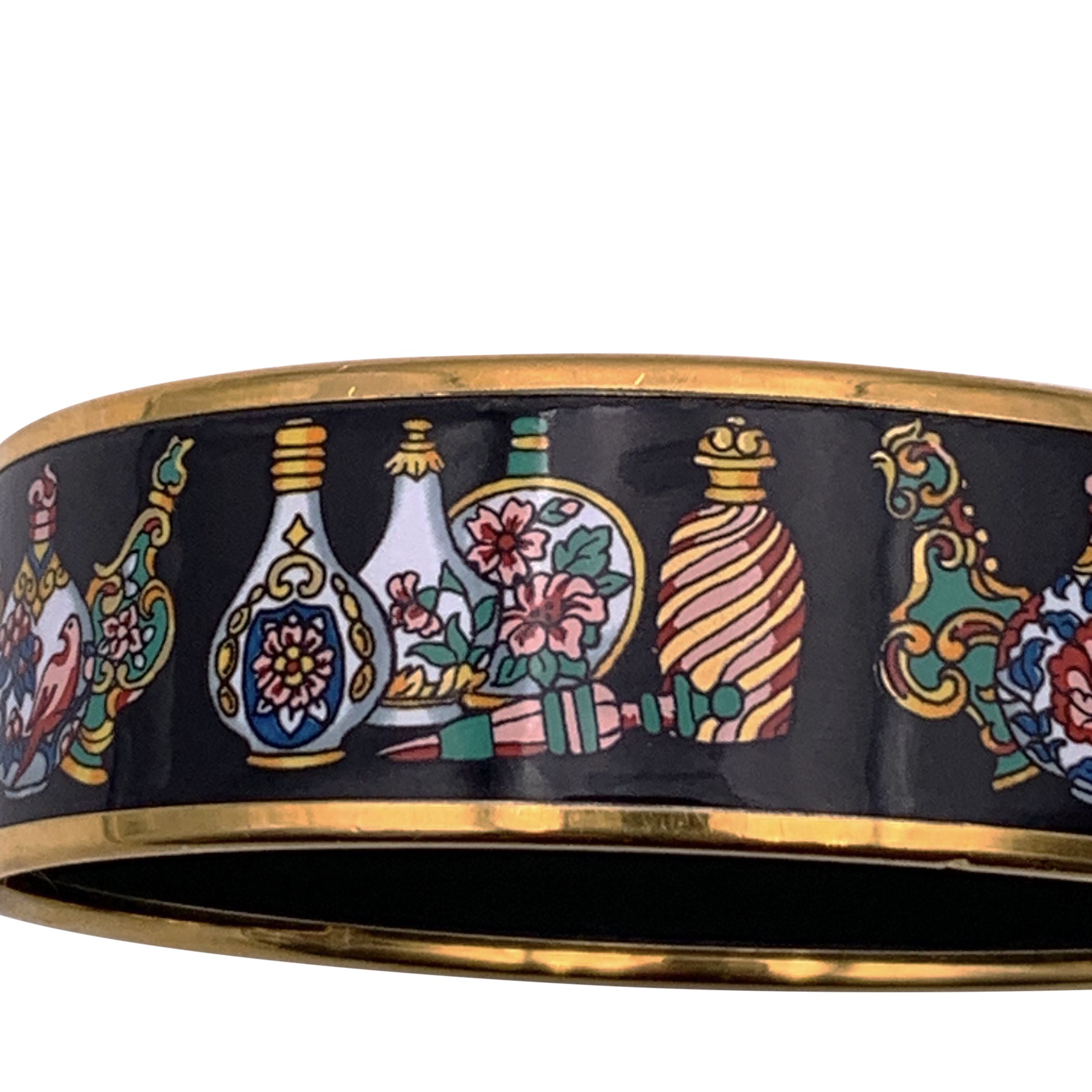 Iconic And Highly Collectible, This Hermès Flacon Enamel Bangle Bracelet Is a Refined Expression Of The Maison's Artistic Heritage And Exceptional Craftsmanship. The Design Showcases Intricate Cloisonné Enamel Artwork Depicting Vintage Perfume Bottles, Framed By Gold- Or Palladium-plated Metal, Creating a Vibrant And Timeless Motif Inspired By Classic Hermès Themes. Crafted As a Rigid Slip-on Bangle, This Piece Features a Clean, Sculptural Silhouette Without a Closure, Emphasizing Its Elegant Structure And Refined Finish. The Rich Enamel Colors And Detailed Graphics Make It a Striking Statement Accessory, Perfect For Elevating Both Casual And Sophisticated Looks. Produced In The 1990s To Early 2000s And Typically Stamped "Hermès Paris" And "Made In Austria", This Flacon Bangle Is a Sought-after Collectible, Prized For Its Durability, Artistry, And Unmistakable Hermès Style. Designed To Fit Wrists Up To Approximately 7.3 Inches (18.5 Cm),