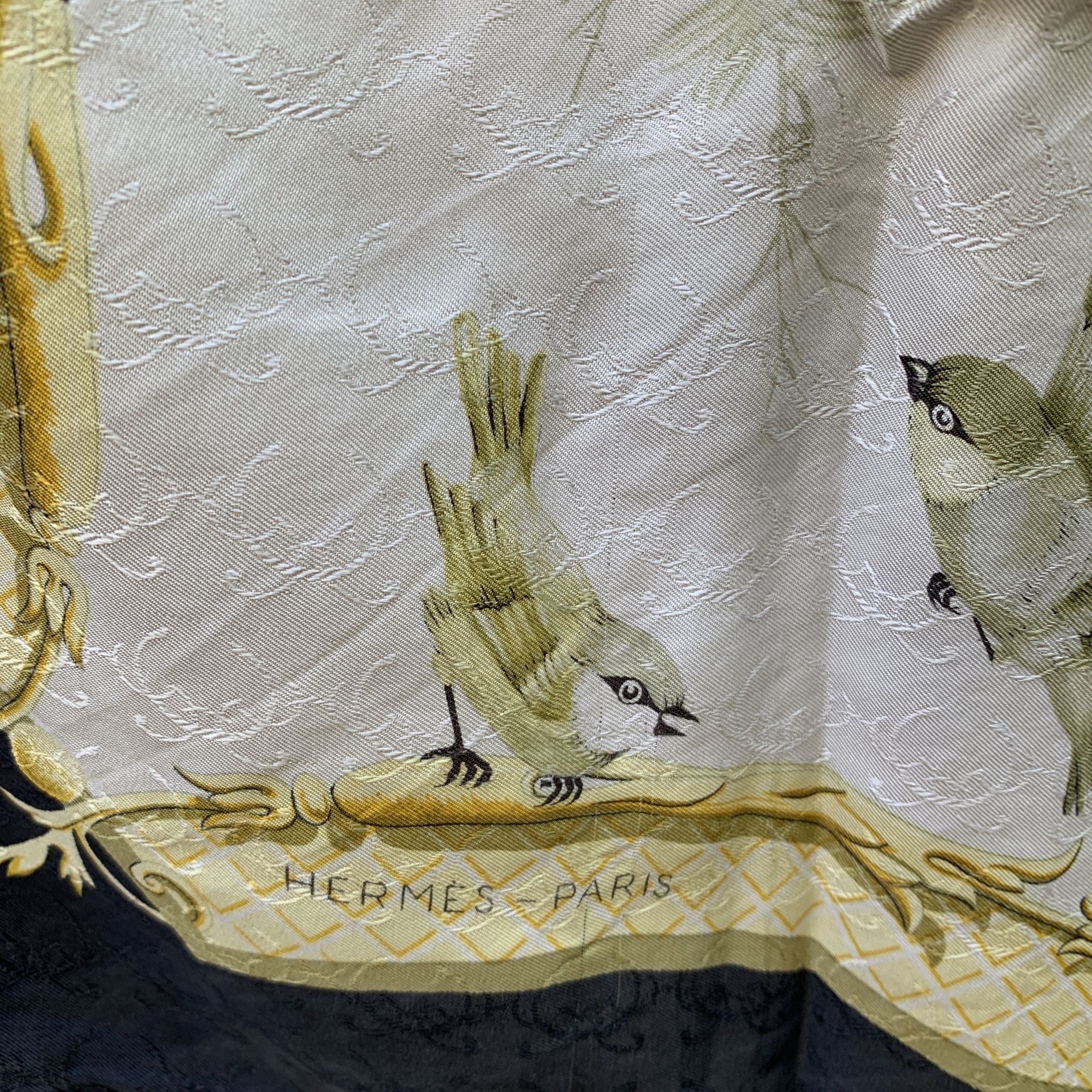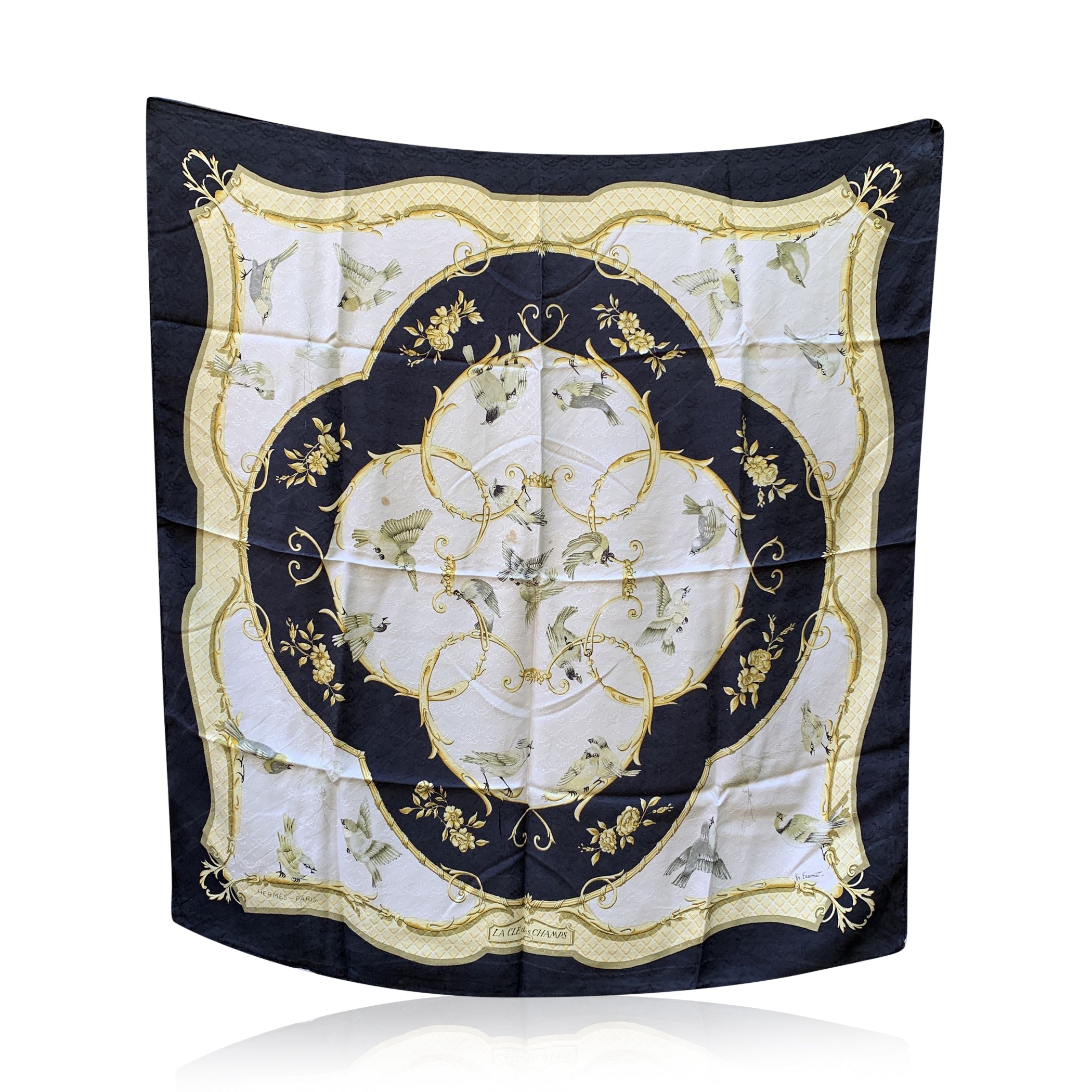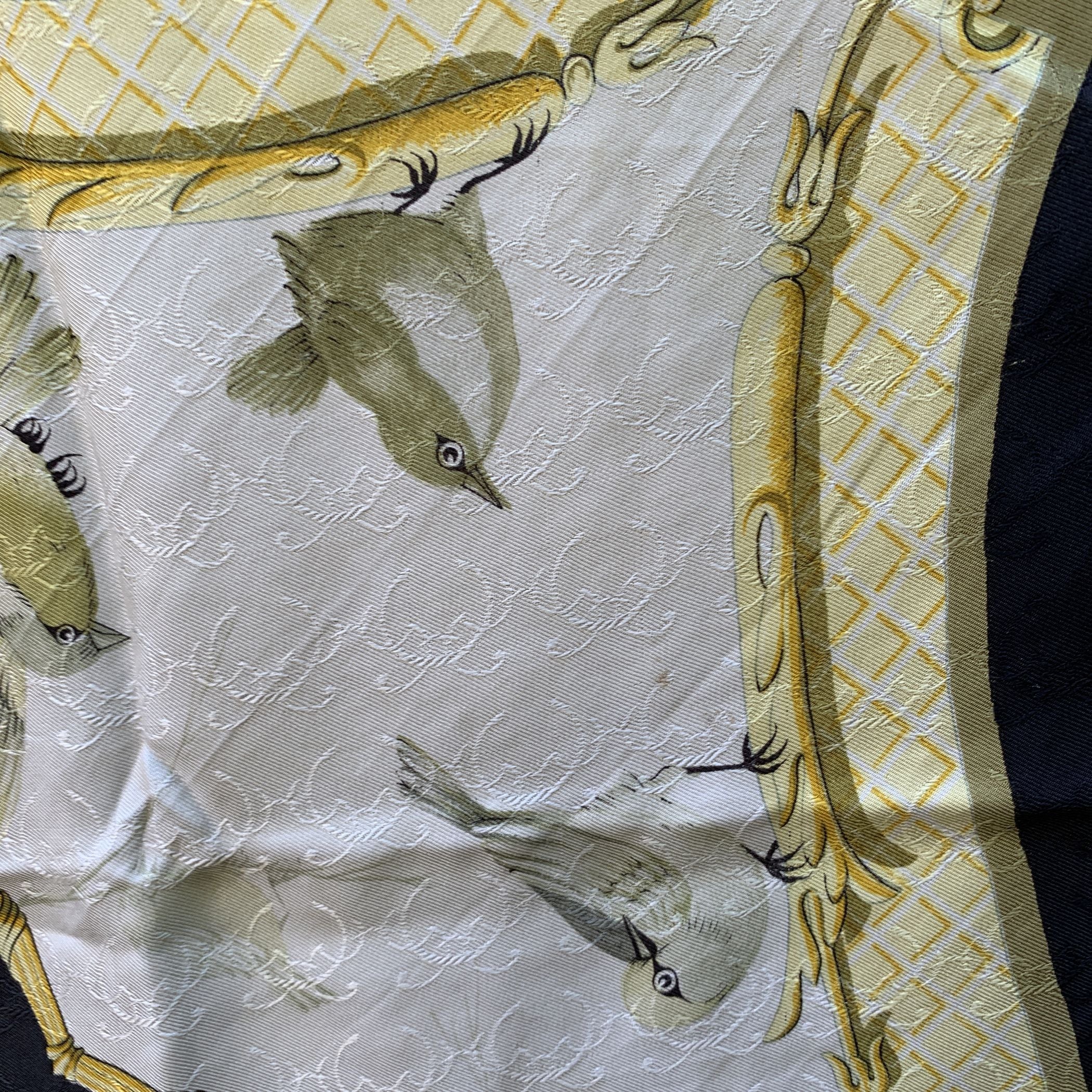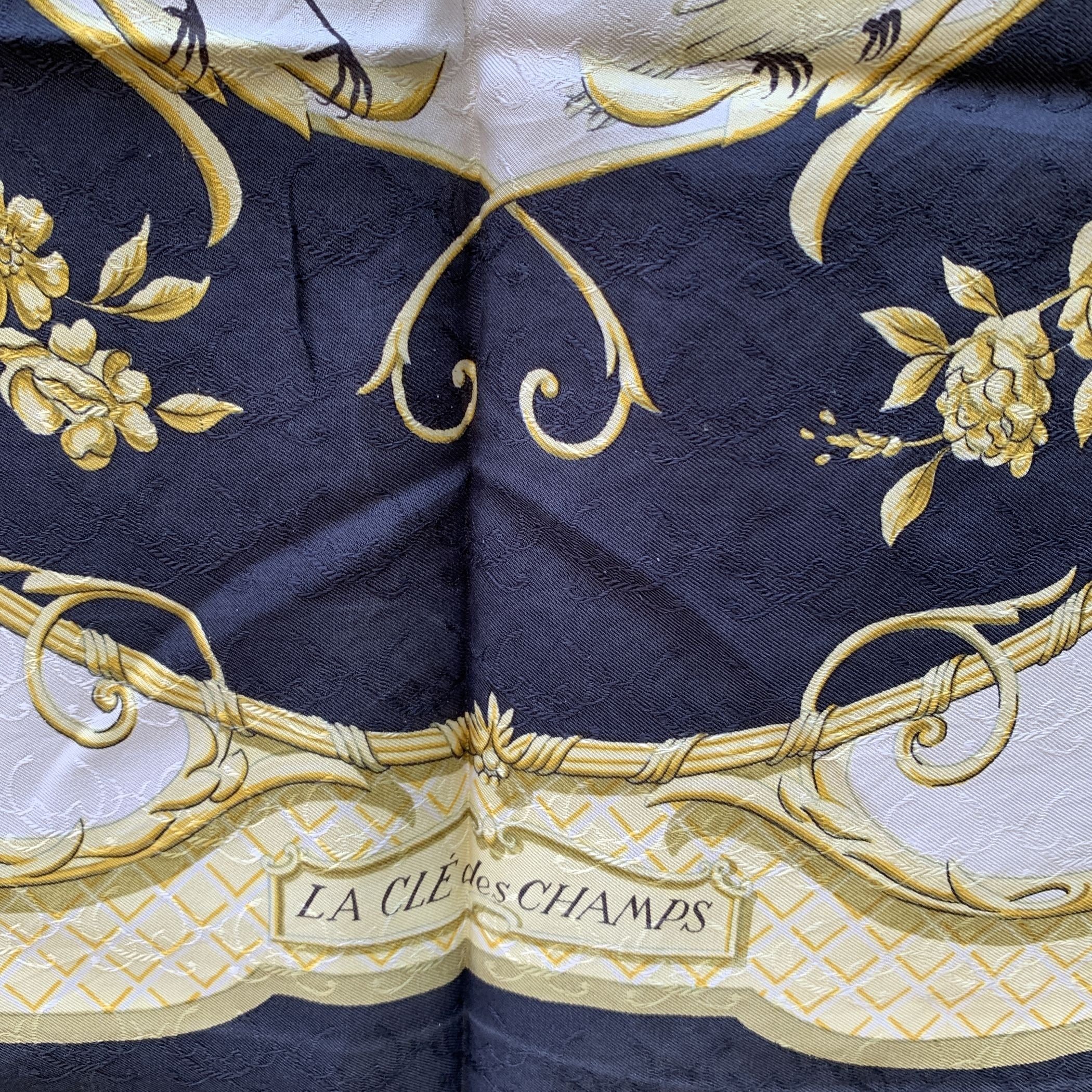 Step Back Into a Moment Of Timeless Elegance With This Vintage Hermes Scarf, La Clé Des Champs-a Name That Beautifully Captures The Essence Of Freedom And Escape, Rooted In An Old French Metaphor Meaning "The Key To The Countryside." Designed By The Talented Françoise Faconnet And First Introduced In 1965, This Exquisite Piece Is a Rare Gem From An Era When Craftsmanship Was Paramount. Woven Entirely From 100% Jacquard Silk, The Scarf Features a Captivating Color Palette Of White, Black, And Sunny Yellow, Adorned With Delicate Flying Birds That Seem To Dance Across The Fabric. The Rich Jacquard Weave Adds a Subtle Swirl Pattern Beneath The Design, Giving The Scarf a Textured Depth And Luxurious Feel That Is Unmistakably Hermes. What Makes This Scarf Truly Special Is Its Rarity. Hermes Discontinued The Use Of This Lavish Woven Silk Fabric In The 1990s Due To The High Cost Of Production, Making Surviving Scarves Like This a Coveted Collector's Item. Look Closely, And You'll Find The Iconic 'Hermès - Paris' Signature Discreetly Placed In The Lower Right Quadrant-a Mark Of Authenticity And Heritage. This Scarf Isn't Just An Accessory; It's a Piece Of History, a Symbol Of Liberty, And a Whisper Of The French Countryside-all Woven Into Silk And Artistry.