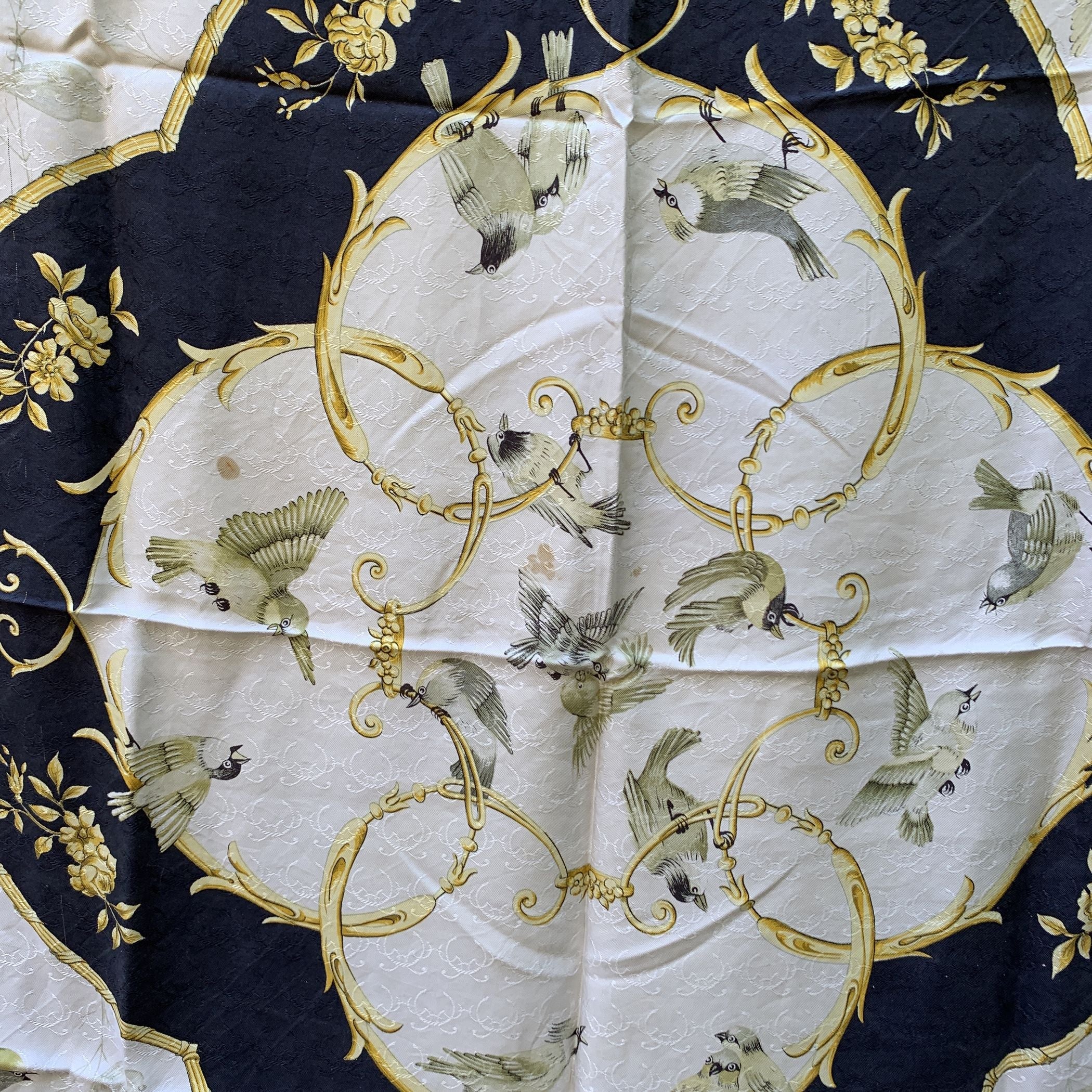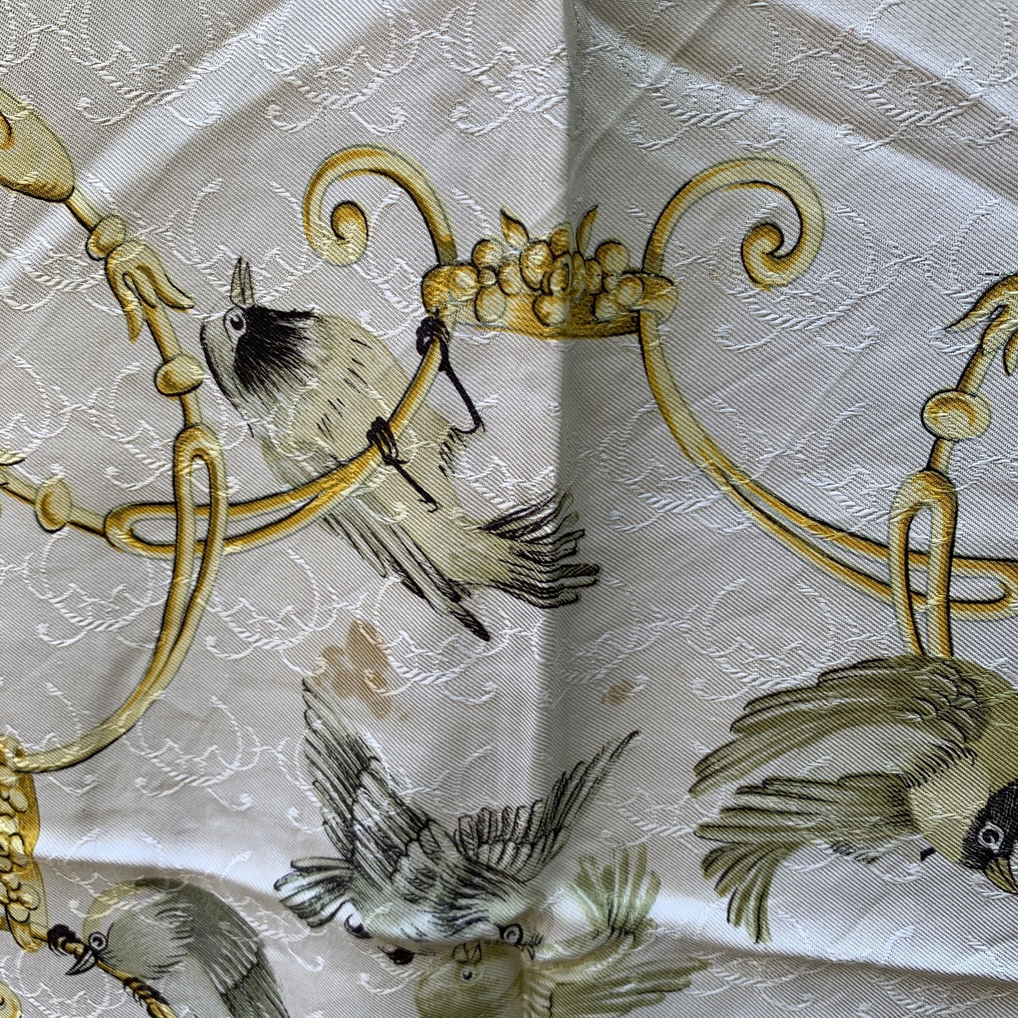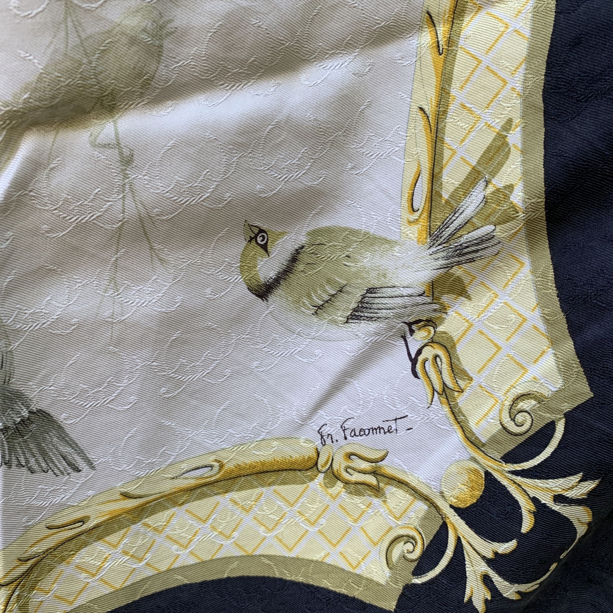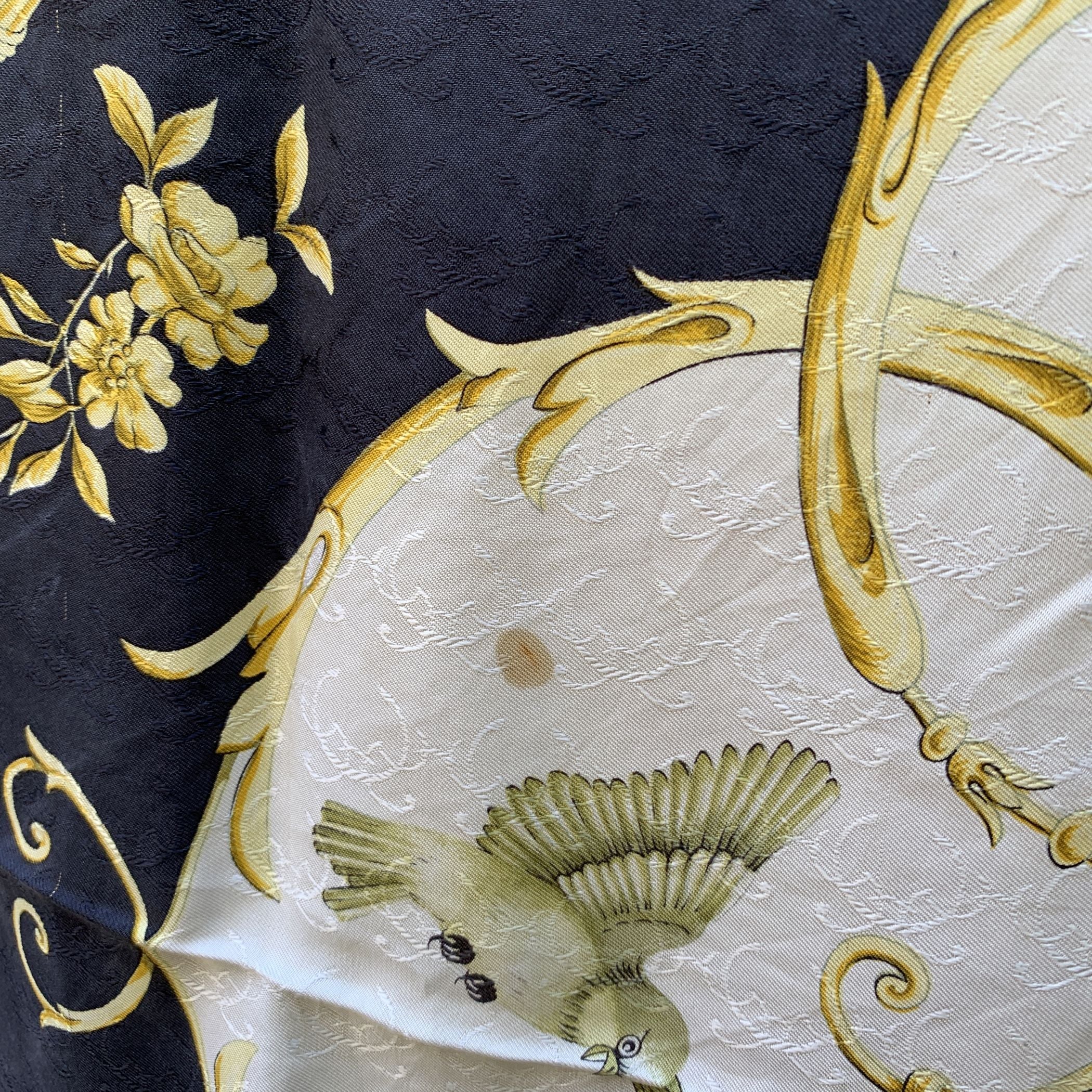 Step Back Into a Moment Of Timeless Elegance With This Vintage Hermes Scarf, La Clé Des Champs-a Name That Beautifully Captures The Essence Of Freedom And Escape, Rooted In An Old French Metaphor Meaning "The Key To The Countryside." Designed By The Talented Françoise Faconnet And First Introduced In 1965, This Exquisite Piece Is a Rare Gem From An Era When Craftsmanship Was Paramount. Woven Entirely From 100% Jacquard Silk, The Scarf Features a Captivating Color Palette Of White, Black, And Sunny Yellow, Adorned With Delicate Flying Birds That Seem To Dance Across The Fabric. The Rich Jacquard Weave Adds a Subtle Swirl Pattern Beneath The Design, Giving The Scarf a Textured Depth And Luxurious Feel That Is Unmistakably Hermes. What Makes This Scarf Truly Special Is Its Rarity. Hermes Discontinued The Use Of This Lavish Woven Silk Fabric In The 1990s Due To The High Cost Of Production, Making Surviving Scarves Like This a Coveted Collector's Item. Look Closely, And You'll Find The Iconic 'Hermès - Paris' Signature Discreetly Placed In The Lower Right Quadrant-a Mark Of Authenticity And Heritage. This Scarf Isn't Just An Accessory; It's a Piece Of History, a Symbol Of Liberty, And a Whisper Of The French Countryside-all Woven Into Silk And Artistry.