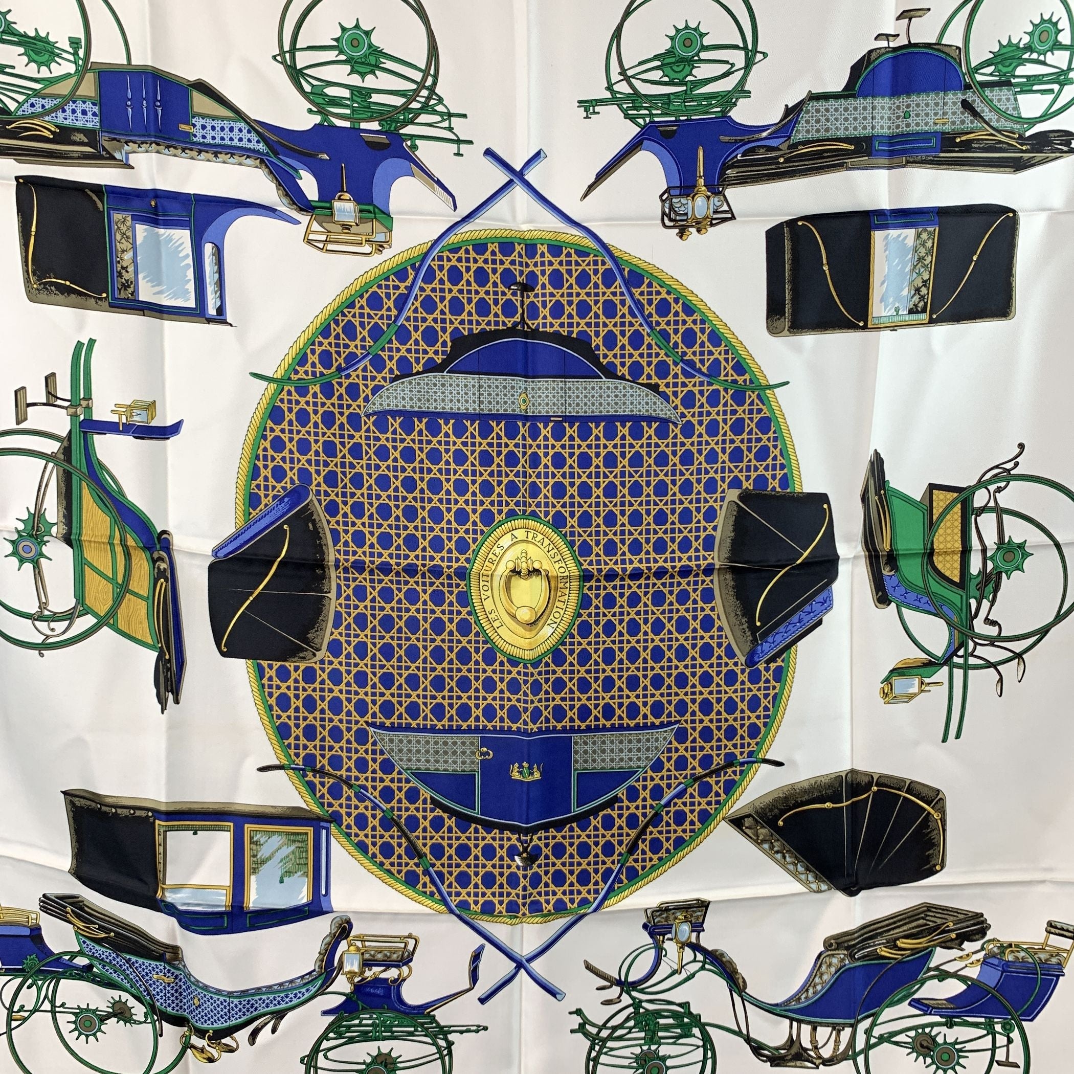 Step Into The World Of Vintage Luxury With The Hermès 'Les Voitures à Transformation' Silk Scarf, a True Classic Designed By Françoise De La Perrière And First Issued In 1965. This Iconic Design Has Been Re-issued Multiple Times In a Variety Of Colors, Formats, And Variations, Solidifying Its Status As One Of The Timeless Masterpieces Of The Hermès Maison. The Scarf Features An Elegant Blue Border, With Intricate Depictions Of Transformable Carriages - a Playful Nod To The Evolution Of Transportation, Blending Historical References With Sophisticated Artistry. The Design Encapsulates a Sense Of Movement And Transformation, Offering a Unique Narrative Woven Into The Luxurious Fabric. With Approximate Measurements Of 35 x 35 Inches (88.8 x 88.8 Cm), This Scarf Is Perfectly Sized For Wearing In a Variety Of Styles, Whether As a Neck Scarf, Headscarf, Or Even Framed As a Stunning Art Piece. The 'Hermès Paris' Logo Is Discreetly Printed In The Lower Center. Whether You're a Collector Of Fine Hermès Scarves Or Simply Someone Who Appreciates Classic Design, The 'Les Voitures à Transformation' Is An Essential Piece That Brings Timeless Style And Elegance To Any Wardrobe.