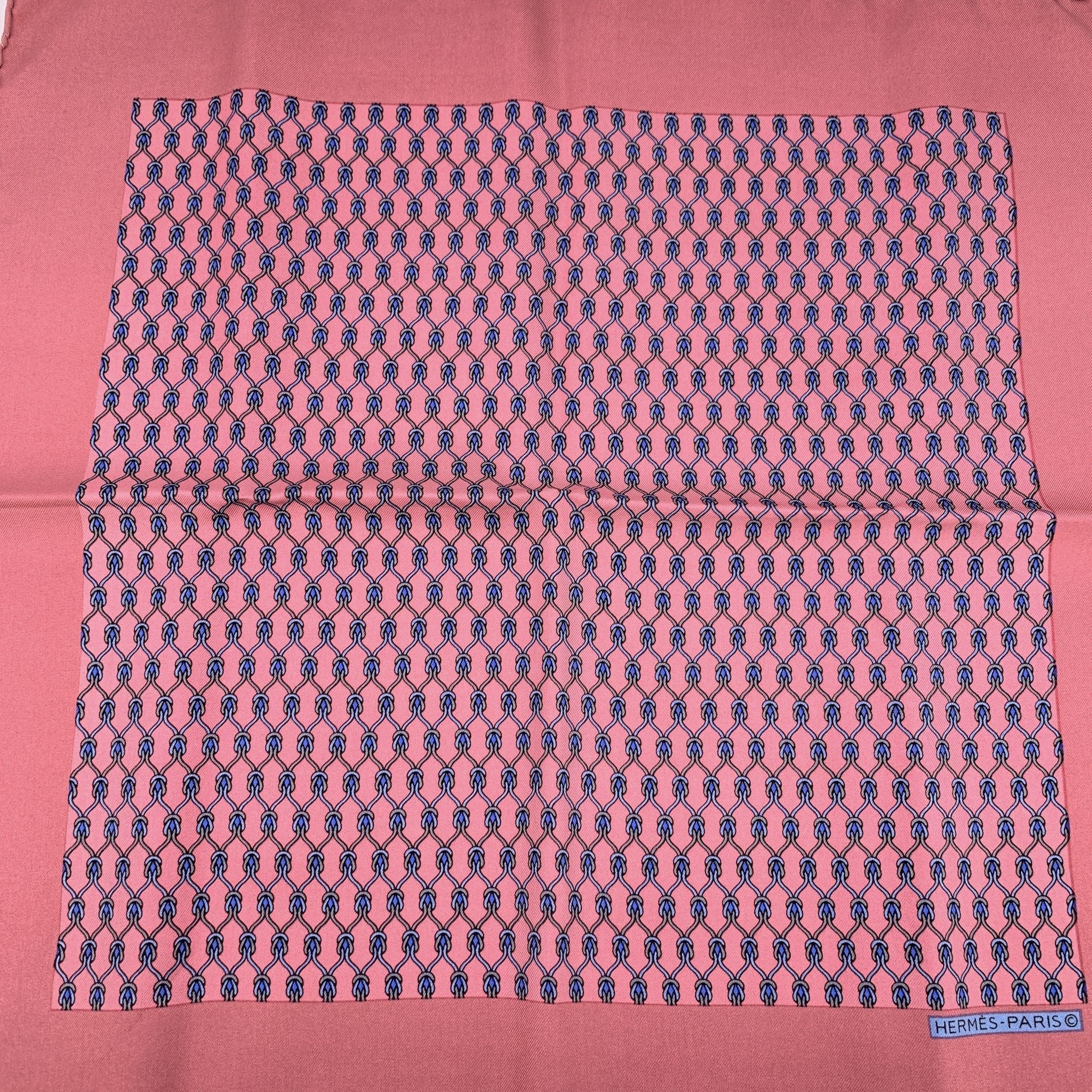 Charming Hermès Silk Pocket Square Featuring An Adorable Blue Knots Print Set Against a Soft Pink Background. Crafted From 100% Vintage Silk Twill, It Showcases The Maison's Renowned Artistry And Attention To Detail, Complete With Hand-rolled Edges That Highlight Its Refined Craftsmanship. This Versatile Accessory Adds a Touch Of Color And Playful Elegance To Any Look-perfect Tucked Into a Blazer Pocket Or Styled As a Neck Scarf. Made In France. Dimensions: Approximately 17 x 17 Inches (43 x 43 Cm).
