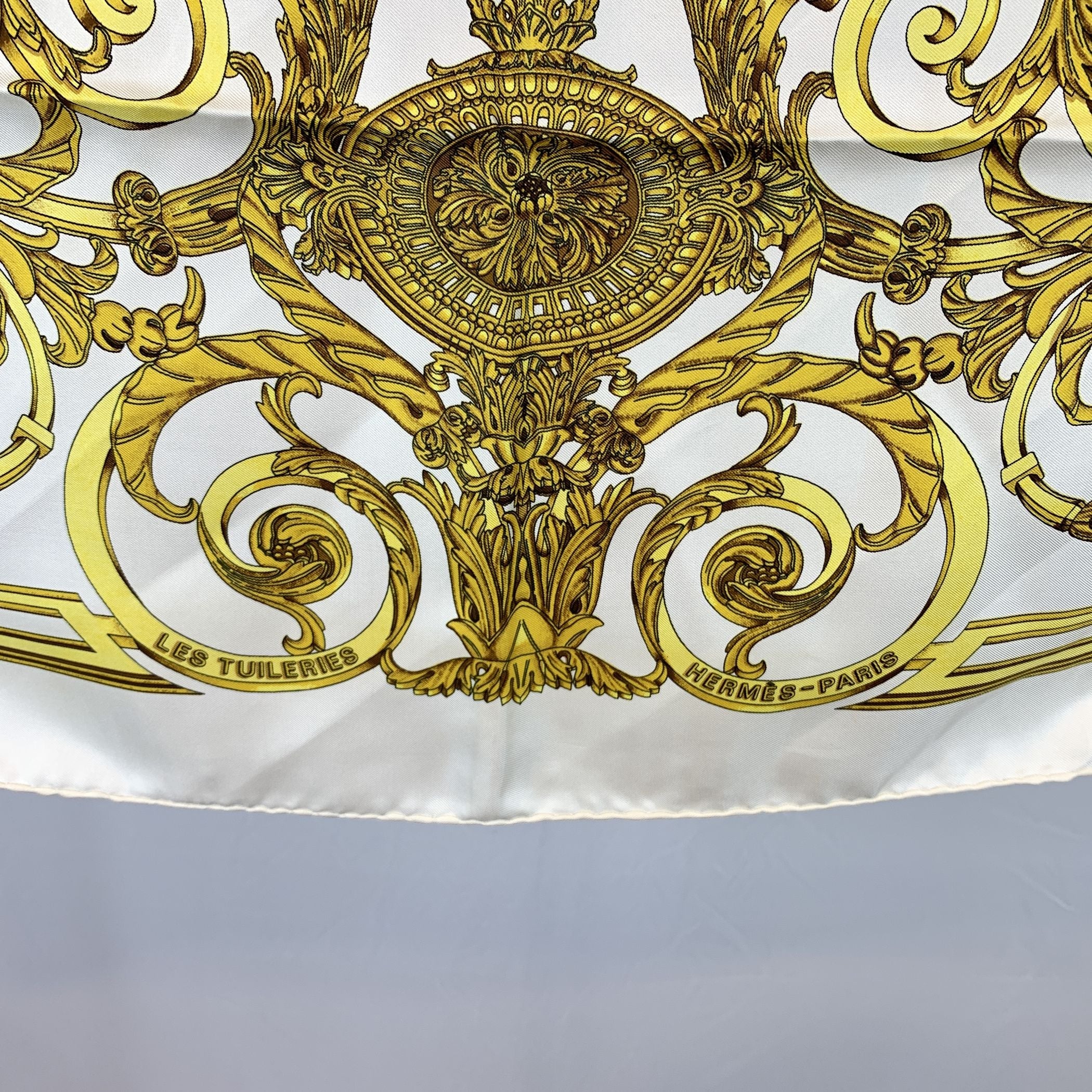 Step Into The Elegance Of Early 1990s Paris With This Exquisite Hermès Vintage Les Tuileries Scarf, a Timeless Tribute To French Artistry, Crafted In Luxurious White Silk Twill. Designed By The Renowned Joachim Metz And Released In The Spring Season Of The 1990s, This Carre 90 Square Is Not Merely An Accessory-it's a Wearable Story Steeped In Culture And Refinement. Titled "Les Tuileries," The Scarf Honors The Famed Parisian Gardens That Once Graced The Royal Palace Grounds. Metz's Intricate Design Captures The Romantic Spirit Of The Tuileries, Woven Into Flowing Lines And Elegant Motifs, All Resting Delicately On a Pristine White Canvas. Measuring Approximately 35 x 35 Inches (88.9 x 88.9 Cm), The Scarf Is Crafted In France From 100% Silk And Finished With Classic Hand-rolled Hems. Hermès Copywrite Is Delicately Printed On The Scarf, a Subtle Mark Of Authenticity And Heritage. The Iconic "Hermès Paris" Signature Is Featured Along The Lower Edge, Anchoring The Design With Timeless Sophistication. The Original Composition Tag Remains Attached, Underscoring The Scarf's Excellent Preserved