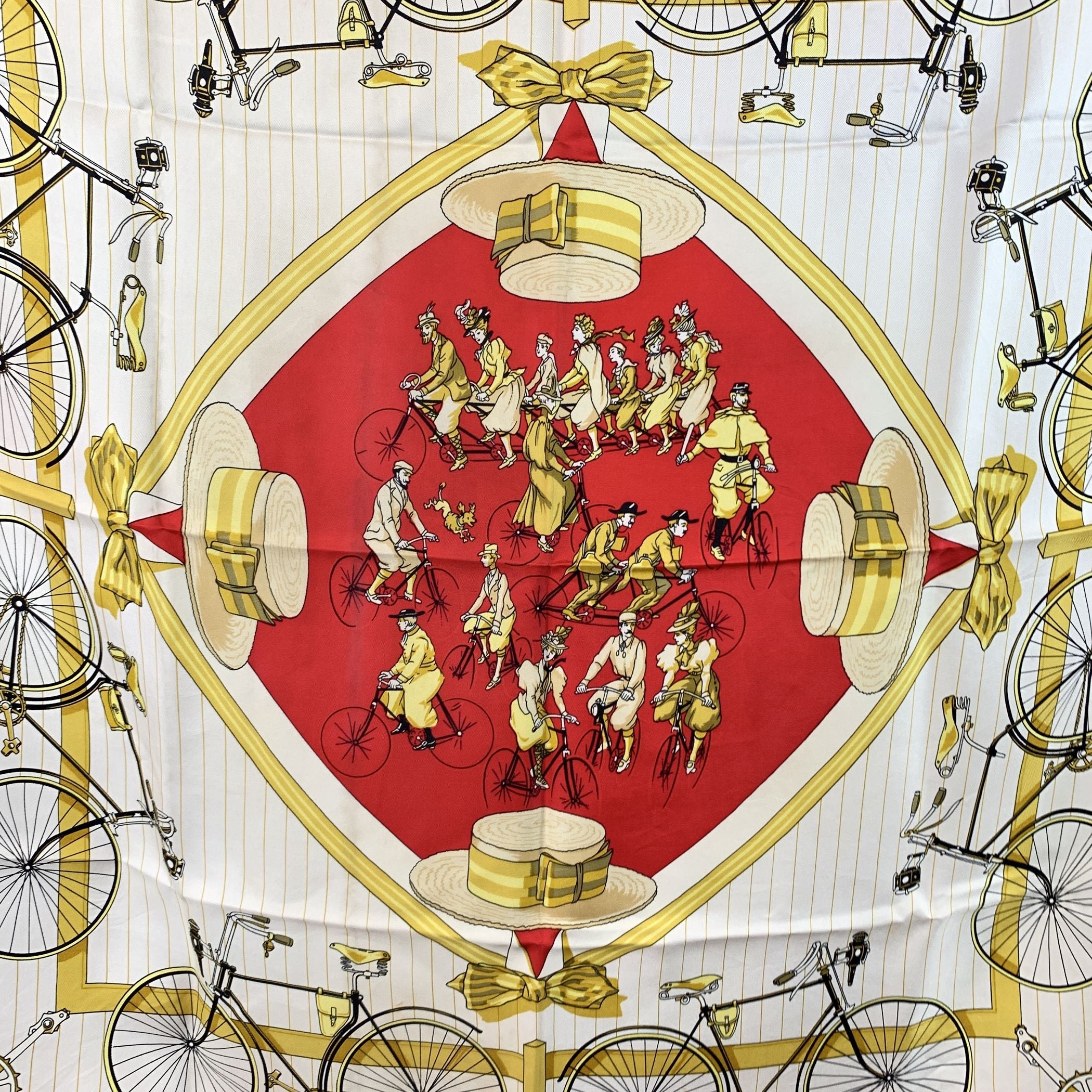 Step Into The Elegance Of The Belle Époque With This Rare Les Bécanes Silk Scarf, Designed By Hugo Grygkar For Hermès. Originally Launched In 1954, This Vintage Gem Pays Homage To An Era When The Bicycle Became Not Only a Practical Mode Of Transport But Also a Symbol Of Leisure And Joy. Reprinted Over The Years In 1973, 1990, And 2003, It Remains a Beloved Piece In Hermès' Iconic Collection, Still Available Today For 395 Euros. The Scarf Elegantly Captures a Parisian Scene From The Late 19th Century, Where Families Ride On Tandems, Policemen Cycle Through The Streets, And Fashionable Men And Women Enjoy a Sunday Outing In Their Period-appropriate Attire. Framing The Central Scene Are Four Charming Straw Hats, Surrounded By Antique Bicycles In Intricate Detail. The Vibrant Red Edges Offer a Striking Contrast To The Soft, Pastel Hues Of The Design, Making It An Eye-catching Statement Piece. Crafted From 100% Silk And Finished With a Hand-rolled Hem, This Scarf Reflects The Exceptional Craftsmanship Hermès Is Known For. The Hermès Paris Signature With The Copyright Symbol Affirms Its Authenticity And Heritage. Perfect For Collectors And Those Who Appreciate The Intersection Of History And Fashion, The Les Bécanes Scarf Is a Timeless Tribute To a Golden Age In Both Cycling And Parisian Life, Offering a Glimpse Into The Lighthearted Spirit Of The Belle Époque.