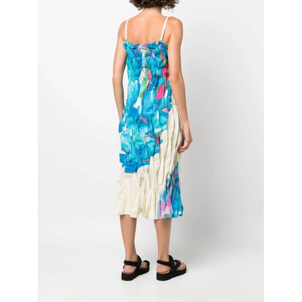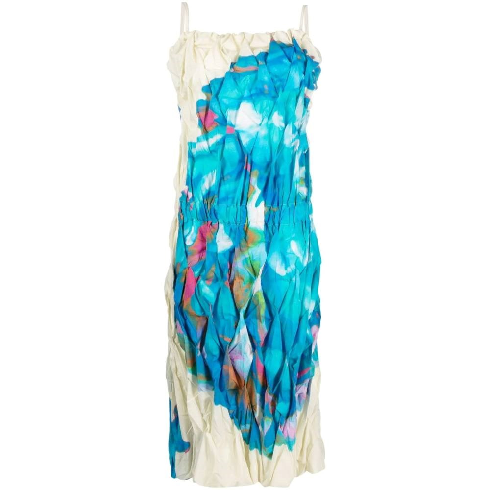 2000s Issey Miyake multicolor pleated midi dress. Watercolor effect pattern on a ivory base, gathered and elastic collar, adjustable thin straps, pleated and elastic waist detail and irregular hem. Side opening with visible buttons.