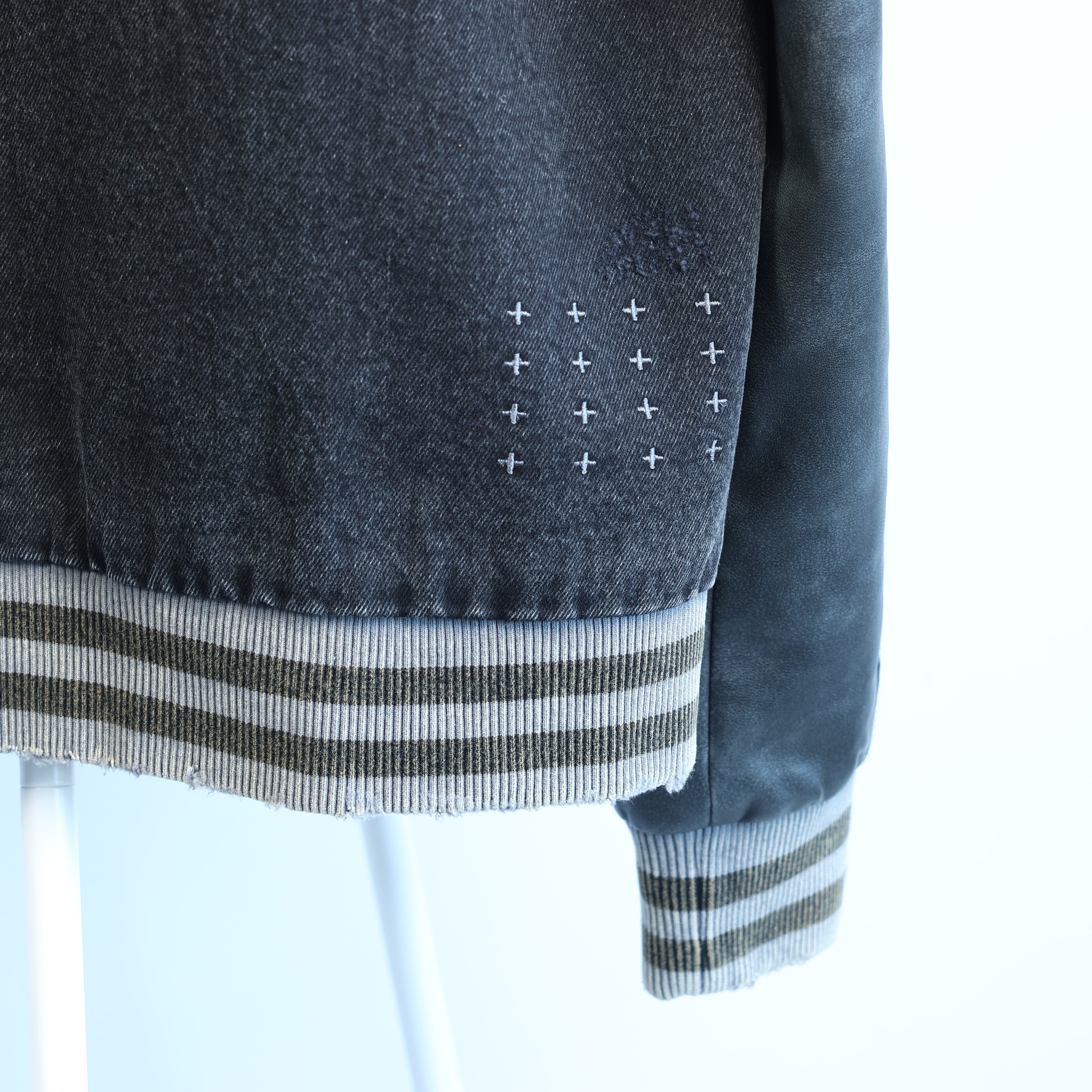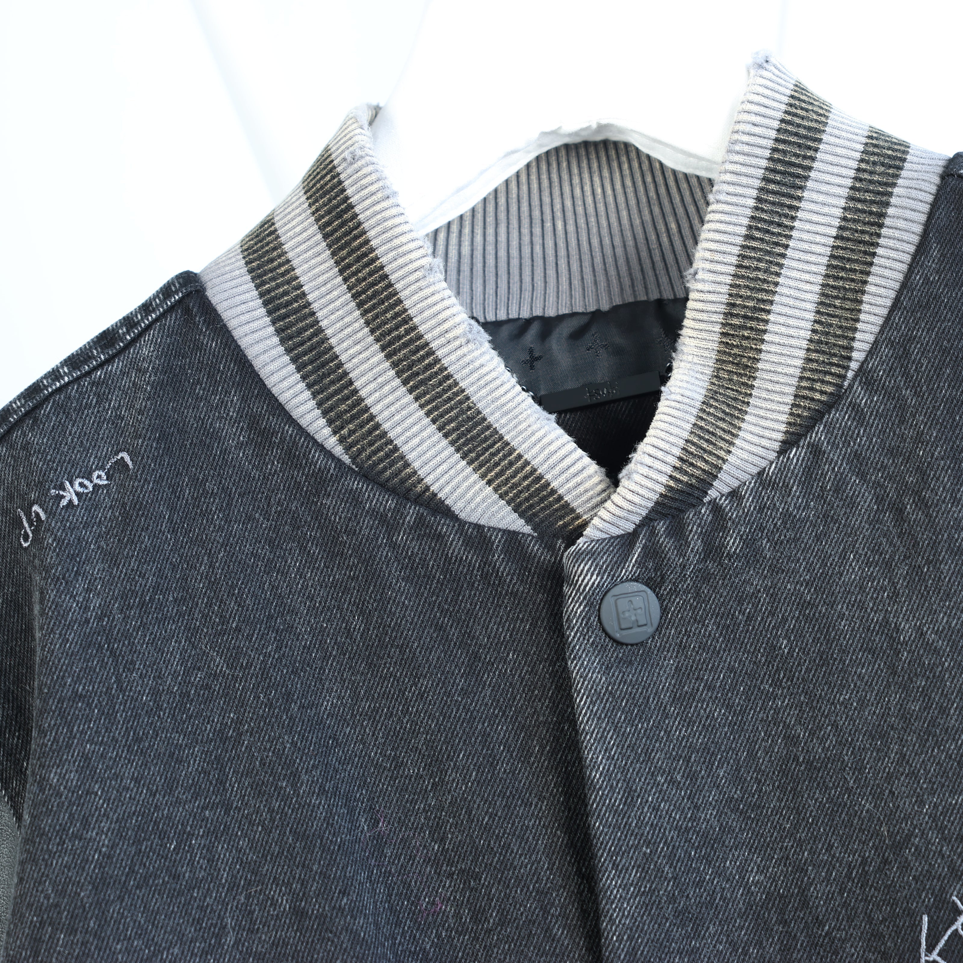 Ksubi Skribed King varsity jacket in black, size M. A statement piece with contrast grey sleeves, embroidered text details, and striped ribbed trims — the perfect fusion of rebellious streetwear and luxury craftsmanship.Brand: KsubiSize: MLength: 69 cm Shoulder width: 44 cmBust width: 56 cmSleeve lenght: 70 cmCondition: Never worn, with tagCondition Details: -Main colour: BlackColours: -Material: ClothComes With: Brand tag