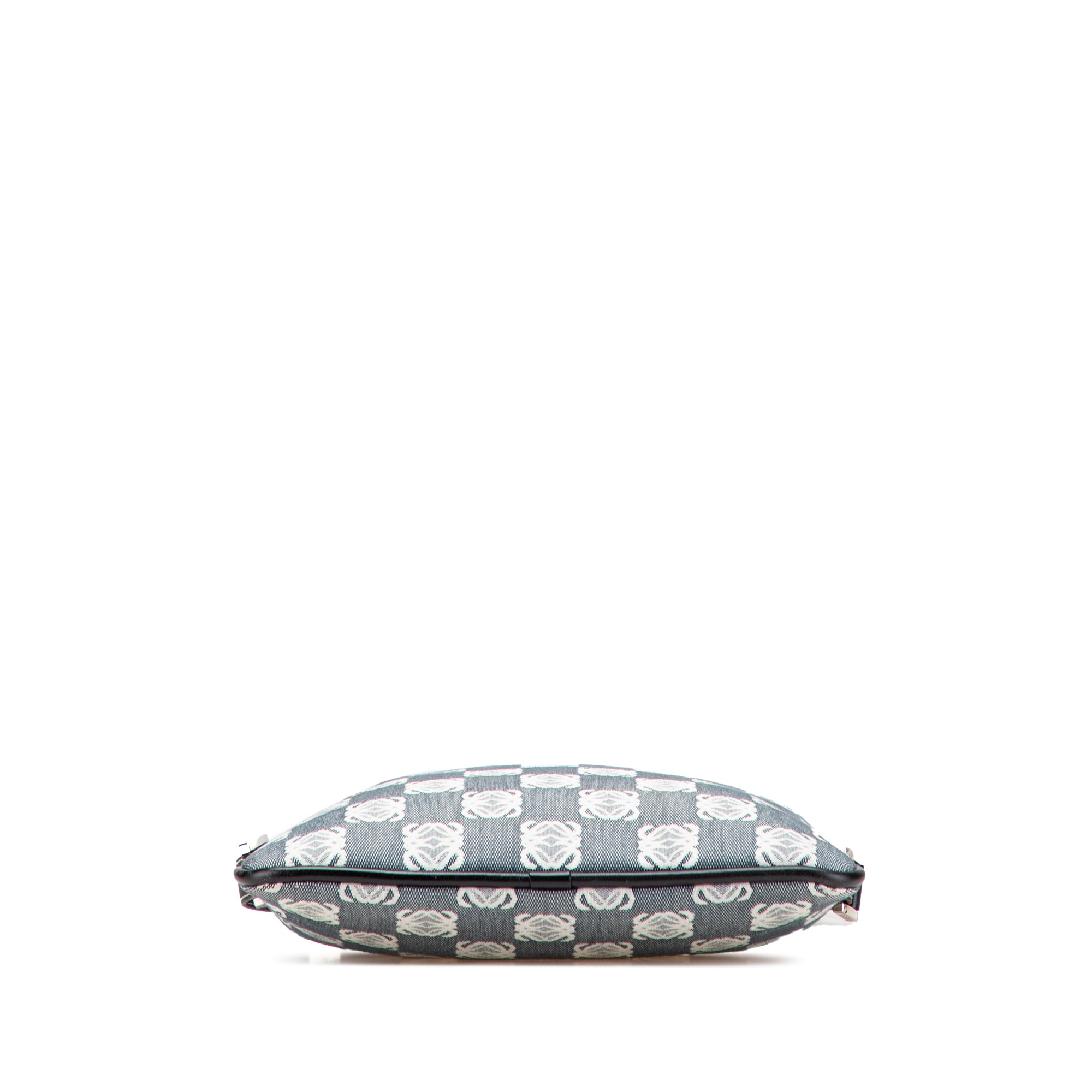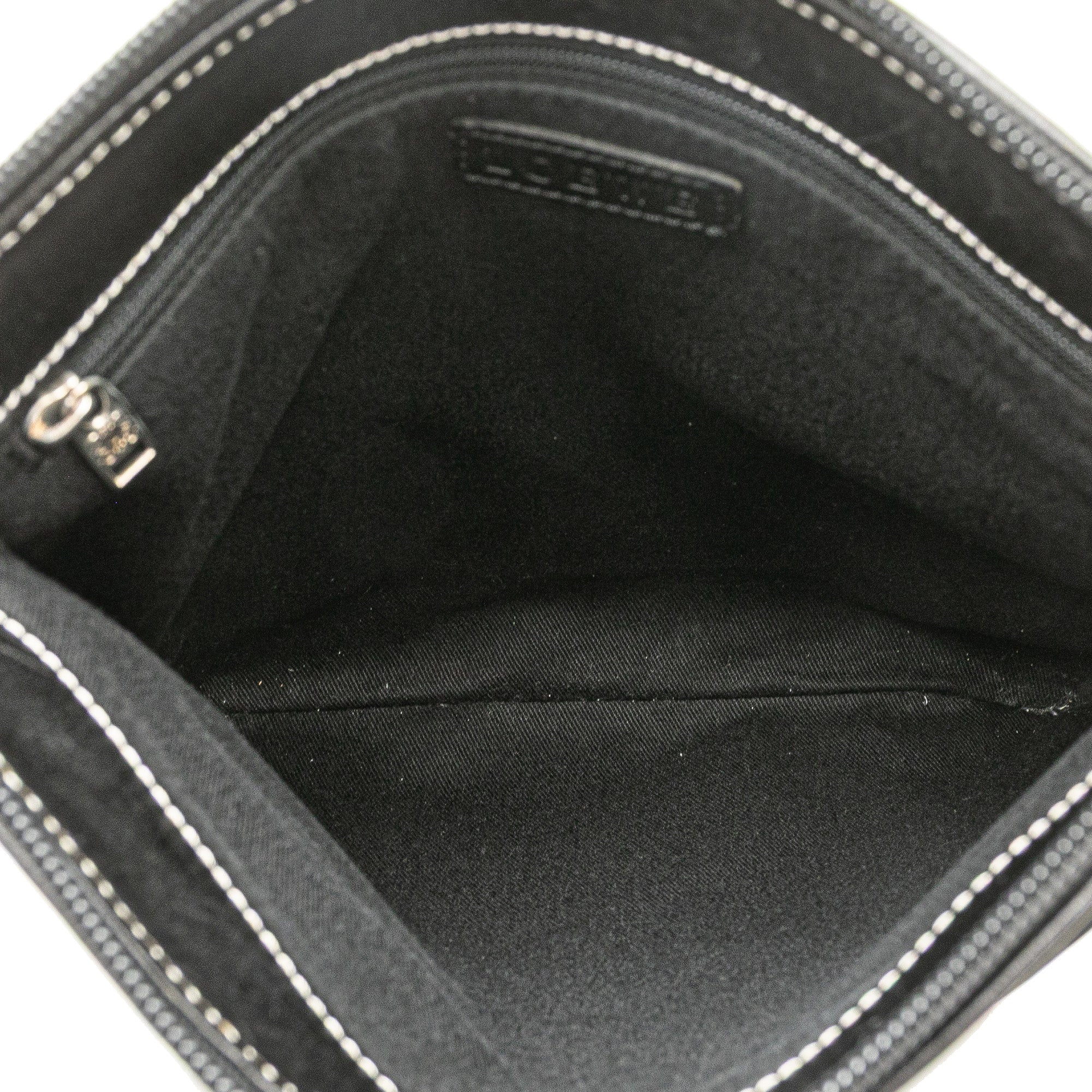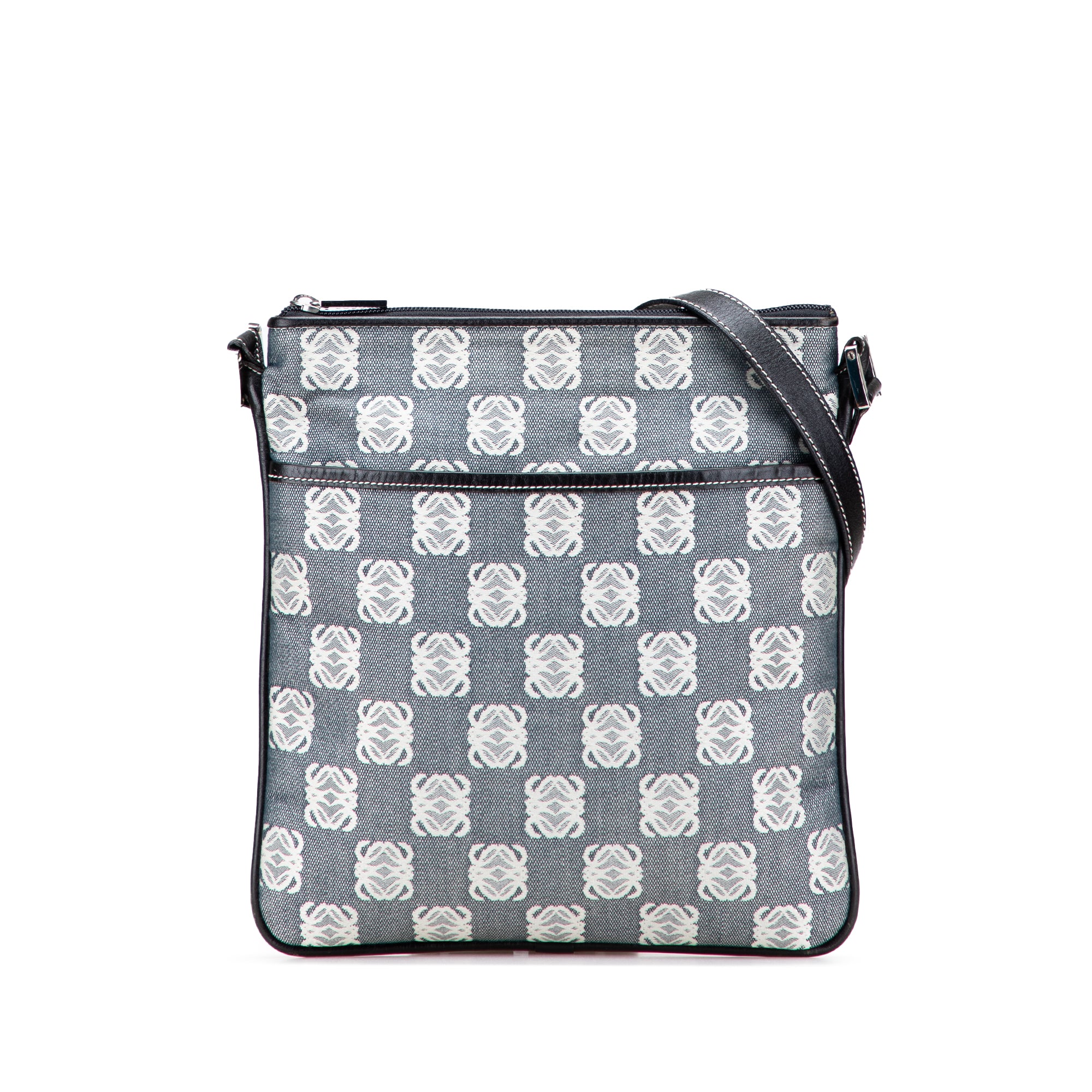 This crossbody bag features a canvas body with leather trim, an adjustable flat leather shoulder strap, a top zip closure, an exterior front slip pocket, and an interior zip pocket. Retail Price: 500.00