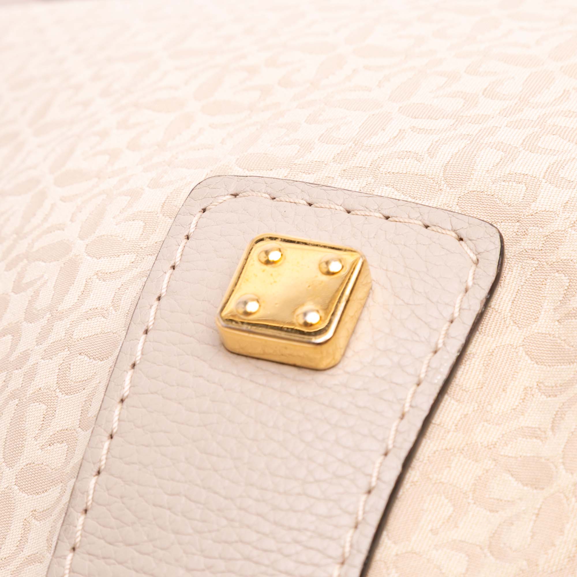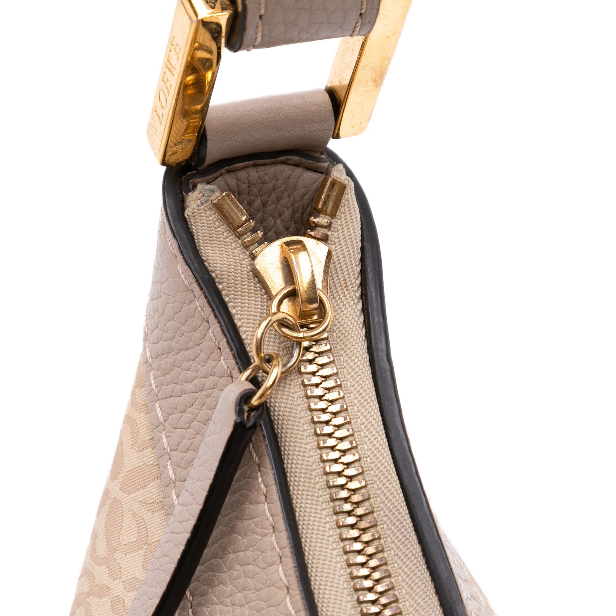 This hobo bag features a canvas body with leather trim, a flat leather strap, a top zip closure, and interior zip and slip pockets. Retail Price: 1250.00