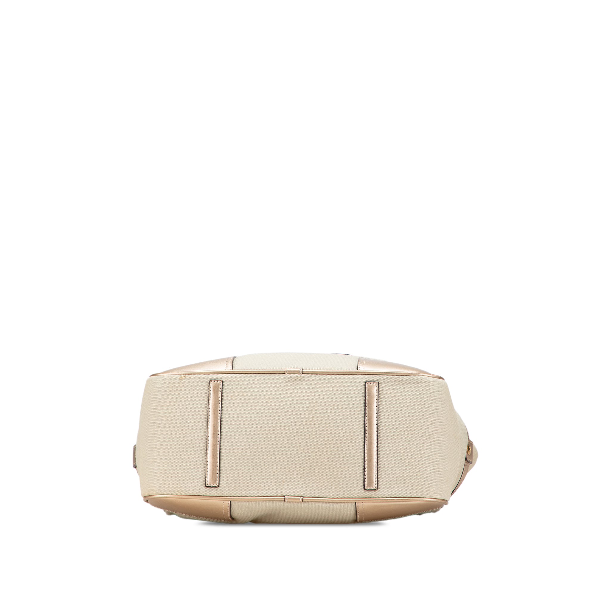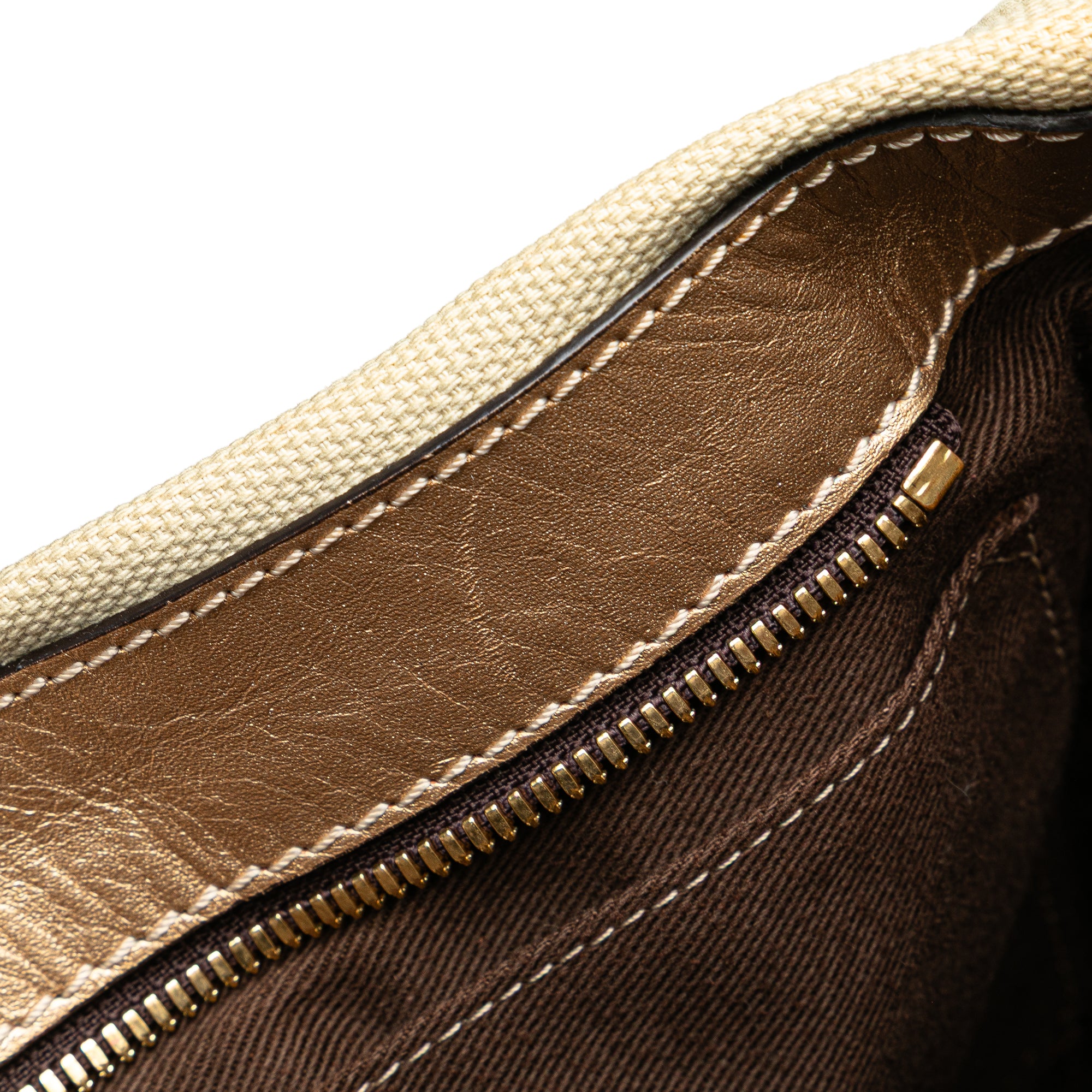 This satchel features a canvas body with leather trim, flat leather handles, a detachable flat strap, a top zip closure, exterior side slip pockets with snap closure, and interior zip and slip pockets. Retail Price: 1245.00