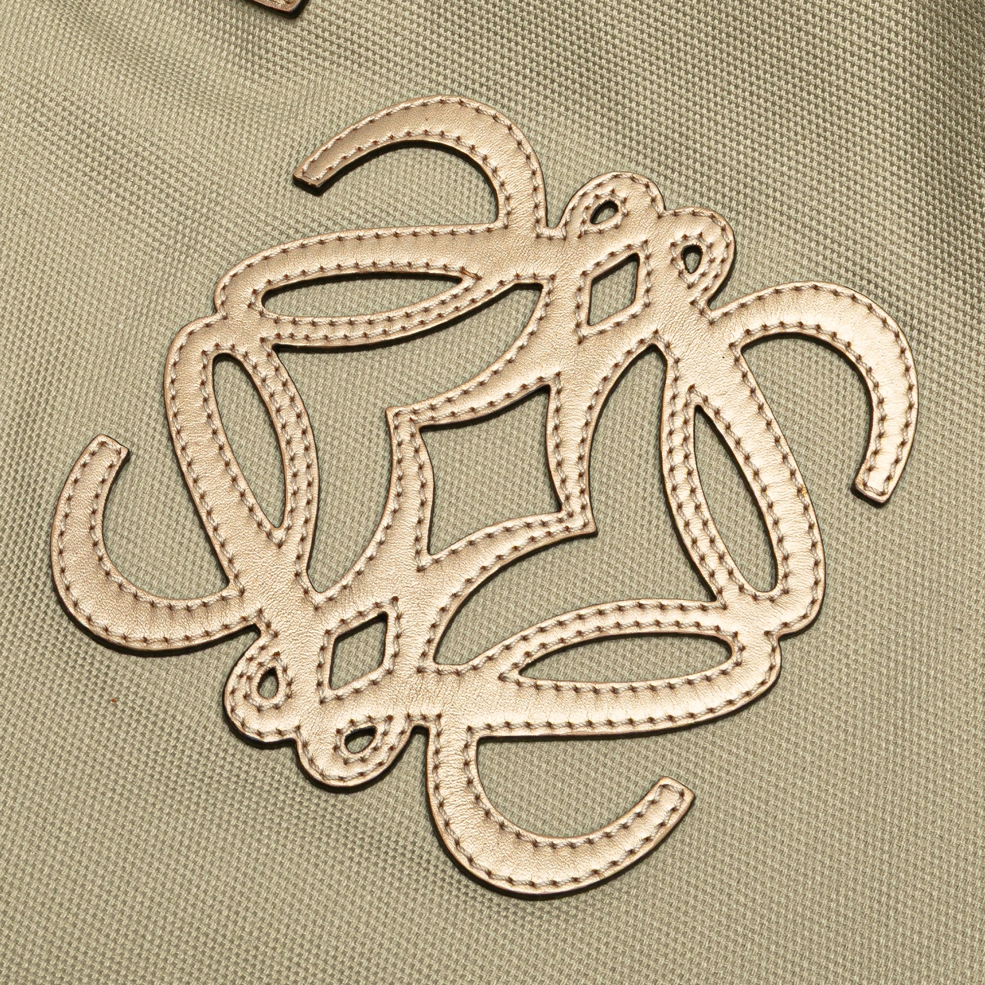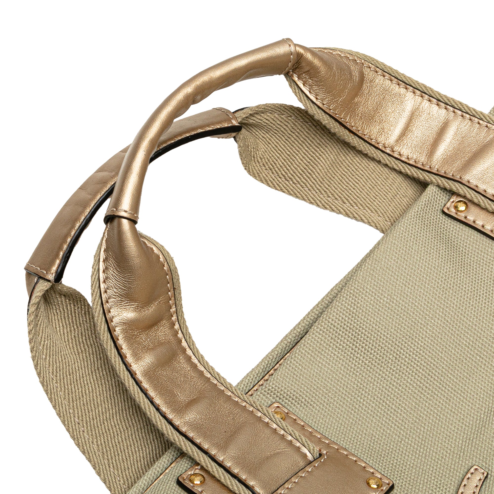 This satchel features a canvas body with leather trim, flat leather handles, a detachable flat strap, an open top, and interior zip and slip pockets. Retail Price: 1245.00