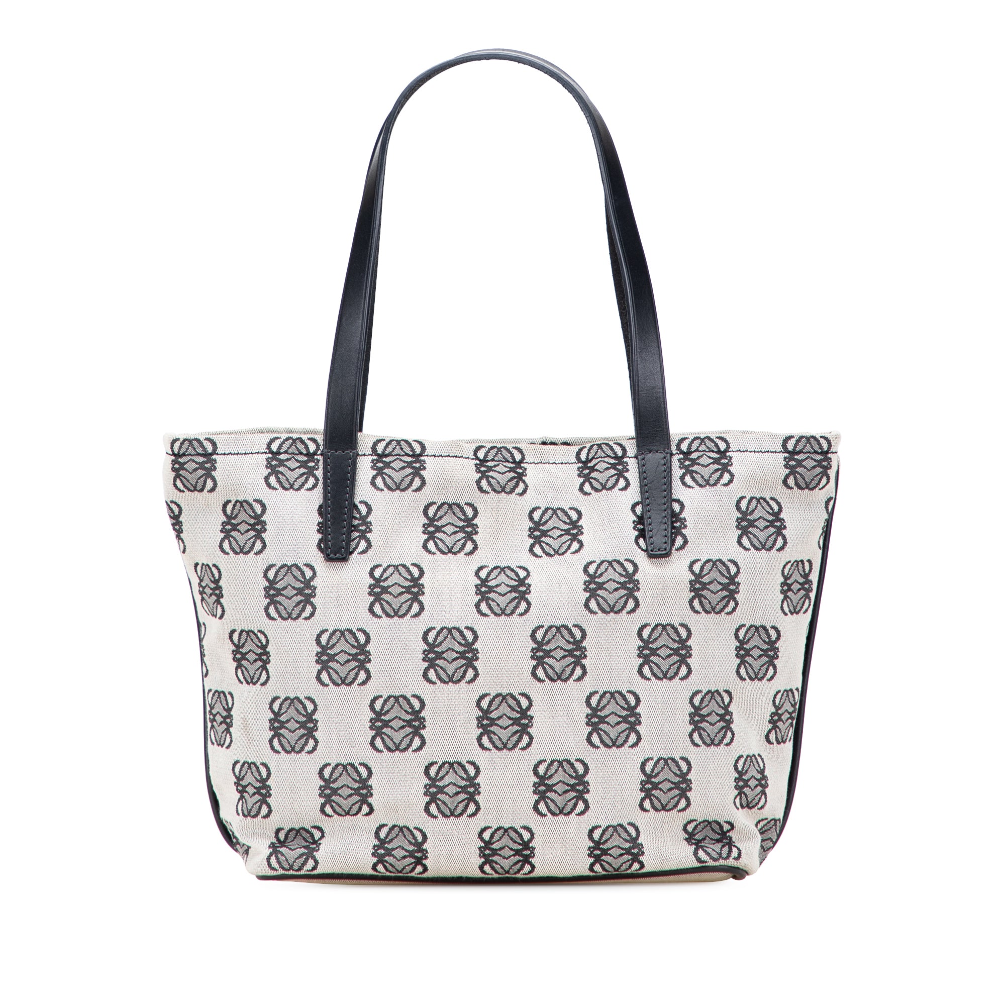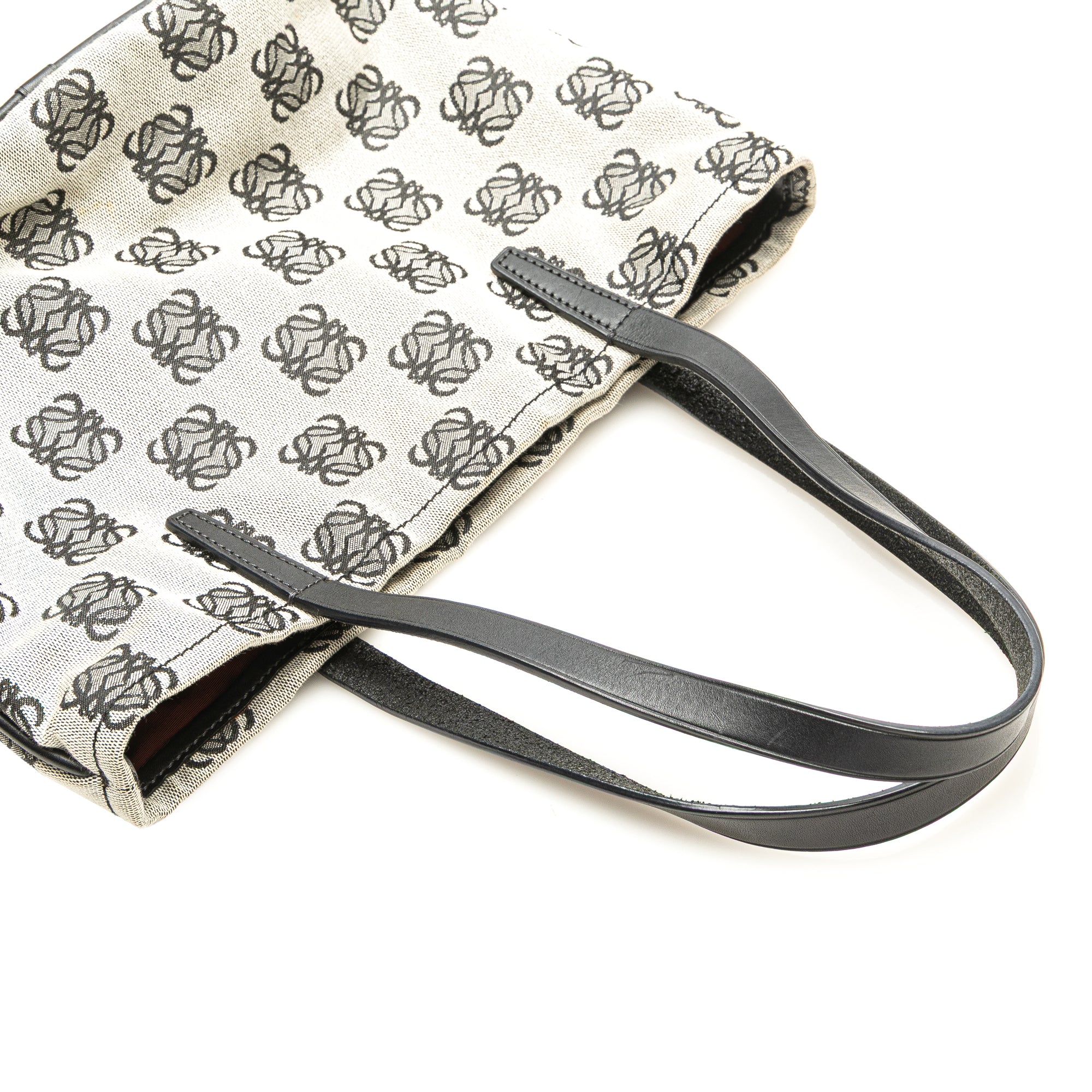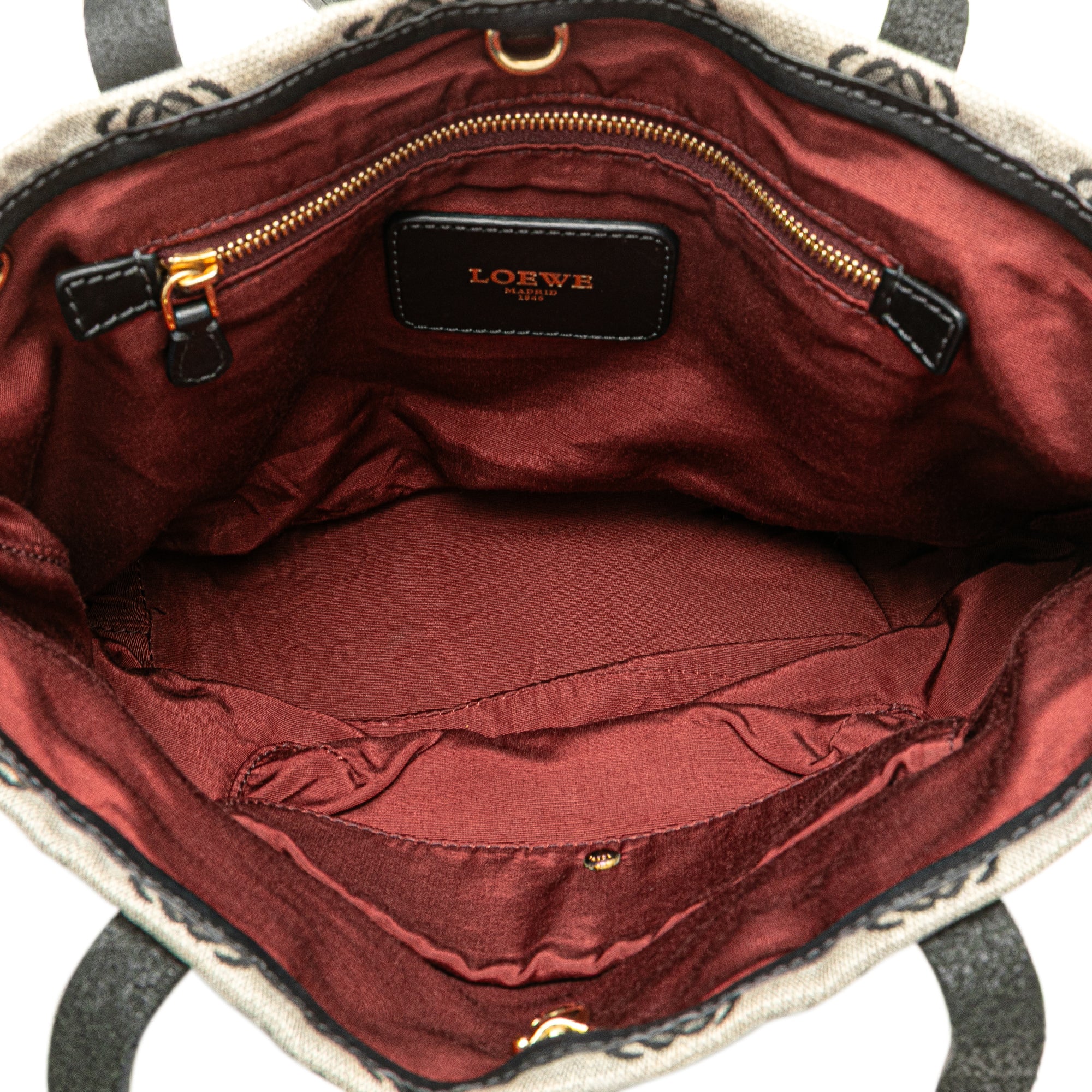 This tote features a canvas body with leather trim, flat leather handles, an open top with lobster clasp closure, and interior zip and slip pockets. Retail Price: 710.00