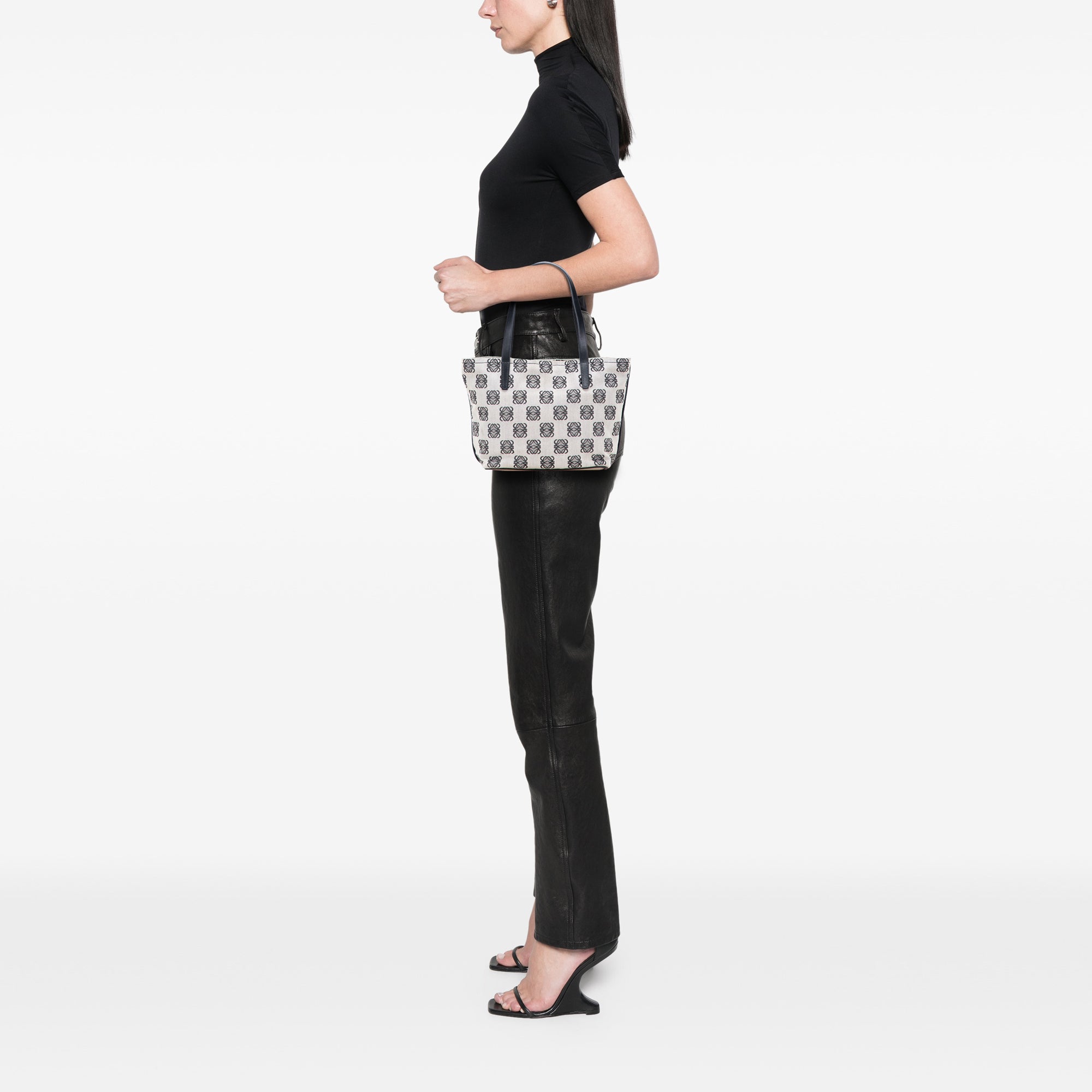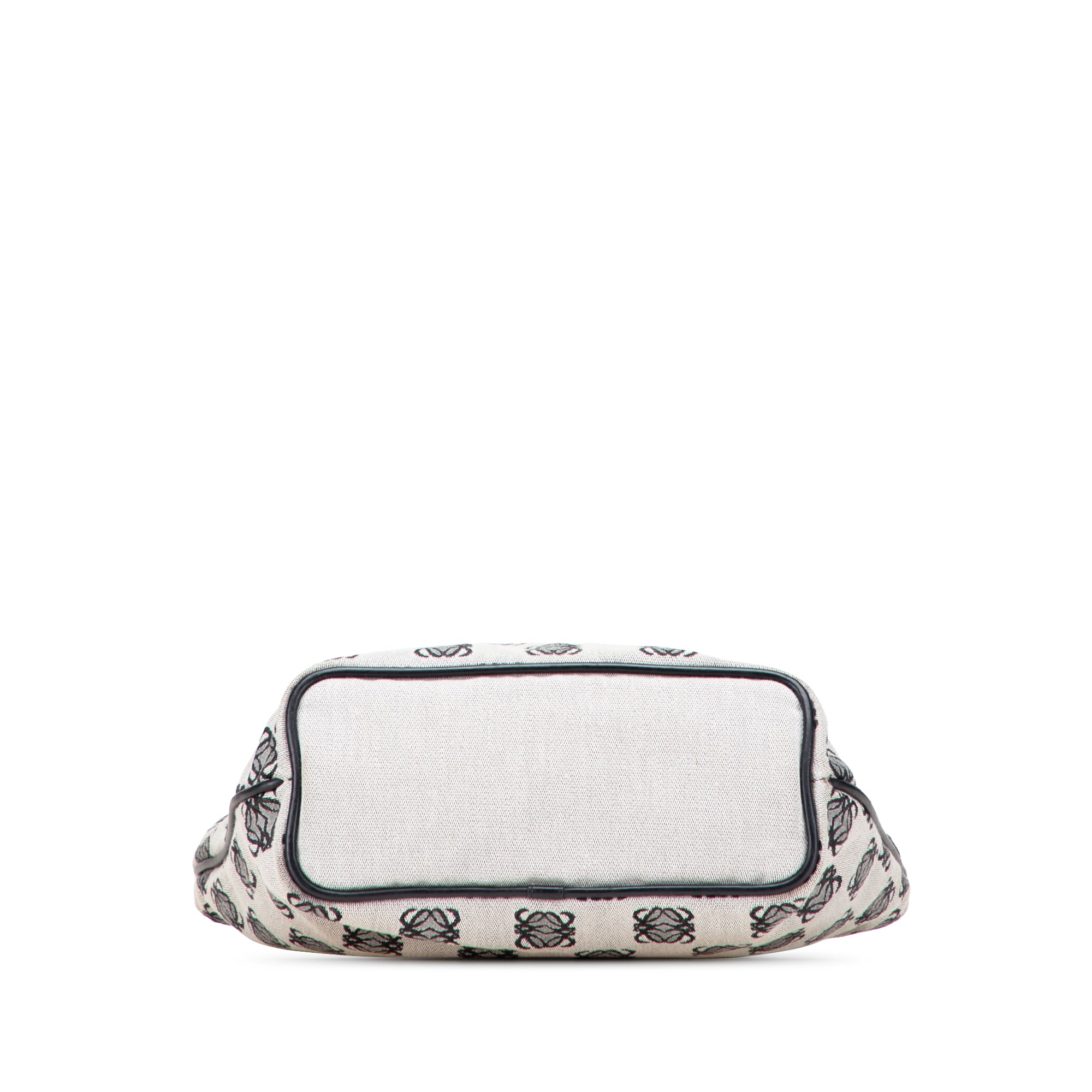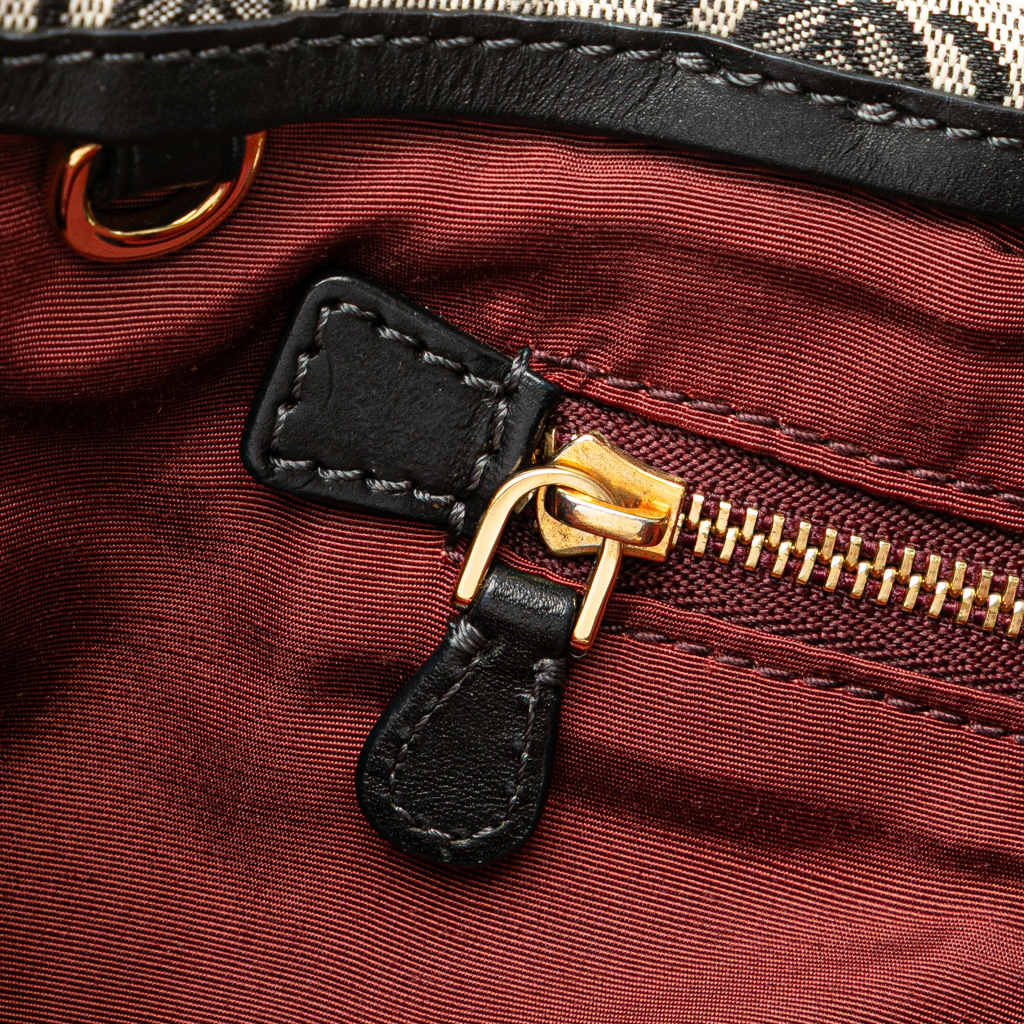 This tote features a canvas body with leather trim, flat leather handles, an open top with lobster clasp closure, and interior zip and slip pockets. Retail Price: 710.00