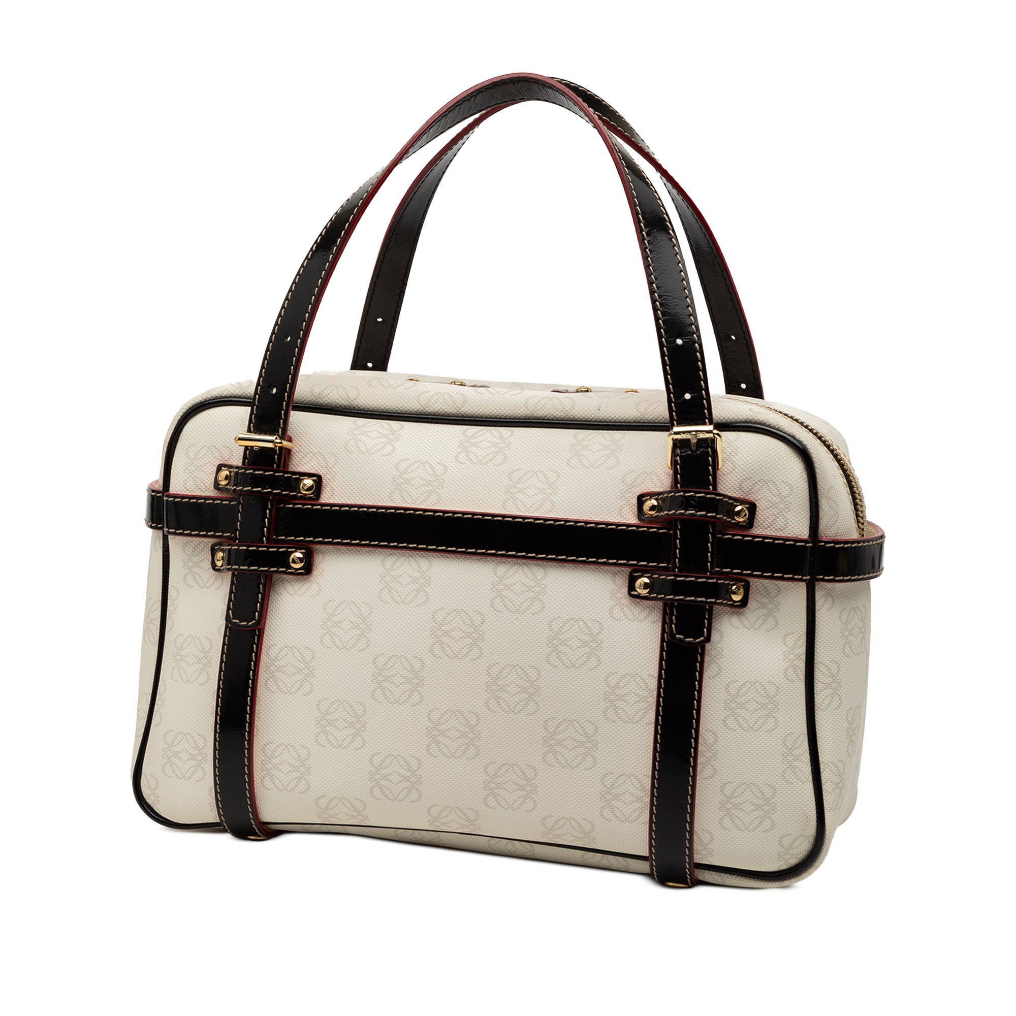 This handbag features a coated canvas body with leather trim, flat leather handles, a top zip closure, and interior slip pockets. Retail Price: 1500.00