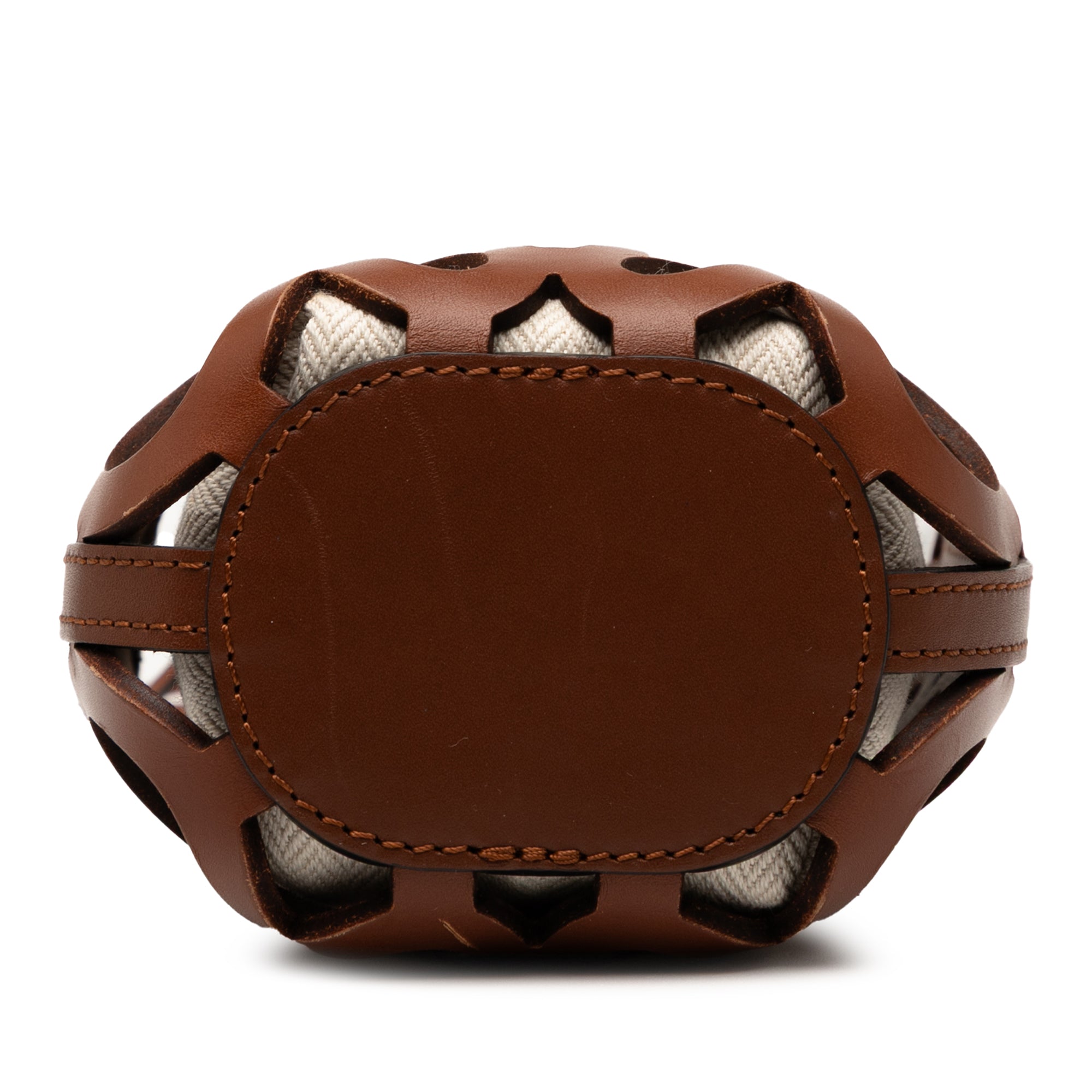 This crossbody bag features a cut-out calfskin leather body with a canvas pouch, a flat leather strap, and an open top with a drawstring closure. Retail Price: 1150.00